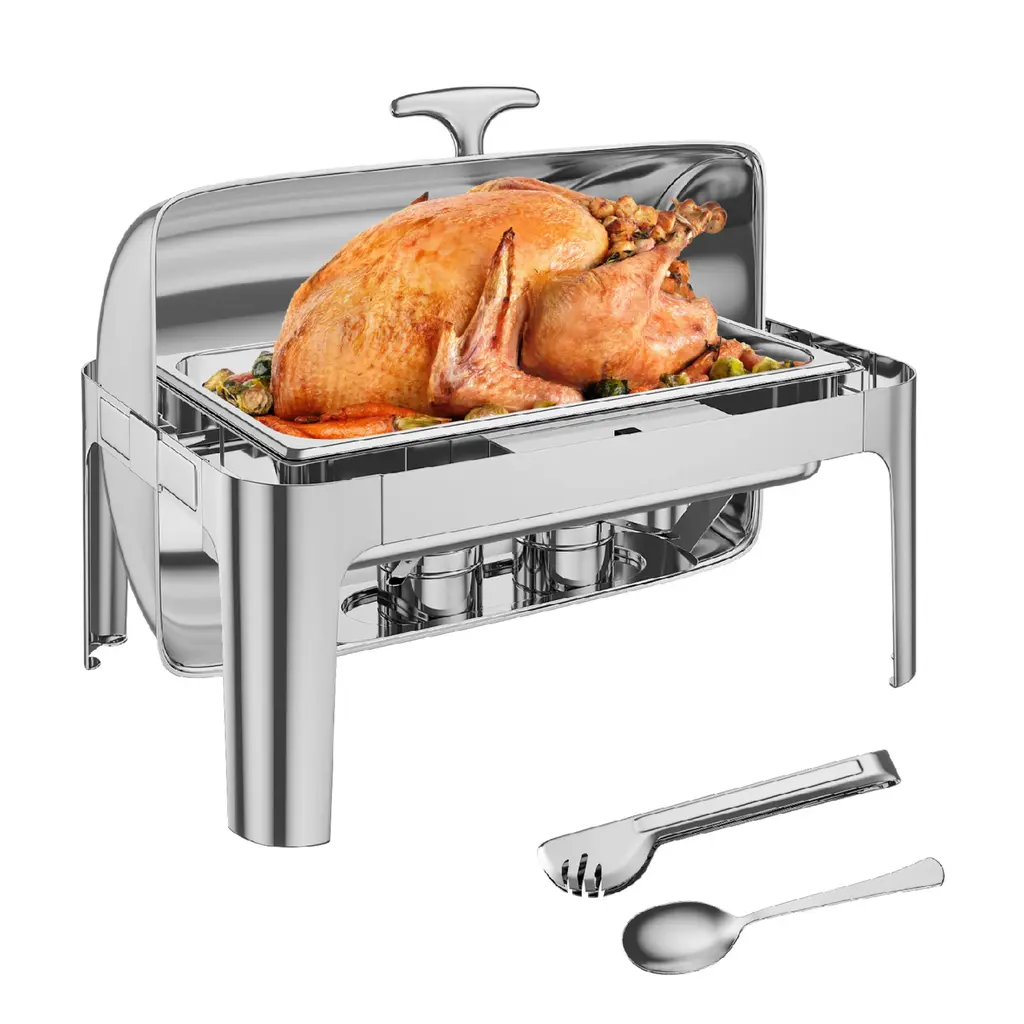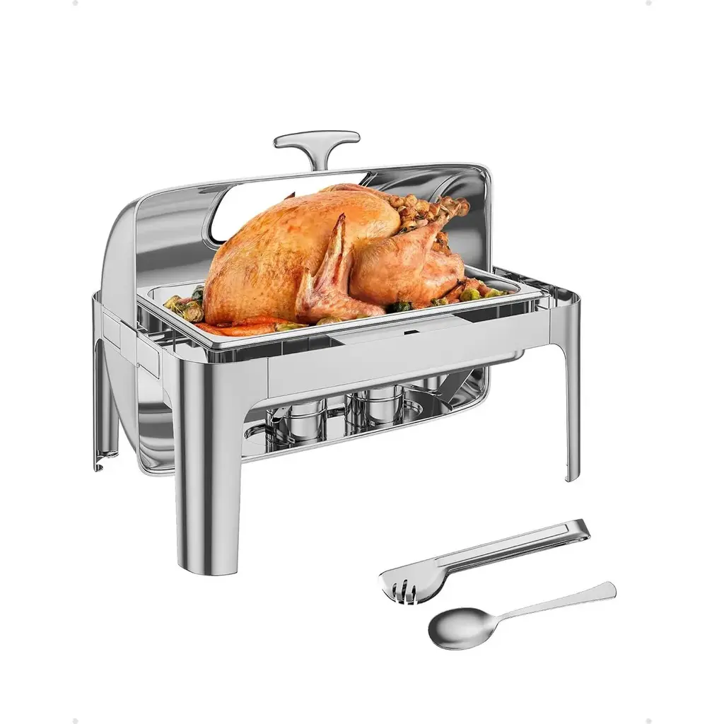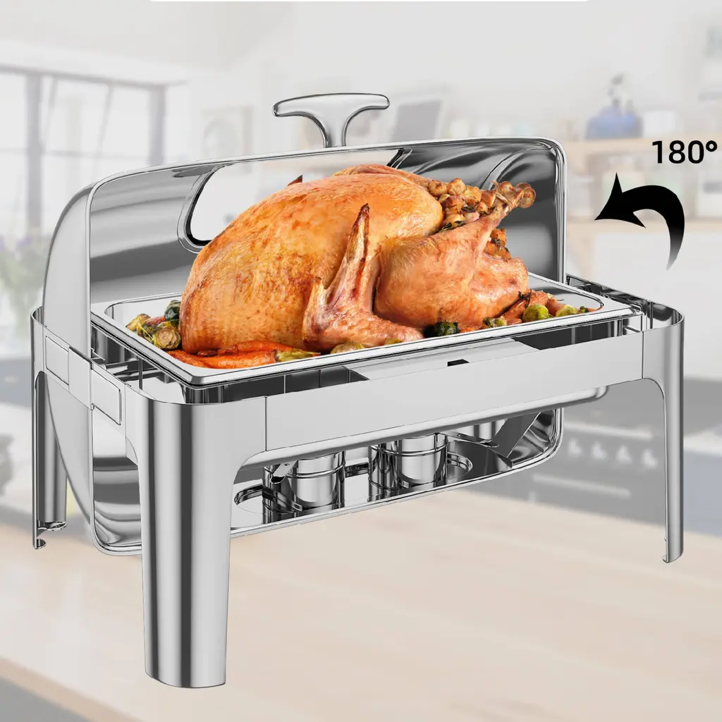 Superior Material: The roll top chafing dish buffet set is constructed entirely of high-quality stainless steel, ensuring durability and ease of cleaning.Temperature Control: Maintain the perfect temperatures of your dishes with the fuel holders, ensuring that your foods stay warm and fresh for your guests.Visual Appeal: The chafing dish buffet set features a clear window lid, allowing guests to view the dishes without lifting the cover and creating an attractive presentation.Versatile Usage: Ideal for restaurants, buffets, catering, schools, and corporate events, this chafing dish set adds a professional touch to any occasion.Effortless Cleaning: The stainless steel construction is resistant to stains and odors, making cleaning a breeze. The detachable pans can be cleaned separately for added convenience.