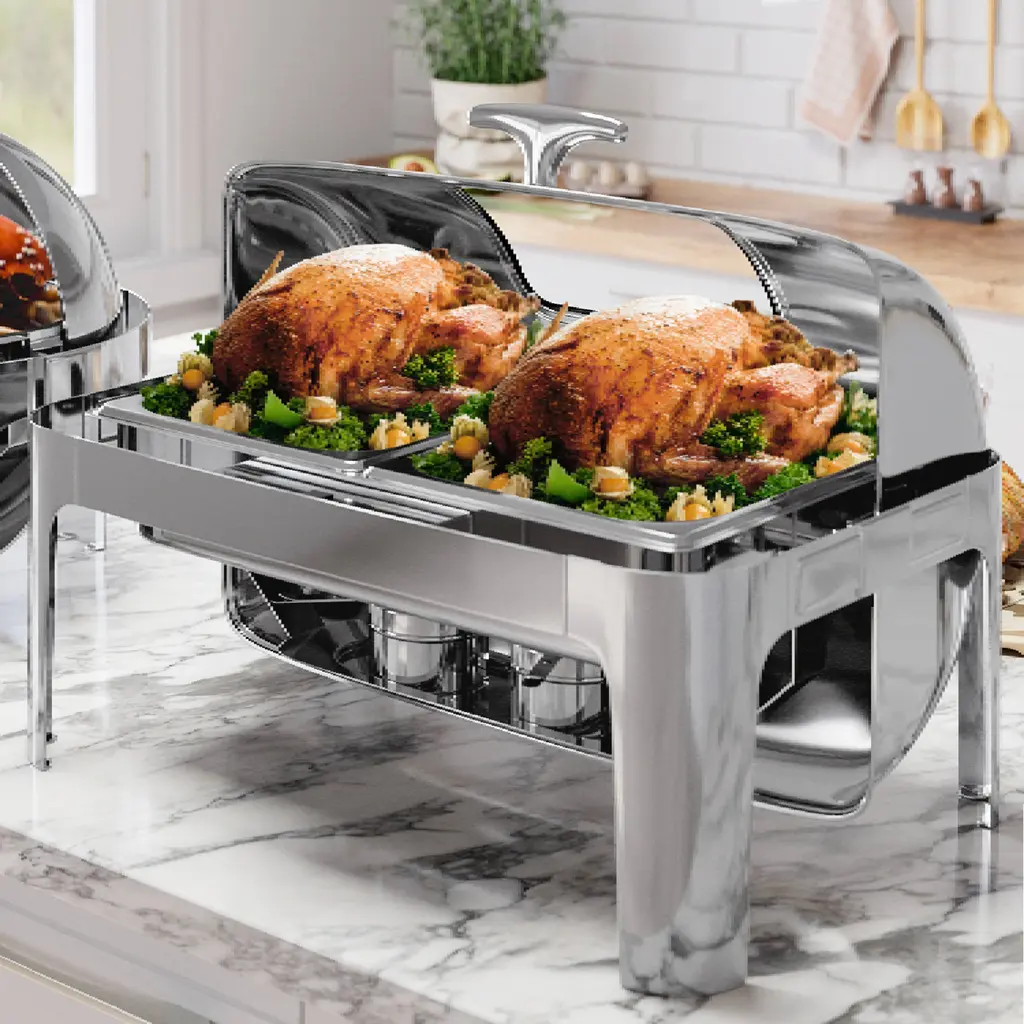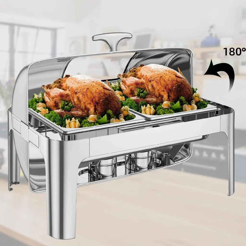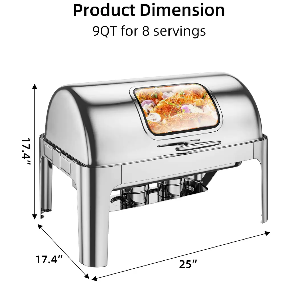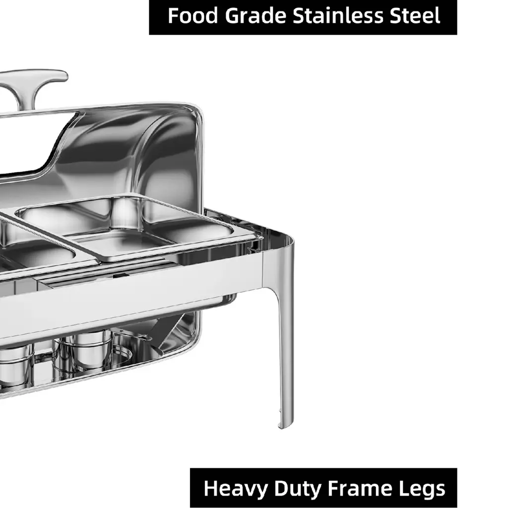 Superior Material: The roll top chafing dish buffet set is constructed entirely of high-quality stainless steel, ensuring durability and ease of cleaning.Temperature Control: Maintain the perfect temperatures of your dishes with the fuel holders, ensuring that your foods stay warm and fresh for your guests.Visual Appeal: The chafing dish buffet set features a clear window lid, allowing guests to view the dishes without lifting the cover and creating an attractive presentation.Versatile Usage: Ideal for restaurants, buffets, catering, schools, and corporate events, this chafing dish set adds a professional touch to any occasion.Effortless Cleaning: The stainless steel construction is resistant to stains and odors, making cleaning a breeze. The detachable pans can be cleaned separately for added convenience.