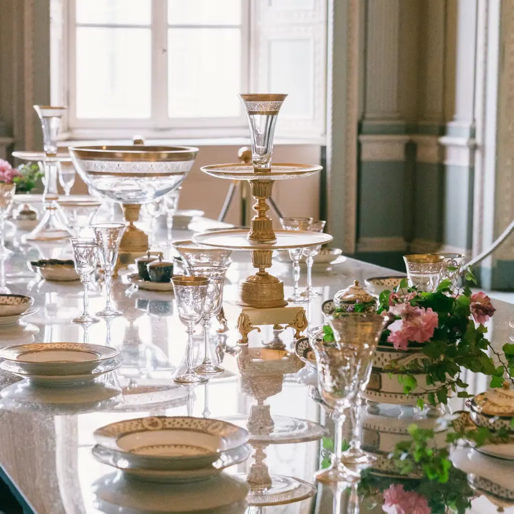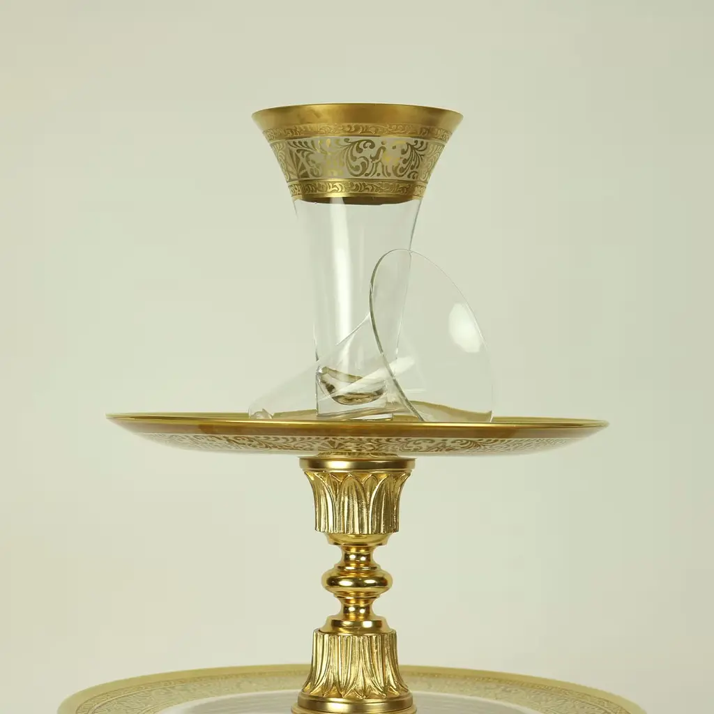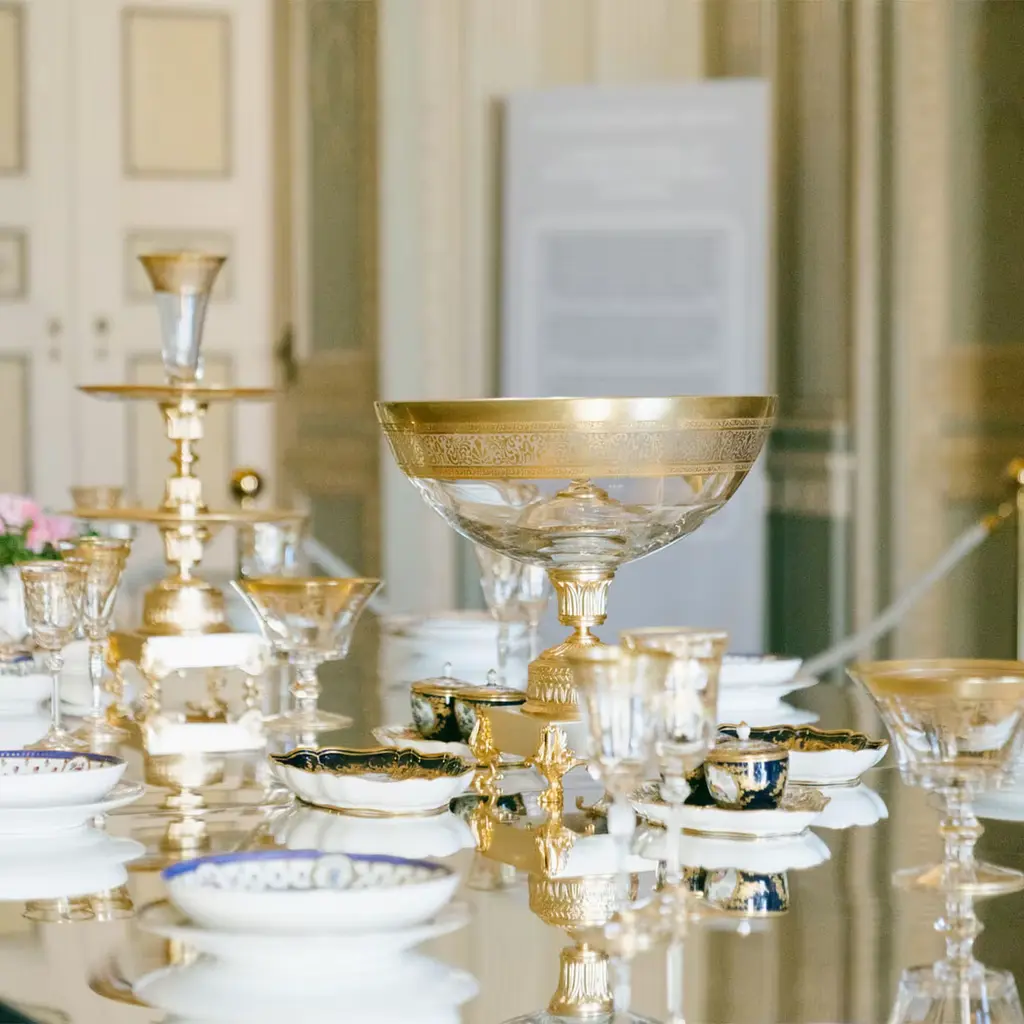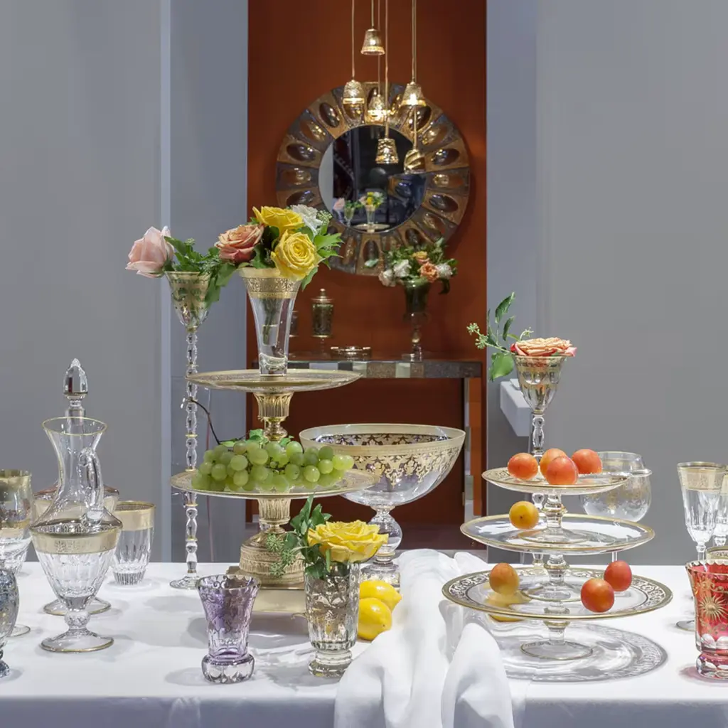 Part of the neo-classical style Rome Collection of timeless sophistication, this decorative cake stand exudes exceptional refinement and opulence. Ideally complementing a luxurious and elegant interior of both private or public and contract nature, it is handcrafted of mouth-blown glass enhanced with pure gold details, and mounted on gold-finished bronze.