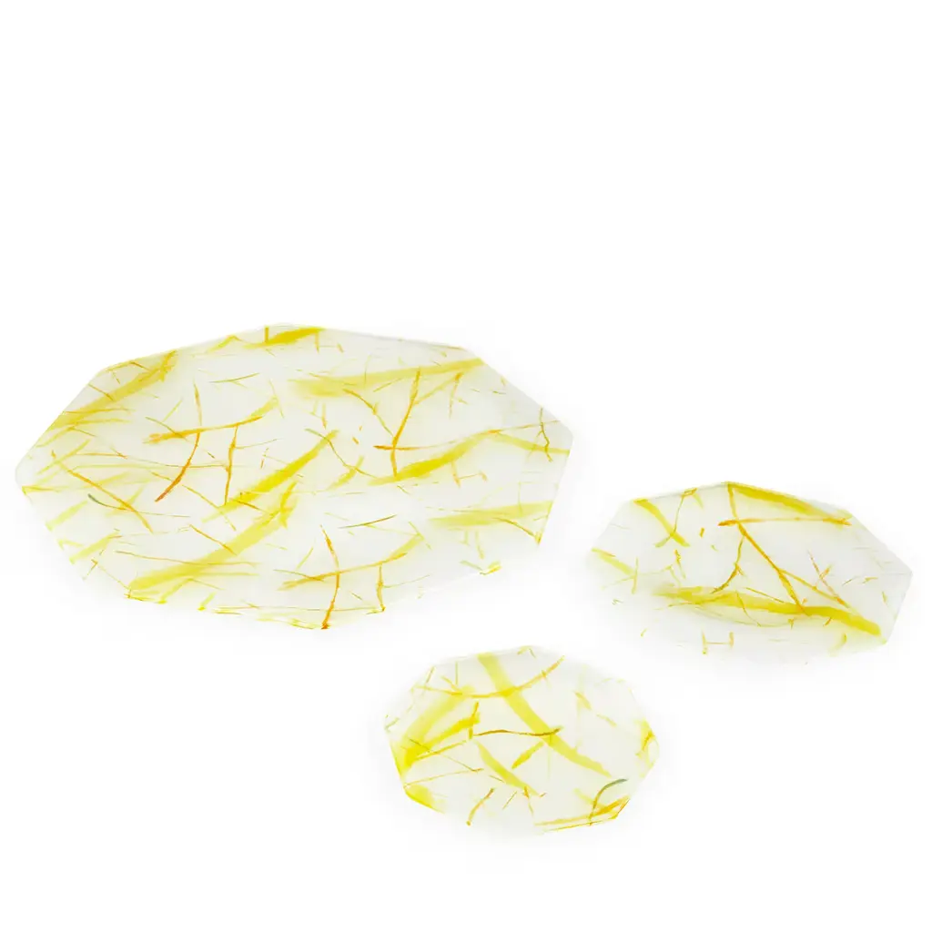 The octagonal shape is asymmetrical with a larger brim for a secure grip. The hollow base is off-center for perfect balance. The crystal-clear material used, methacrylate, is fused together with printed and gold hand-painted polyester organza, thermo-formed and finished by hand. Food certified, impact resistant, dishwasher safe, stackable, handy and of great impact.