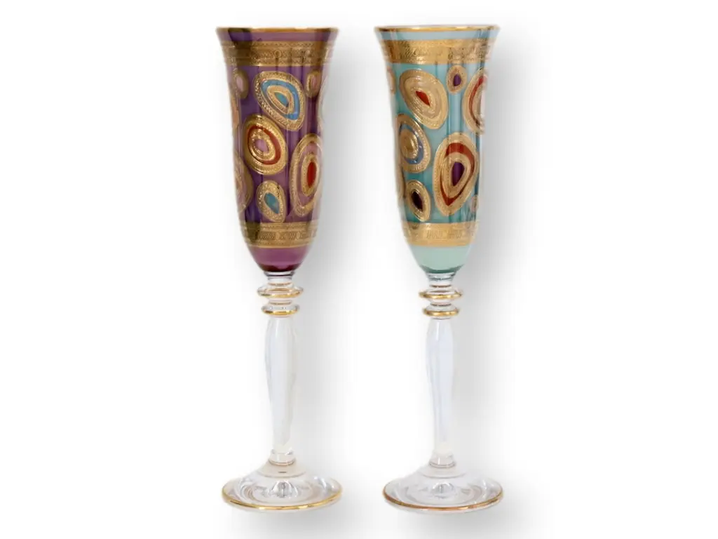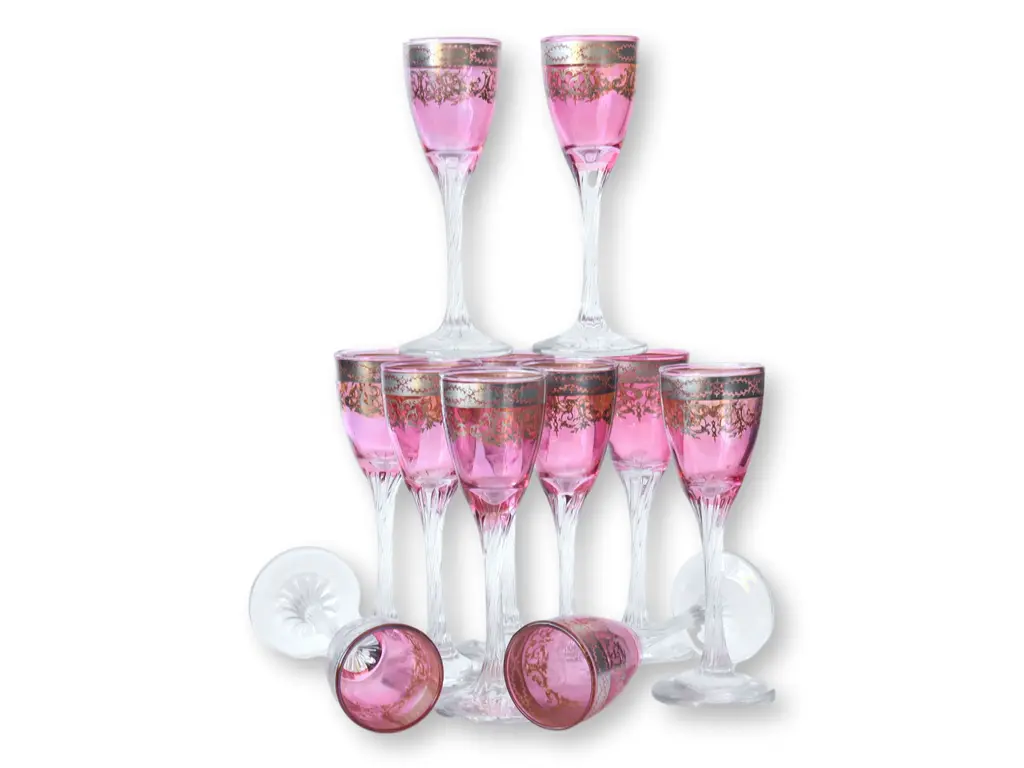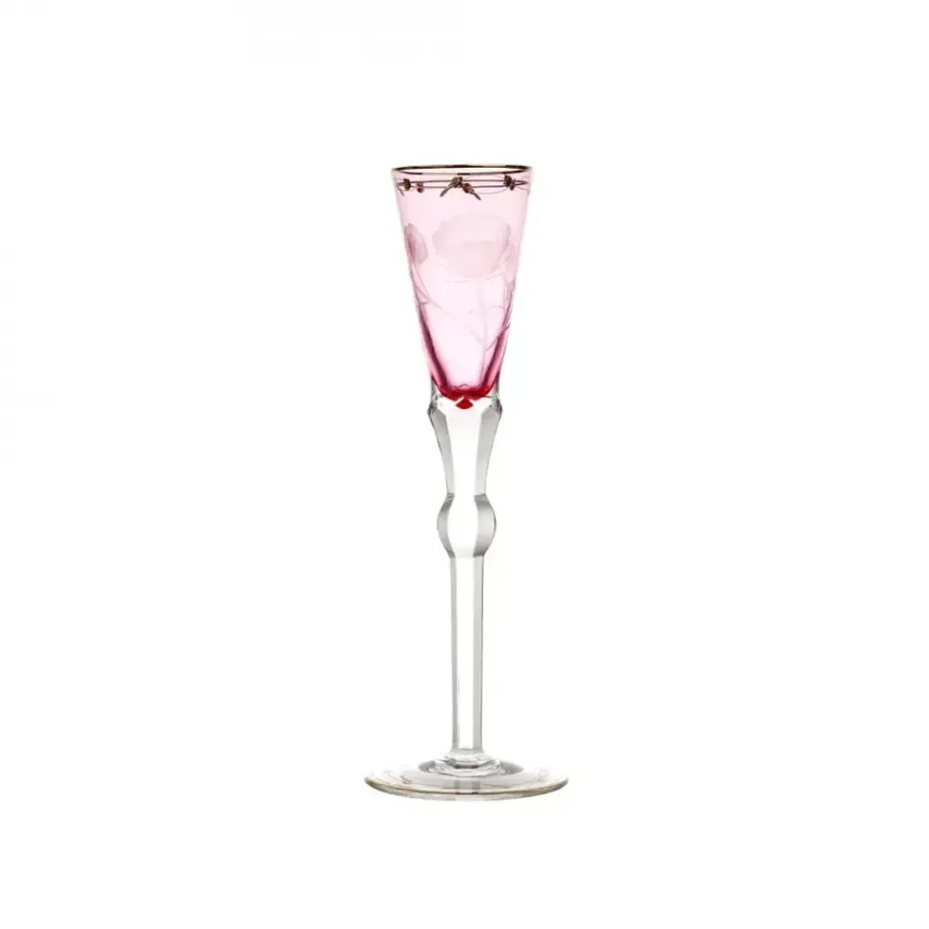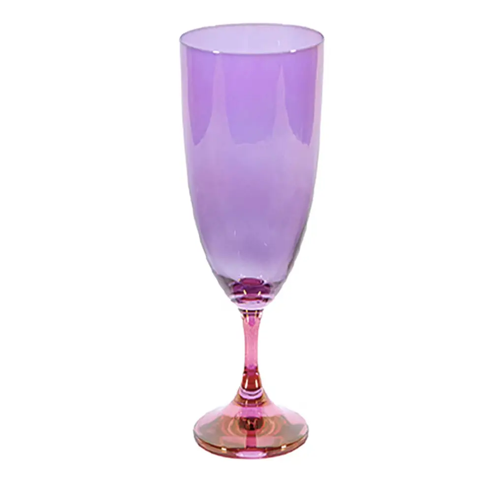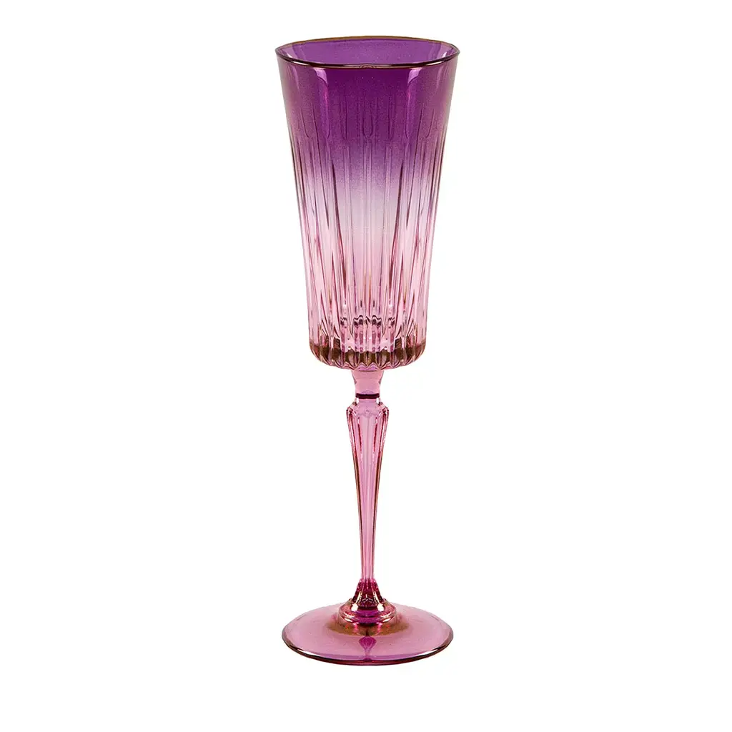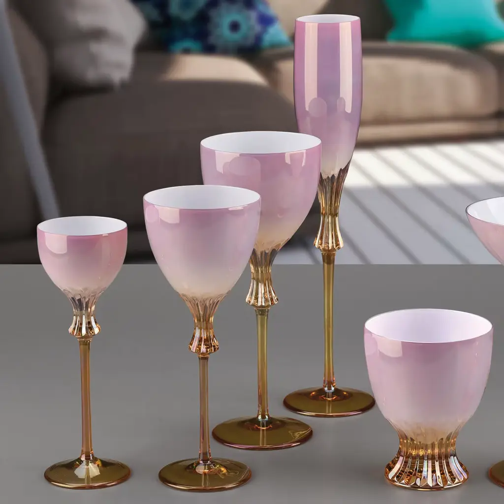 This sleek set features two water glasses, two wine glasses, and two flutes to add a lavish and graceful romantic accent to an elegant dining table. Showcasing mesmerizing pink hues fading to an amber-colored stem and base, each piece is deftly handcrafted of crystal and decorated by hand in a combination of smooth and grooved textures.