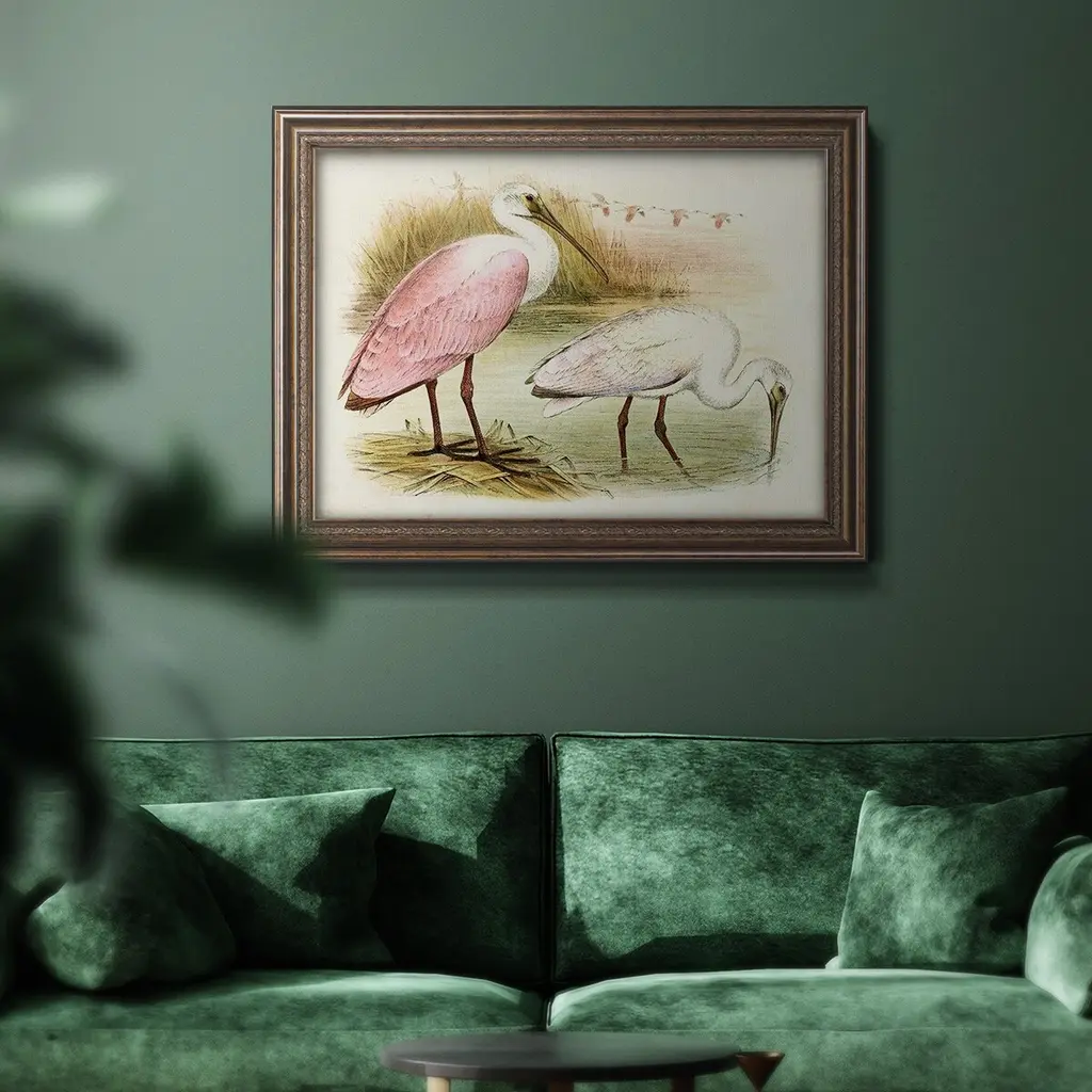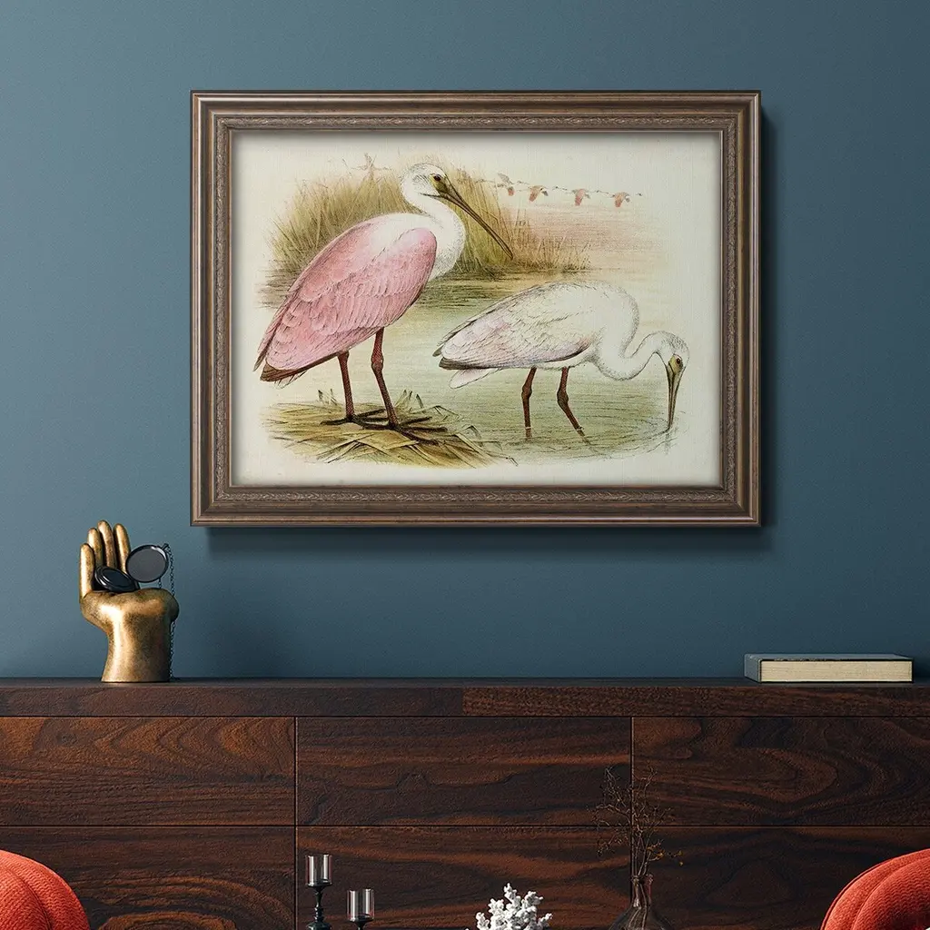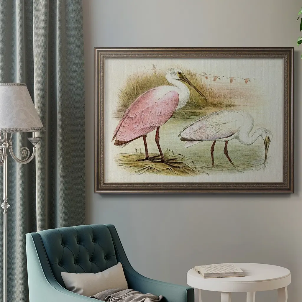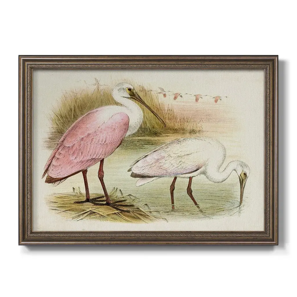 Roseate Spoonbills I Premium Framed Canvas- Ready to Hang A Premium Framed Canvas created to last. Framed in distressed wood and available in an array of sizes and colors Featuring a beveled a solid wood stretcher bar, each piece comes ready to hand 3 SIZES AVAILABLE 16''X20'' - Overall Size 18'X27'' - Overall Size 24''x36'' - Overall Size Each piece is made to order. Each piece comes with hanging hardware. Made in the USA Ready to Hang Giclee Paper Print Acrylic Glass Beveled Matt Board