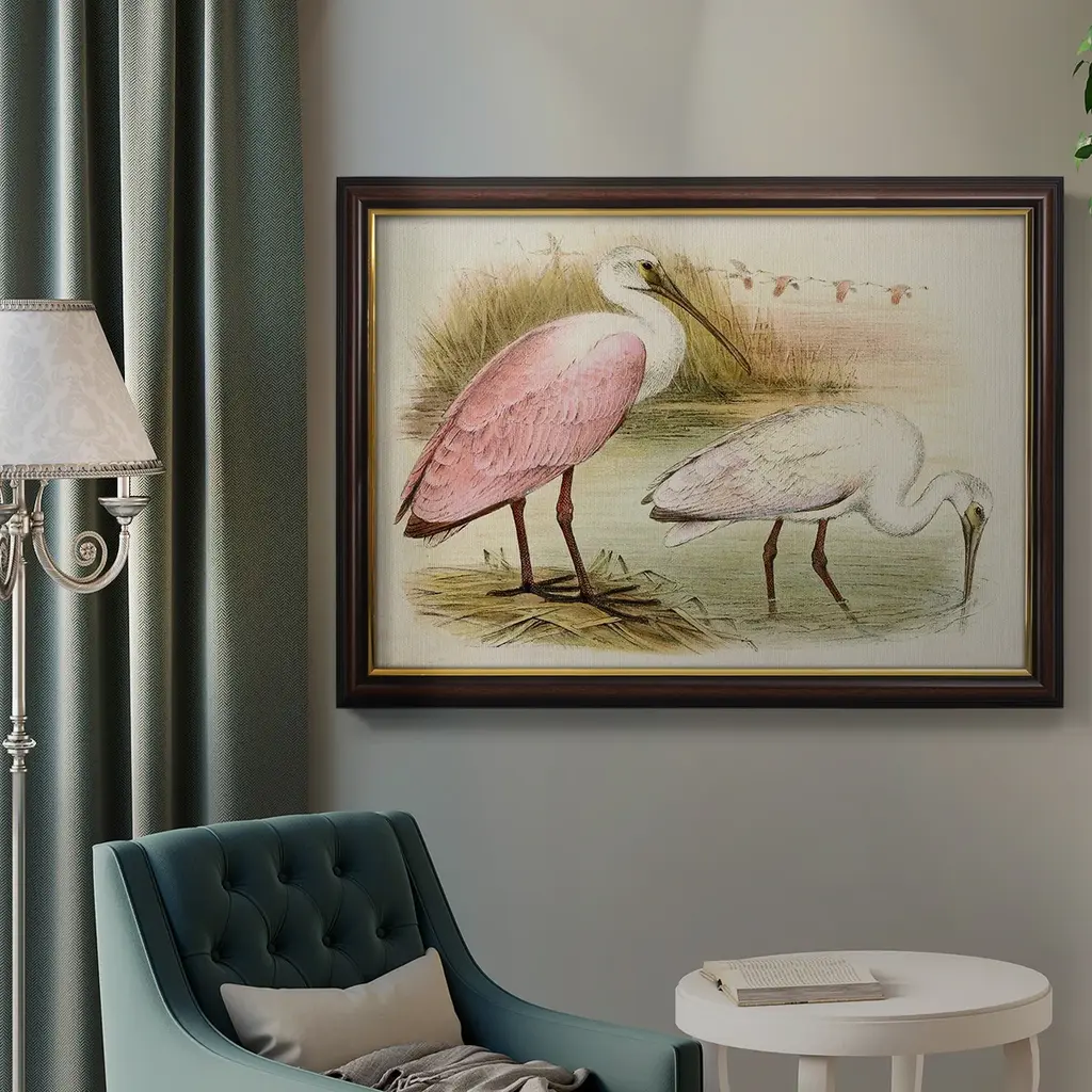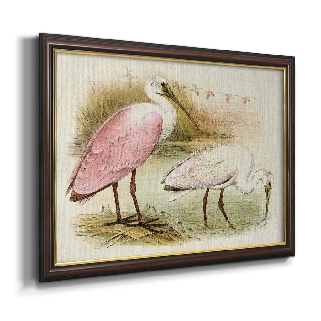 Roseate Spoonbills I Premium Framed Canvas- Ready to Hang A Premium Framed Canvas created to last. Framed in distressed wood and available in an array of sizes and colors Featuring a beveled a solid wood stretcher bar, each piece comes ready to hand 3 SIZES AVAILABLE 16''X20'' - Overall Size 18'X27'' - Overall Size 24''x36'' - Overall Size Each piece is made to order. Each piece comes with hanging hardware. Made in the USA Ready to Hang Giclee Paper Print Acrylic Glass Beveled Matt Board