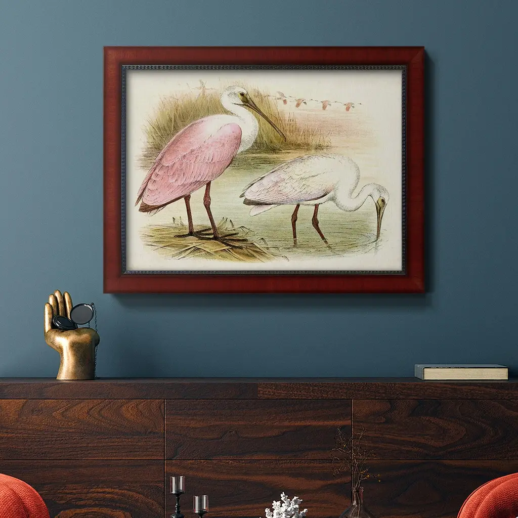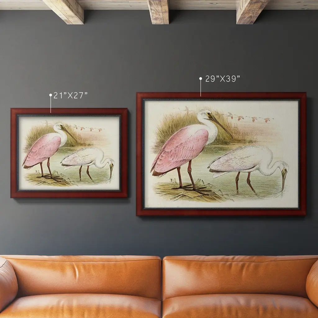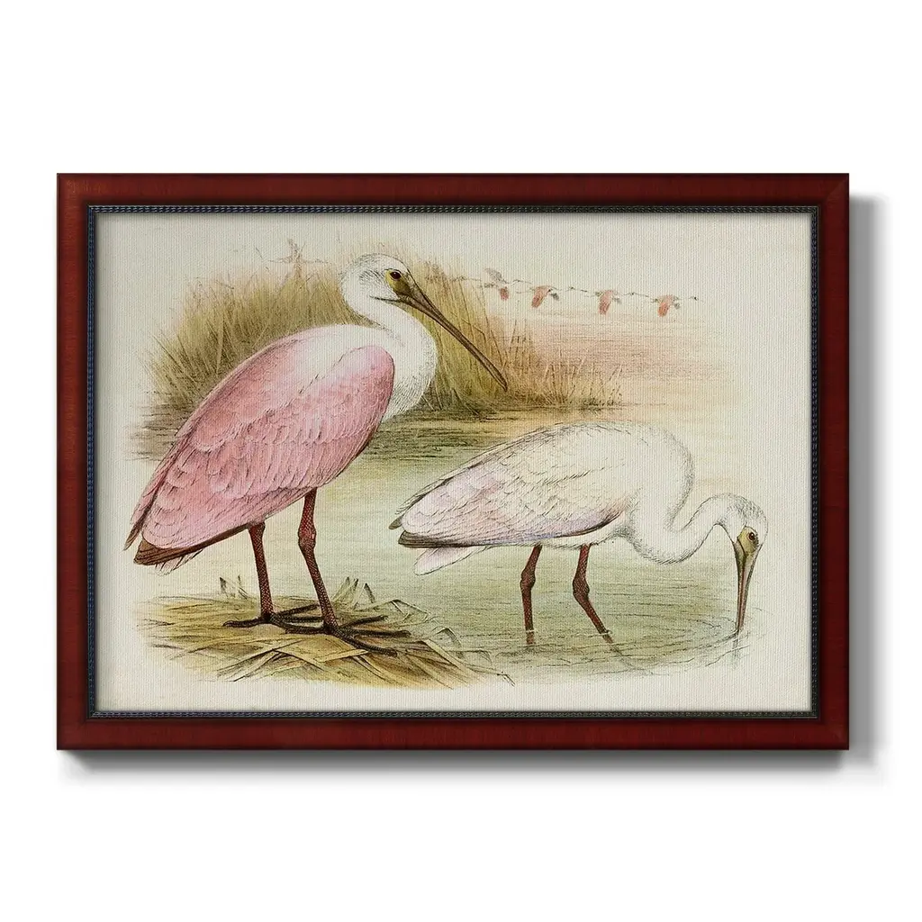Roseate Spoonbills I Premium Framed Canvas- Ready to Hang A Premium Framed Canvas created to last. Framed in distressed wood and available in an array of sizes and colors Featuring a beveled a solid wood stretcher bar, each piece comes ready to hand 3 SIZES AVAILABLE 16''X20'' - Overall Size 18'X27'' - Overall Size 24''x36'' - Overall Size Each piece is made to order. Each piece comes with hanging hardware. Made in the USA Ready to Hang Giclee Paper Print Acrylic Glass Beveled Matt Board