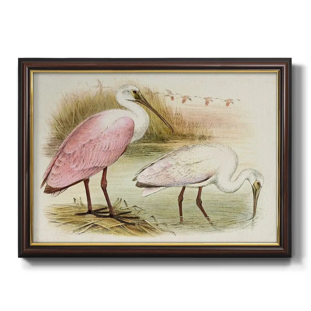 Roseate Spoonbills I Premium Framed Canvas- Ready to Hang A Premium Framed Canvas created to last. Framed in distressed wood and available in an array of sizes and colors Featuring a beveled a solid wood stretcher bar, each piece comes ready to hand 3 SIZES AVAILABLE 16''X20'' - Overall Size 18'X27'' - Overall Size 24''x36'' - Overall Size Each piece is made to order. Each piece comes with hanging hardware. Made in the USA Ready to Hang Giclee Paper Print Acrylic Glass Beveled Matt Board