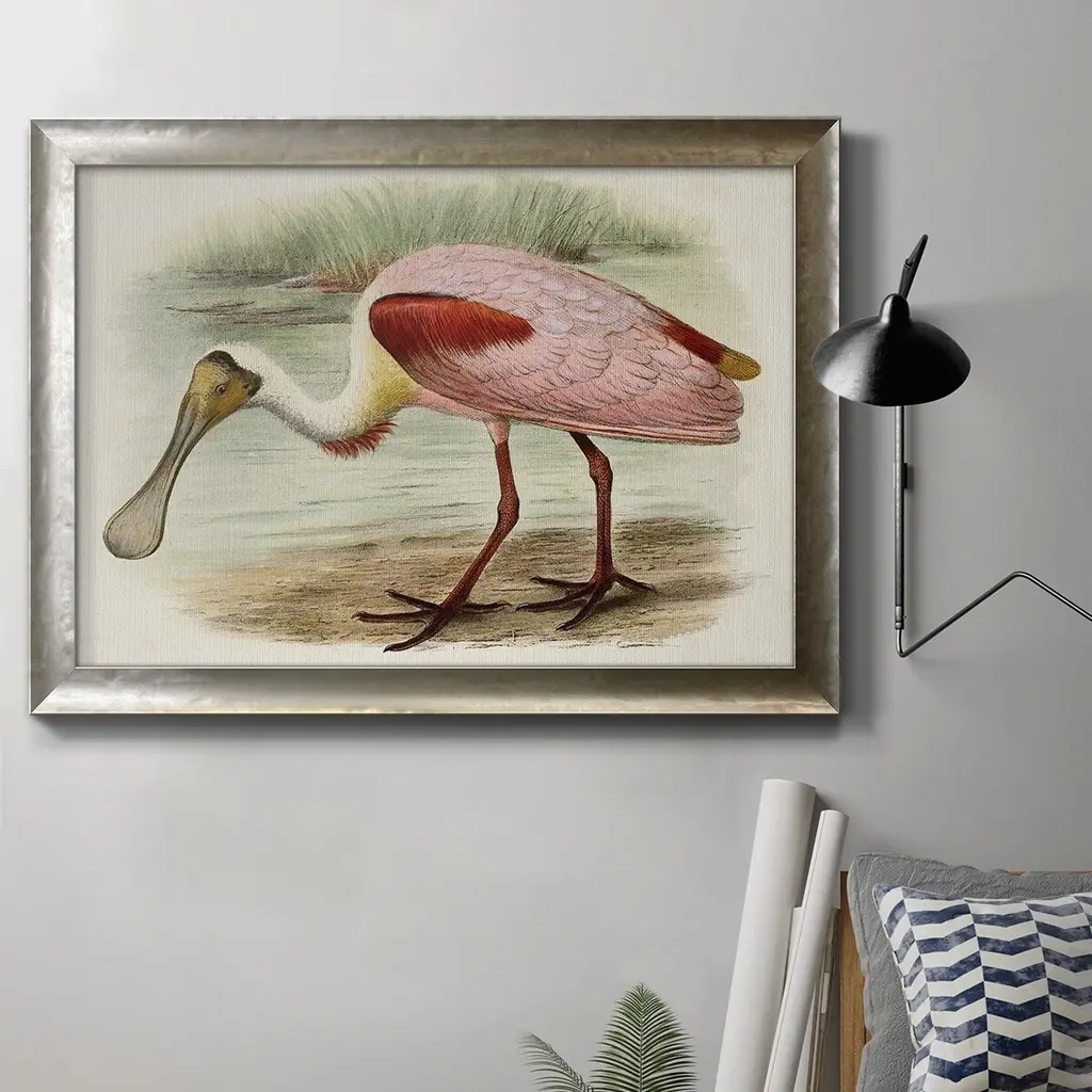 Roseate Spoonbills II Premium Framed Canvas- Ready to Hang A Premium Framed Canvas created to last. Framed in distressed wood and available in an array of sizes and colors Featuring a beveled a solid wood stretcher bar, each piece comes ready to hand 3 SIZES AVAILABLE 16''X20'' - Overall Size 18'X27'' - Overall Size 24''x36'' - Overall Size Each piece is made to order. Each piece comes with hanging hardware. Made in the USA Ready to Hang Giclee Paper Print Acrylic Glass Beveled Matt Board