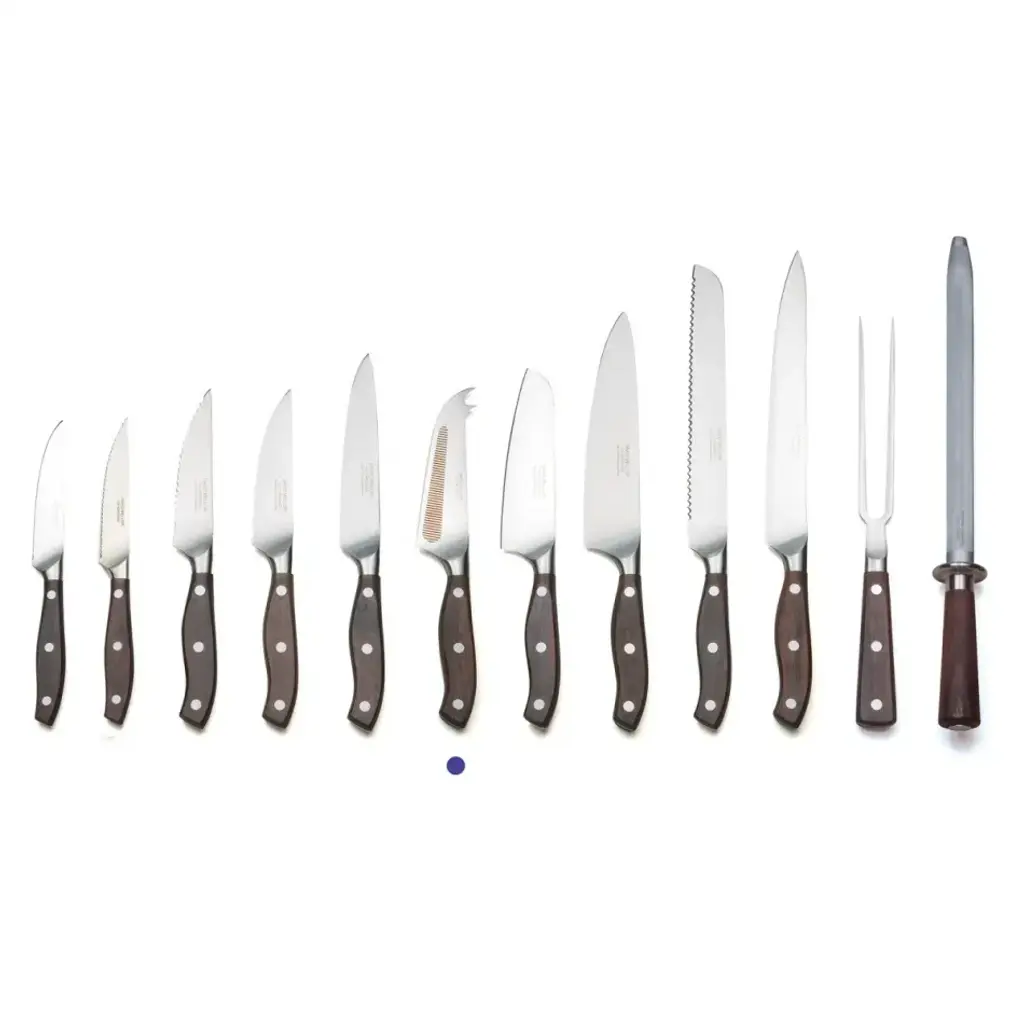 Our top of the range knives, designed by Corin Mellor and newly introduced after 3 years’ development. The sinuously curving handles are made in Indian rosewood, the traditional material favoured by culinary experts. These are carefully hand finished and wonderful to use. Knife blades exploit the latest techniques in steel casting to arrive at the beautifully curved bolster. Blades are precision ground and glazed to give a specially bright finish. Drawing on the David Mellor expertise in metalwork these are amongst the world’s finest knives.