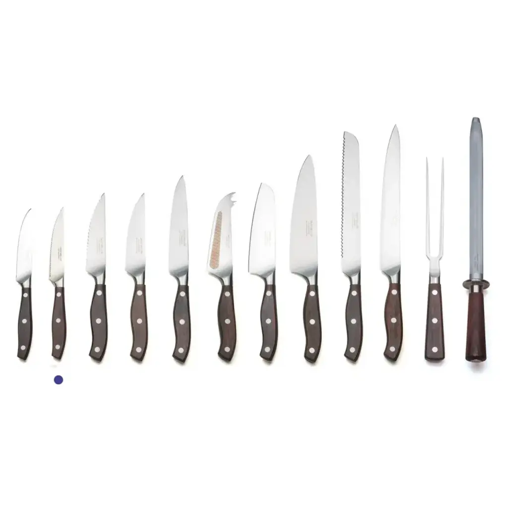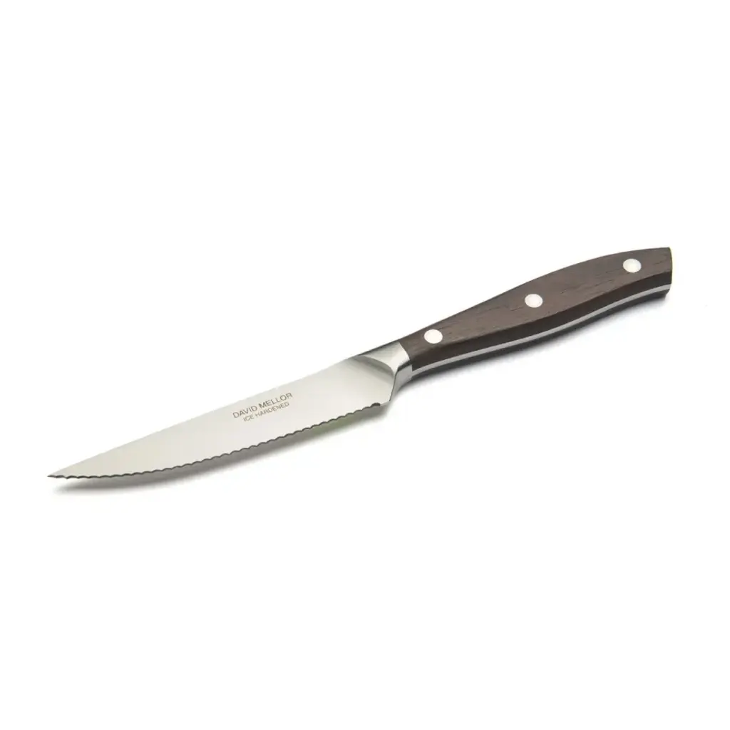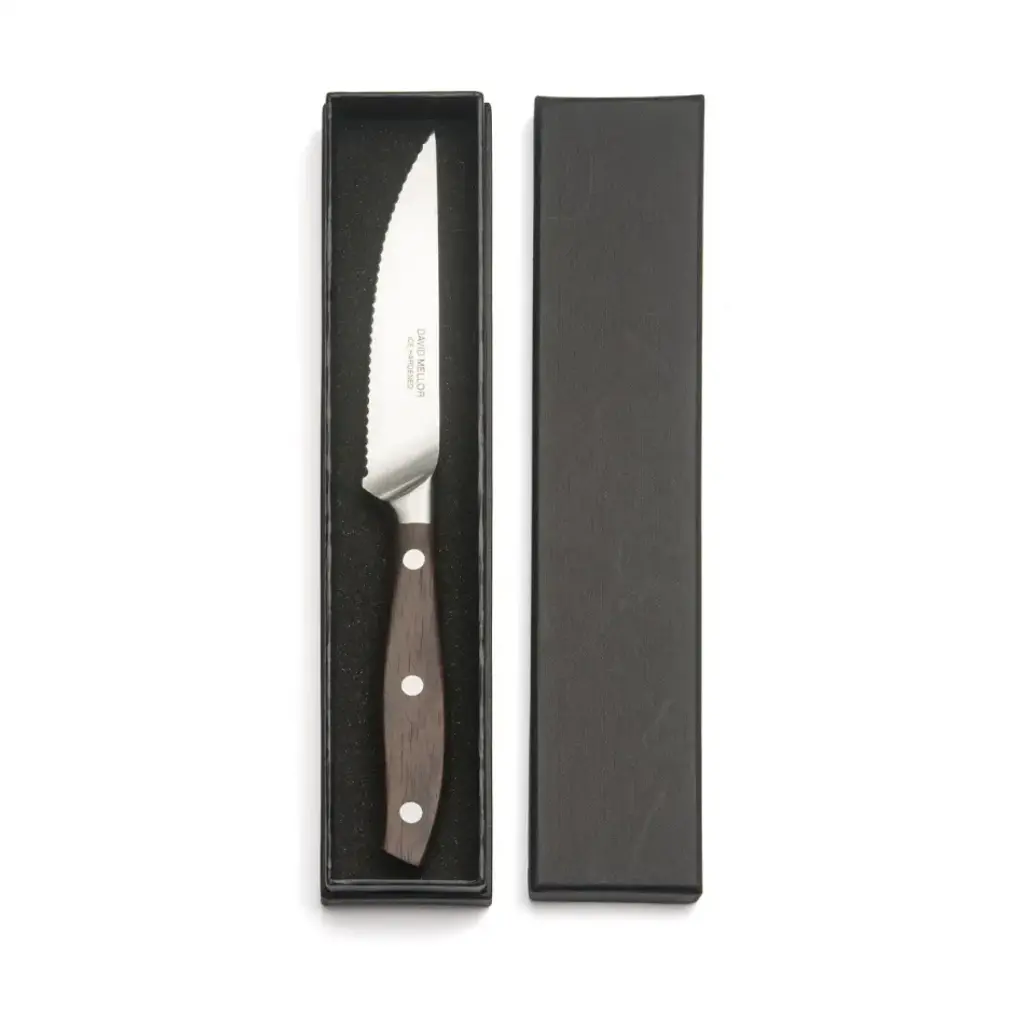 Our top of the range knives, designed by Corin Mellor and newly introduced after 3 years’ development. The sinuously curving handles are made in Indian rosewood, the traditional material favoured by culinary experts. These are carefully hand finished and wonderful to use. Knife blades exploit the latest techniques in steel casting to arrive at the beautifully curved bolster. Blades are precision ground and glazed to give a specially bright finish. Drawing on the David Mellor expertise in metalwork these are amongst the world’s finest knives. Also available as a boxed steak knife set.
