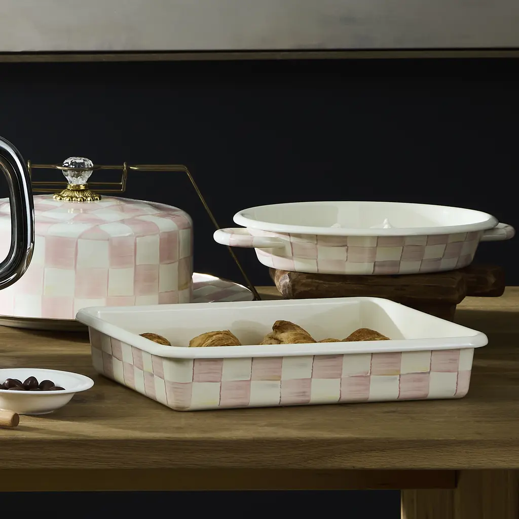 Bake up something delicious, like your signature scalloped potatoes, in our Rosy Check Medium Oval Gratin Dish. The comfort food of kitchenware, our most popular pattern is casual and cozy, with a beautiful blush-hued palette woven through the glossy, hand-painted checks.