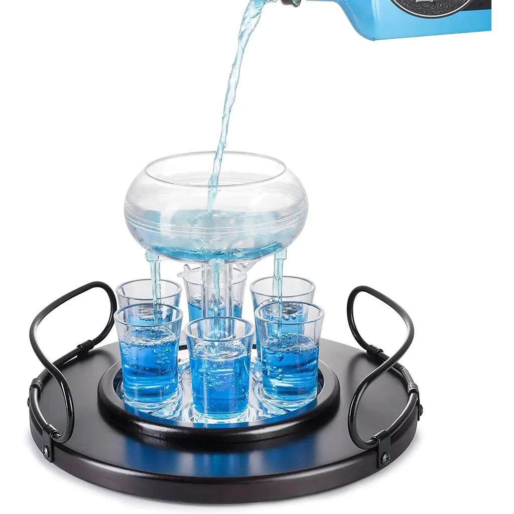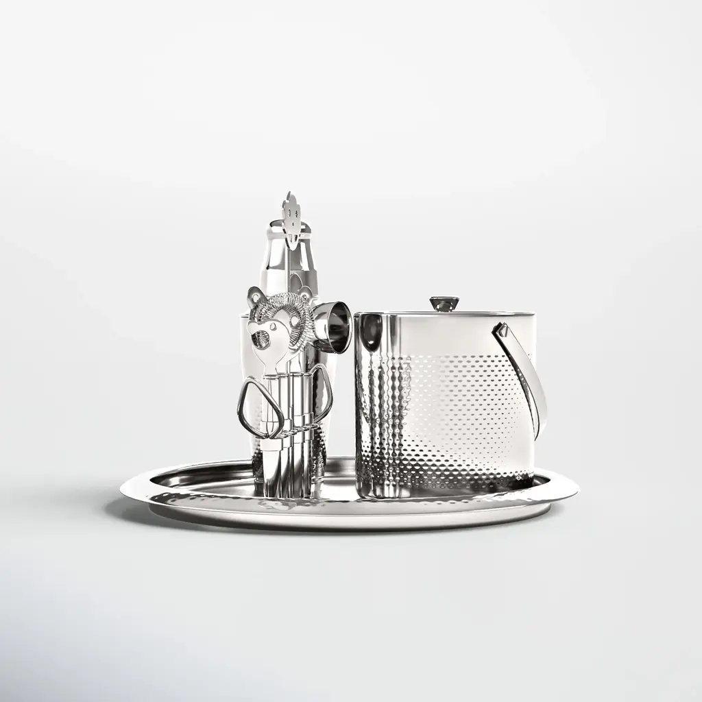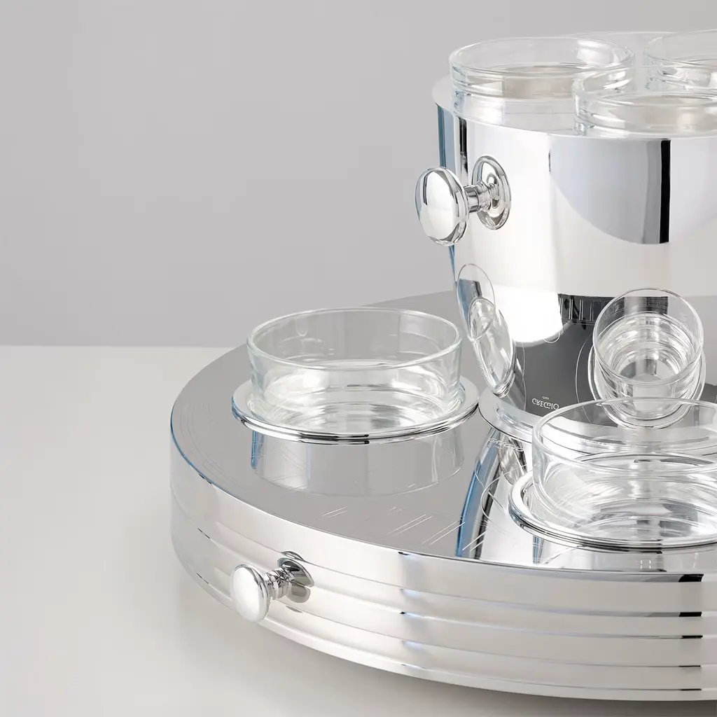 A superb design for serving exclusive delicacies, this caviar tasting set will be a refined addition to silverware collections, whether in private or hospitality settings, enhancing the pleasure of special dinners and toasts. It features an elegant rotating base adorned with delicate geometric engravings, multiple compartments, a large upper bowl for ice, and three tasting cups. This set allows you to effortlessly elevate your hosting experience in many creative ways. The set is made of brass and finished with a sparkling silver plating. Dimensions of the components: Internal size of the four glass cups: Ø 8 cm x h 4.5 cm. Bucket-shaped bowl: Ø 21 cm x h 13 cm Upper cups on the rack Ø 7.5 cm x h 3.5 cm. 7.7 cm x Ø 43 cm.