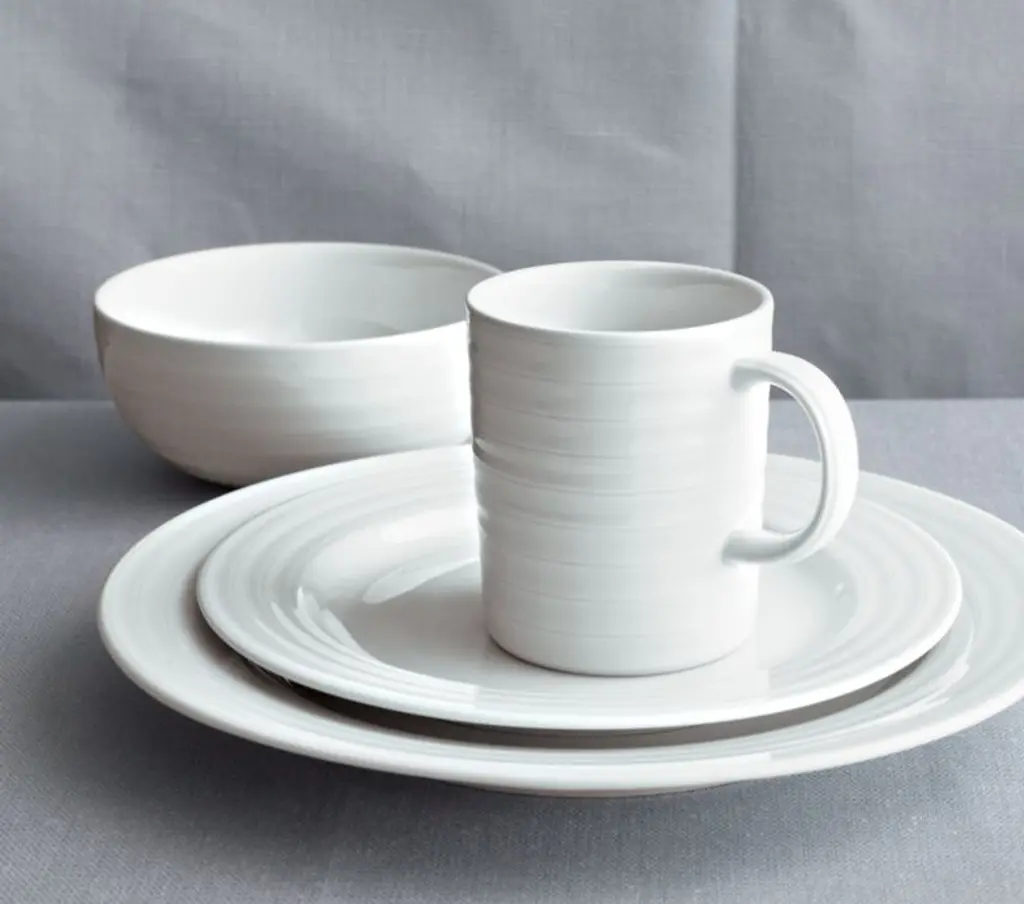 Designed by Martin Hunt of Queensberry Hunt, Roulette dinnerware has been a top-selling Crate and Barrel favorite since the pattern was introduced in 1992. Crafted of durable, pure white porcelain, Roulette features subtle concentric circles that create an eye-catching rippled effect. Mix and match with our Roulette Blue Band dinnerware.