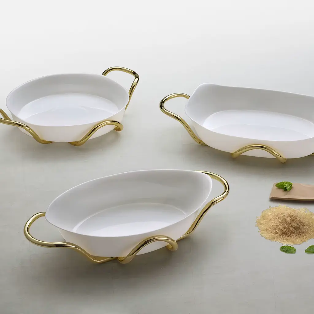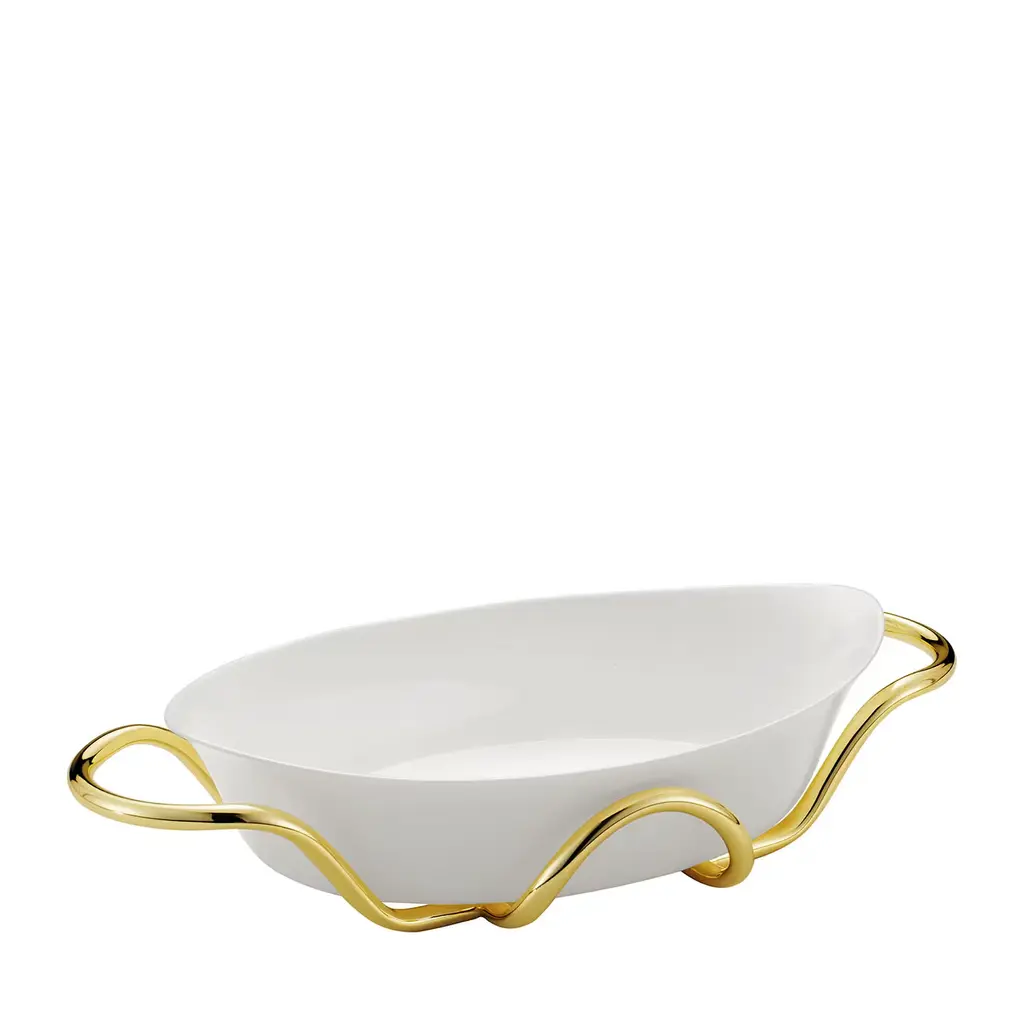A cylindrical structure marked by sinuous curves and flaunting a gleaming golden finish defines the brass holder here welcoming a round ceramic baking dish. The combination of these two elements allows for elegantly and safely serving food just taken out of the oven directly to the table. A silver-plated variant adds to the oval and rectangular versions available in the Artemest catalog.