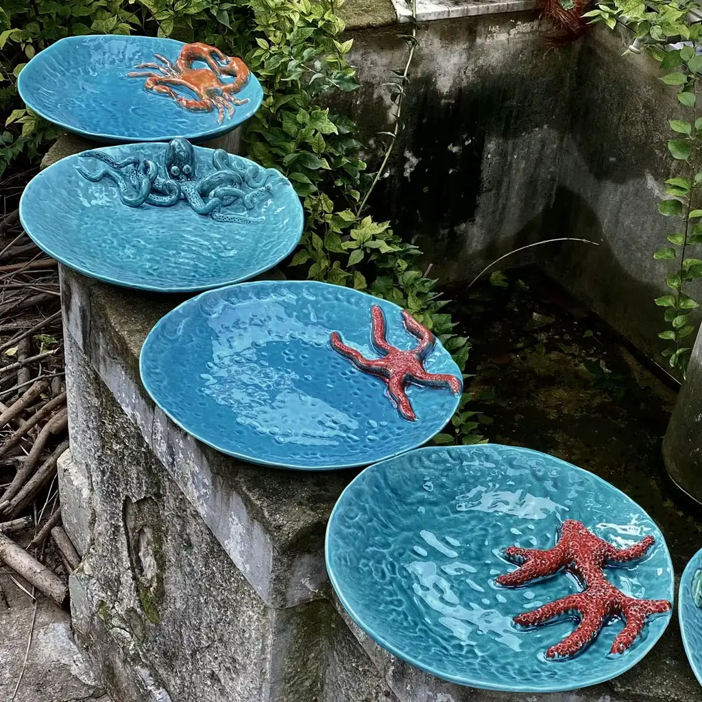 Round plate with raised octopus swimming around the edges. The plate is sea blue and the octopus is blue with green and red reflections, handmade, each one different from the other. It can be used as an ornament or a centerpiece but also to bring food to the table.