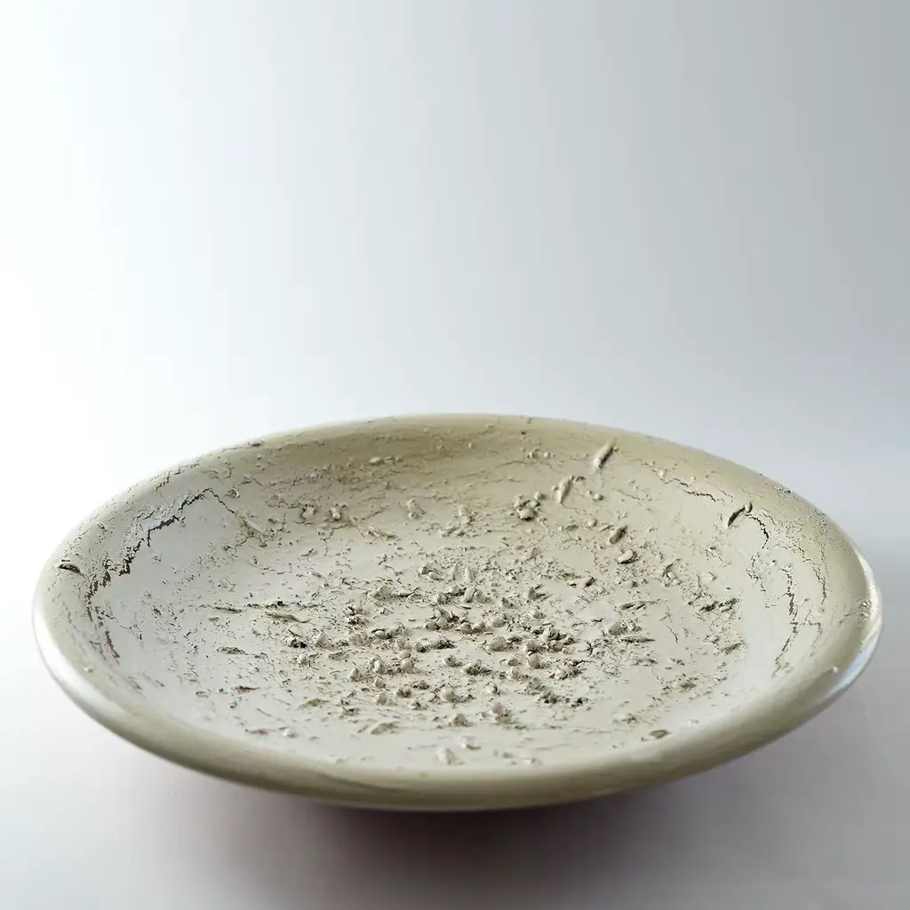 This unique plate was hand made in terracotta and then covered with rich glazes and oxides, and finished with a dynamic and organic texture. Due to its hand-crafted nature, reproductions of this piece will be similar but not identical.