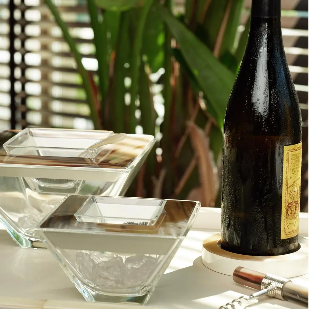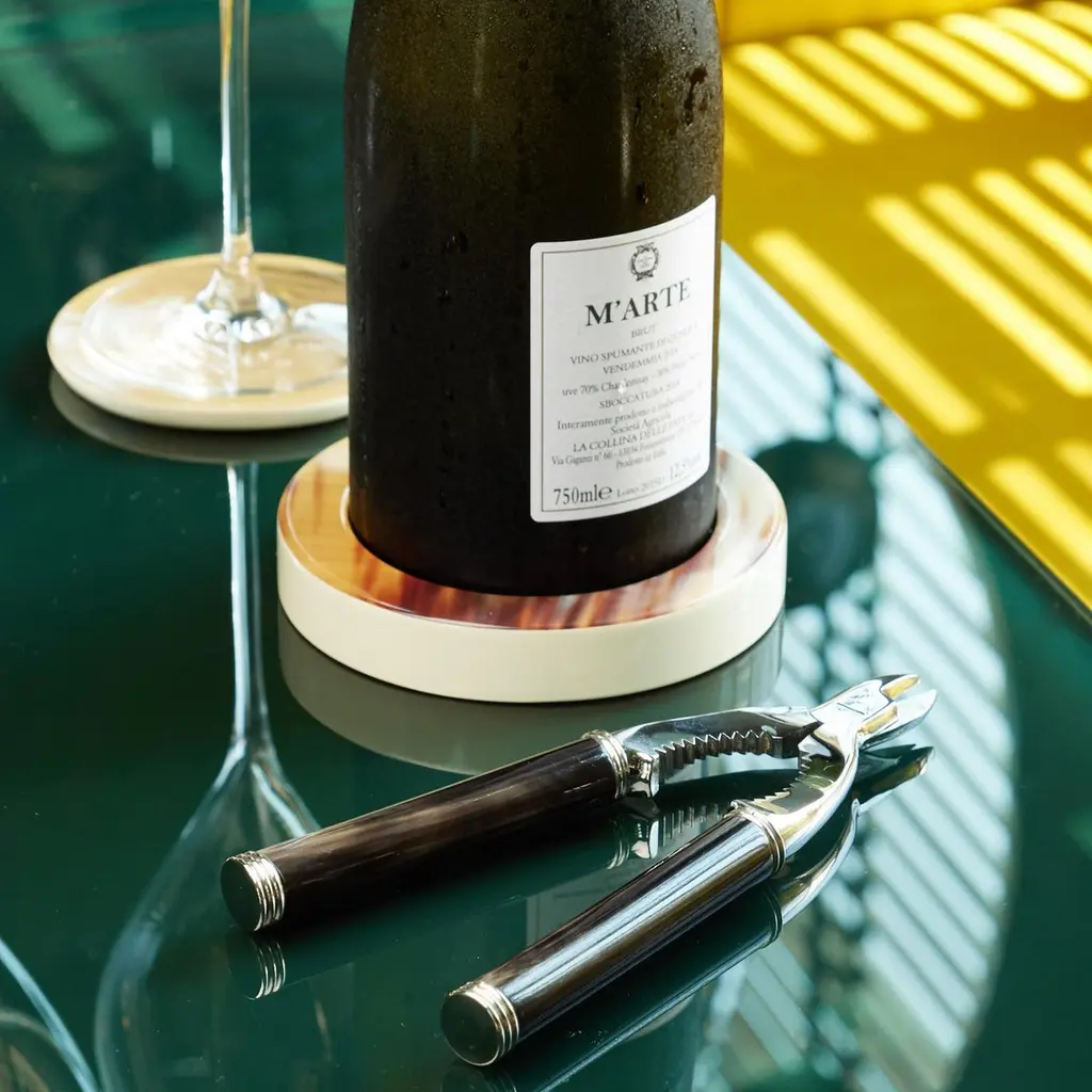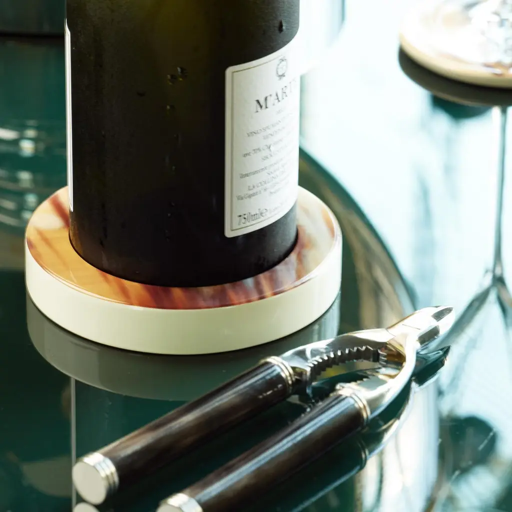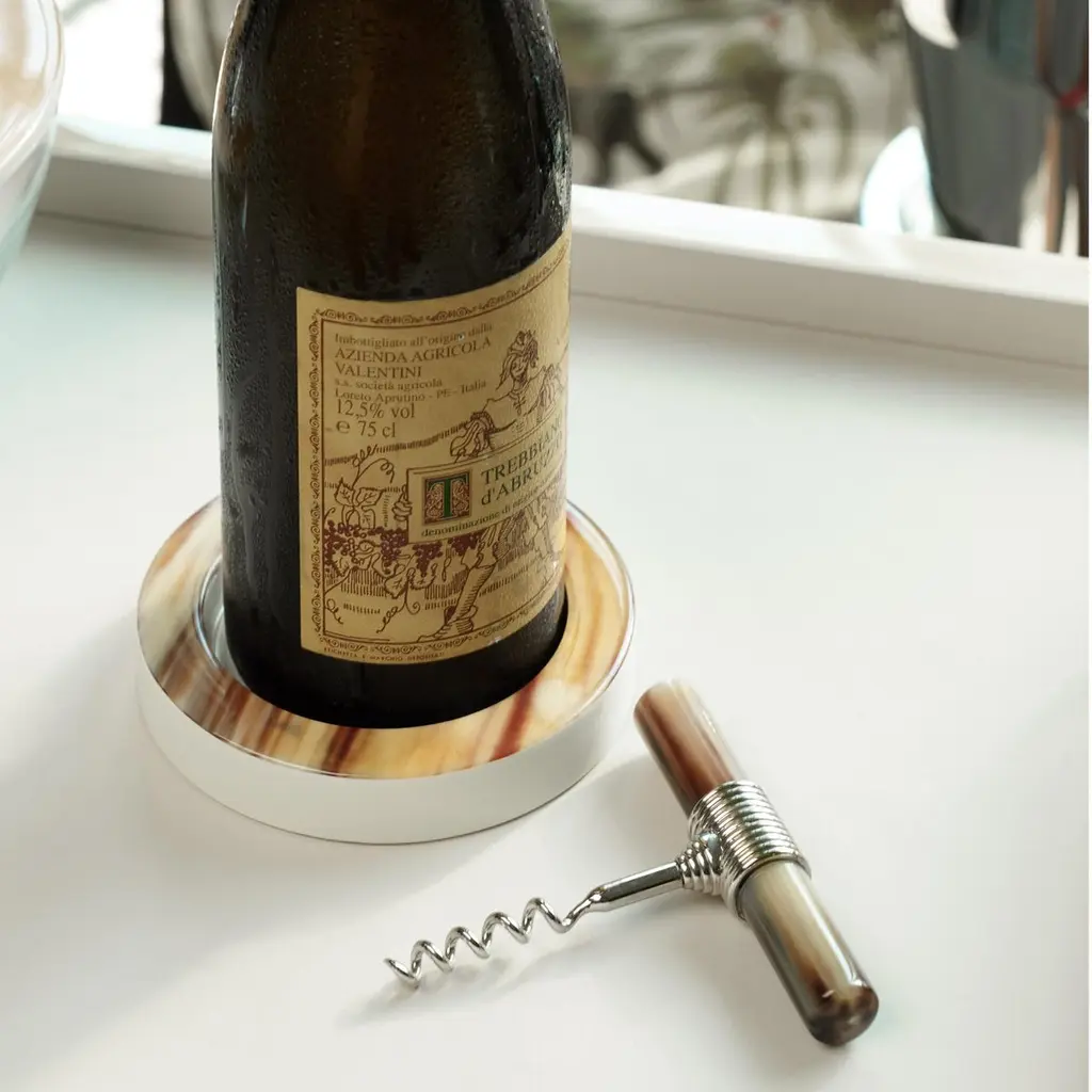 Handcrafted from natural Corno Italiano and lacquered wood with cream-colored gloss finish, this stunning wine coaster will add organic beauty to any table setting, courtesy of its unique veining. The design accommodates a standard bottle of wine and promises to protect any surface from drips and stains.Note: Colors and shades of Corno Italiano processed by our Company are unique and due to the natural origin of raw material. For this reason Corno Italiano tones that can be seen in pictures are indicative and cannot be reproduced in finished products.