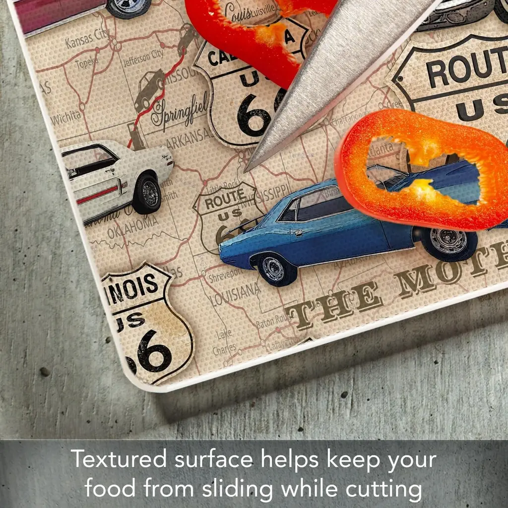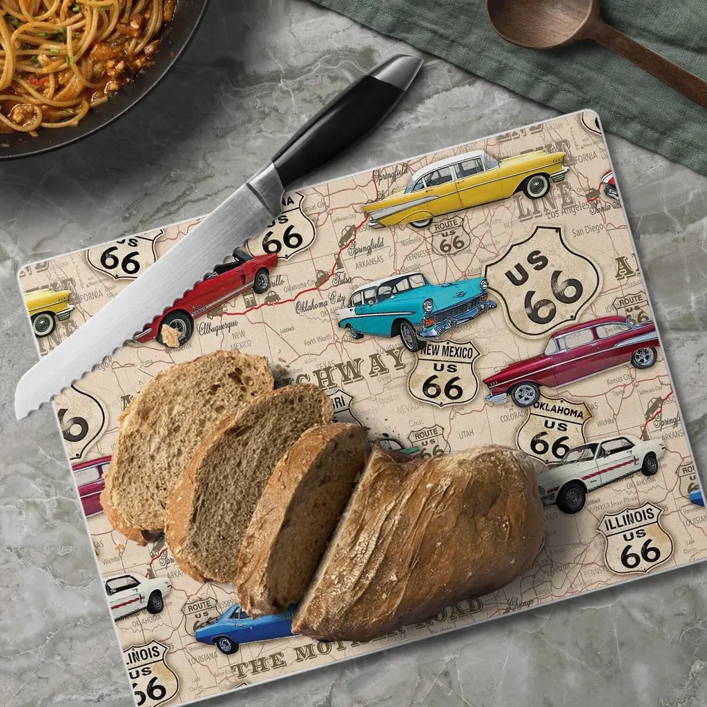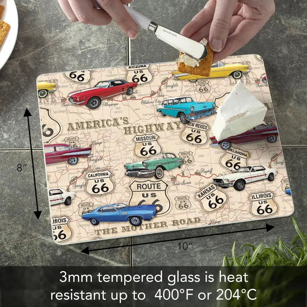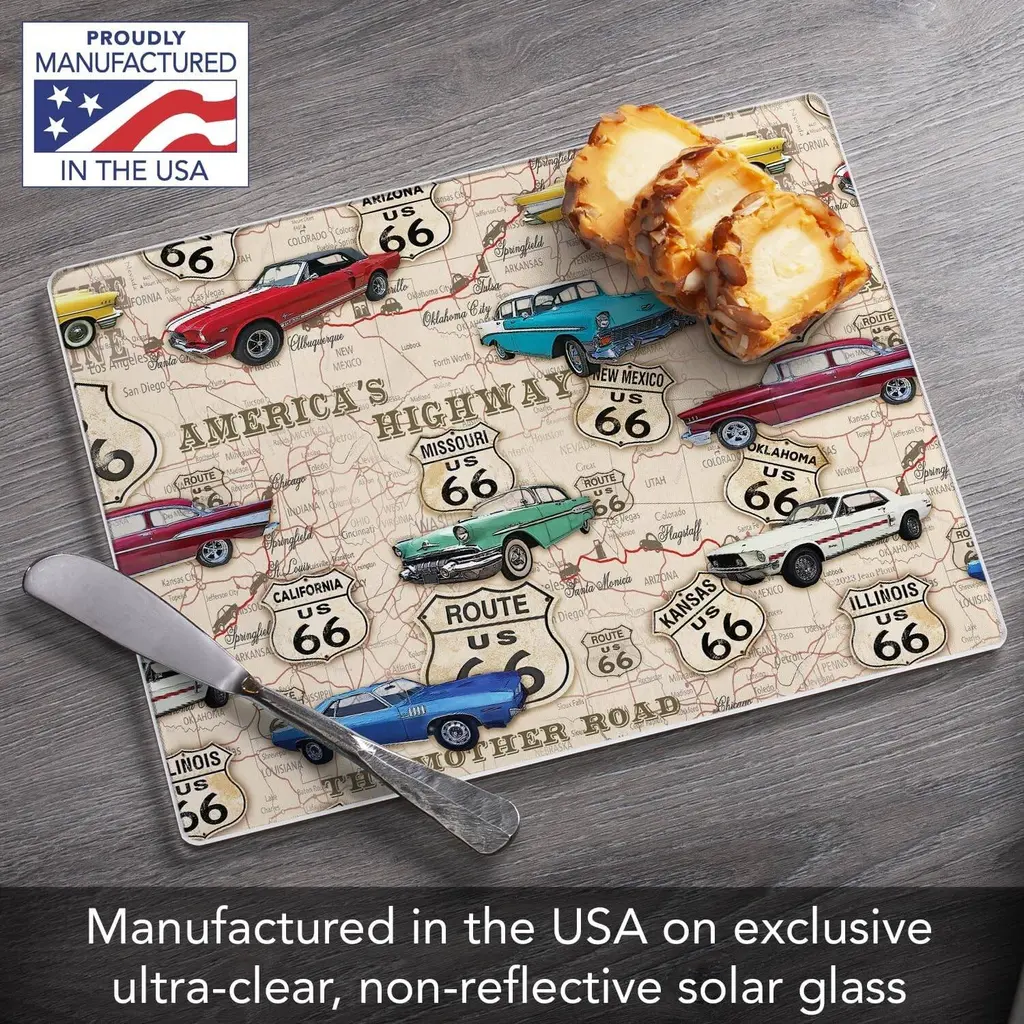 Route 66 Map 3mm Heat Tolerant Tempered Glass Cutting Board. Manufactured in the USA in our Springfield TN facility. Great for food preparation, cutting and serving. Made of high quality 3mm Tempered Glass that is safe for temperatures up to 400 degrees F or 204 degrees C. Measures 10" x 8". Non-Skid Rubber Feet included on back of the board to prevent movement of the board when in use. Protects your surfaces from scratches and stains when preparing food. Artistic design allows the Cutting Board to remain displayed when not in use. Adds color and distinction to your space. Cutting Board is dishwasher safe.