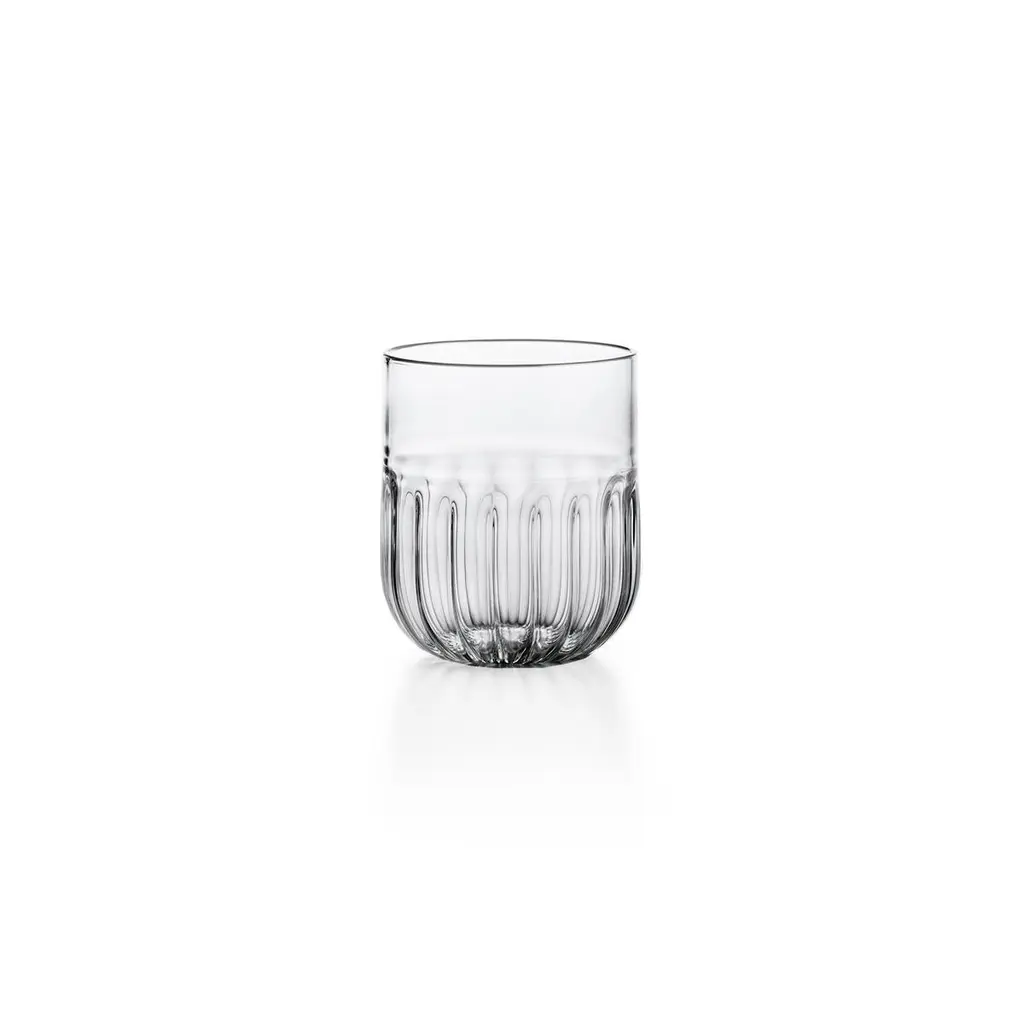 Mouth blown wine glass. The routine collection is a glassware family designed by Matteo Cibic, who define it as “an essential collection for a smart daily life”. All the pieces of Routine are handcrafted and feature a soft plissé motif at the base of the glasses and on the top of the jugs. Fresh and contemporary Routine brings elegance in the every day table, and a touch of joy for the special mise en place.