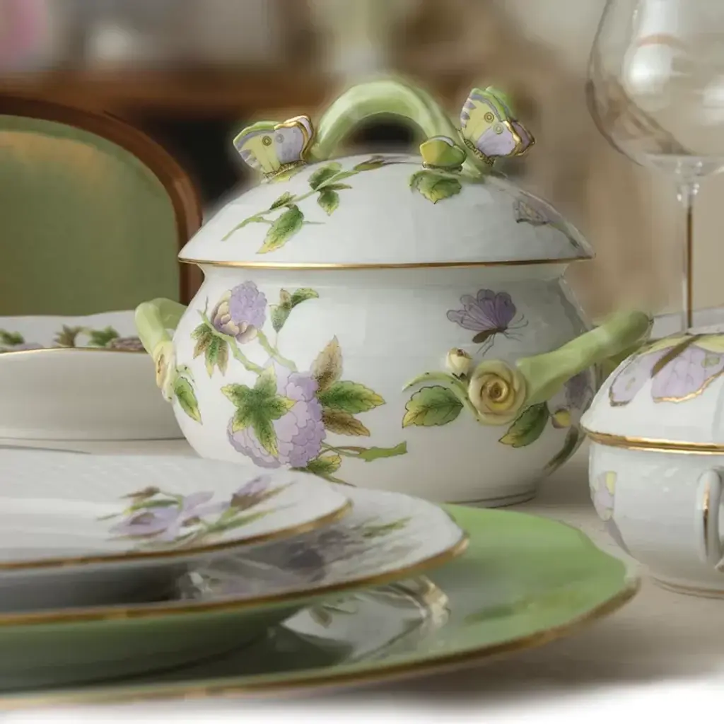 On the eve of Prince William and Kate Middleton's wedding, Hungary formally presented Royal Garden dinnerware as the country's official gift to the royal couple. Created by Herend specifically for William and Kate, the design is a modern interpretation of Herend's classic Queen Victoria pattern, which celebrated its 160th anniversary in 2011. Queen Victoria was first purchased in 1851 by its namesake upon her seeing it in London at the first World's Fair. Hand painted in Hungary. Now the biggest porcelain manufactory in Europe, Herend was founded in 1826 to produce earthenware in the small Hungarian village for which it was named. At the time, Hungary was flooded with low-cost pottery, but in 1839, Mor Fischer became the Manufactory’s new owner and he decided to focus on producing dinnerware replacement pieces for Europe’s royal families to complement their valuable porcelain patterns from Germany and the Far East. As his client base grew, Fischer commissioned his artists to begin designing dinnerware patterns of their own. Queen Victoria’s 1851 purchase of a large set for Windsor Castle was a milestone, setting the stage for aristocrats throughout Europe to clamor for Herend in their estates. In the 1850s, Herend added meticulously-crafted figurines to its creations. Herend’s trademark fishnet pattern, which is widely recognized and prized as Herend’s signature design, started in 1858 when an artist who was intrigued with a Chinese plate’s fish scale design painted it onto a rooster figurine to imitate feathers.