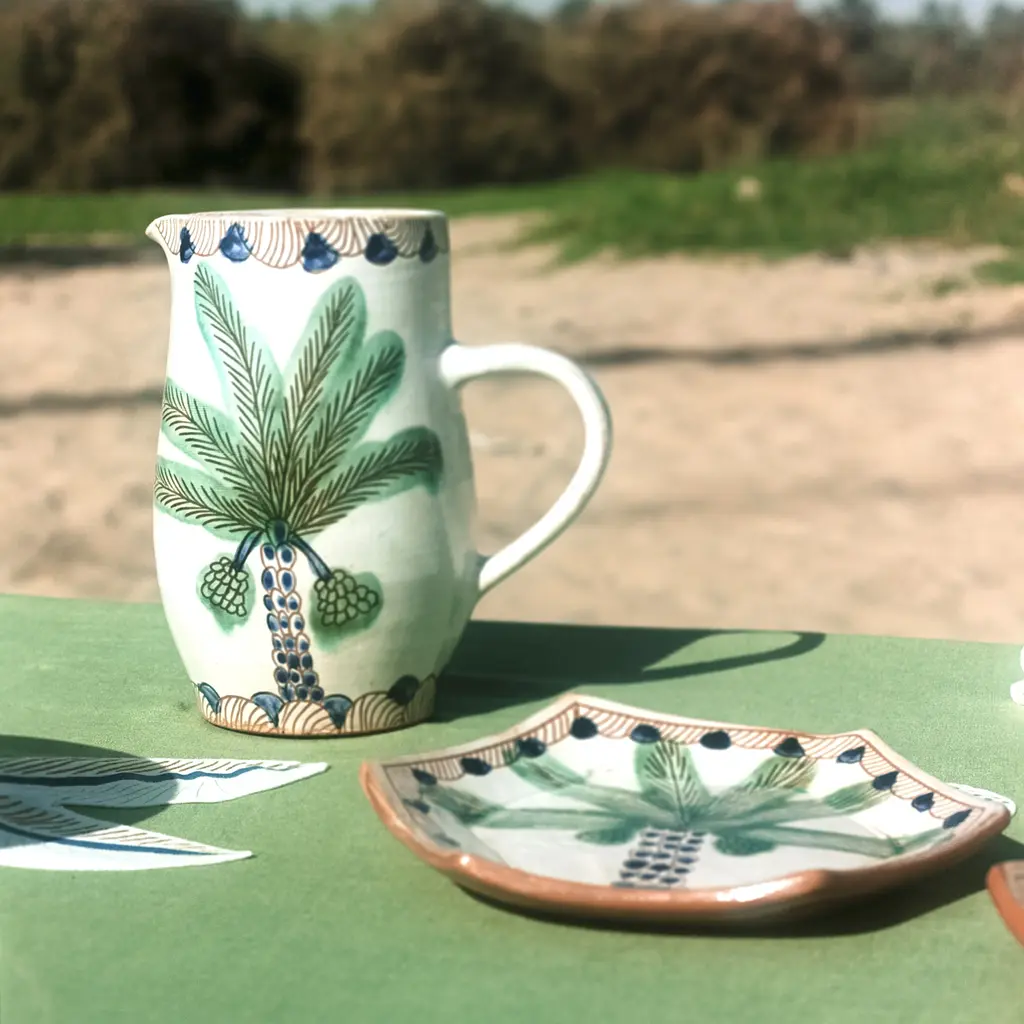 Like a little slice of summer, this hexagonal dinner plate is all charm and character. Hand-painted palms dance across its surface, echoing breezy afternoons and clinking glasses. Made in Fayoum by expert hands, it’s a plate that makes every meal feel like a holiday. * ANŪT Cairo products are entirely handcrafted, so slight imperfections, color variations, and minor size differences may occur.
