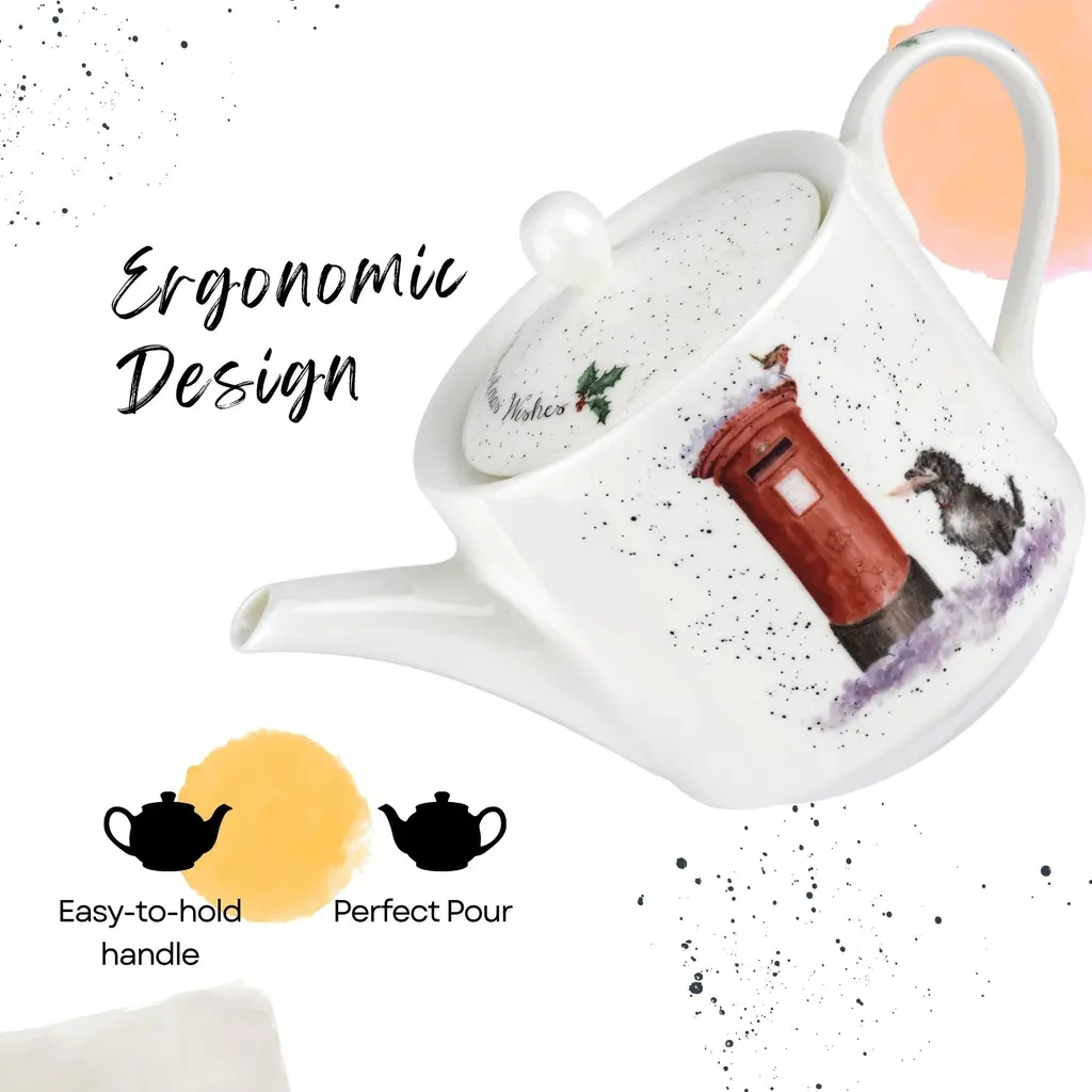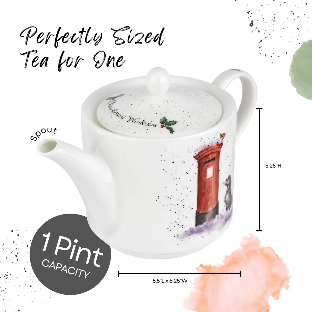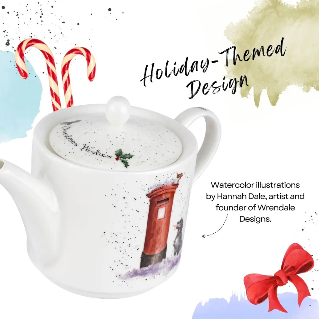 Royal Worcester Christmas Wishes 16oz Teapot - Dog with Holiday Card, Wrendale Designs - Fine Bone China Holiday-Themed Teapot - Dishwasher, Microwave, Freezer Safe - Decorative Holiday Teapot - NewCelebrate the holiday season with the Royal Worcester Christmas Wishes Teapot from Wrendale Designs. This charming teapot features a delightful illustration of a dog with a holiday card, capturing the festive spirit with whimsical flair. Inspired by the charming creatures of the Lincolnshire countryside, watercolor artist Hannah Dale has perfectly captured the irresistible personalities of these familiar animals in this enchanting design. The Christmas Wishes Teapot features signature flecks of color down the handle and over the top, adding a whimsical touch to its festive design. This decorative piece not only serves as a functional teapot but also as a beautiful holiday decoration that enhances the joy and warmth of the season. Whether displayed on a holiday table or used to serve beverages, it is sure to bring a smile to everyone's face. This teapot makes a thoughtful and delightful holiday gift for friends and family. Its charming design and high-quality construction make it a memorable present that will be cherished for years to come. Whether for a tea lover or someone who appreciates fine china, the Royal Worcester Christmas Wishes Teapot is sure to bring holiday cheer and warmth to any home.FEATURES:COLOR:MATERIAL:WHAT'S IN THE BOX:PACKAGING: Retail Packaging