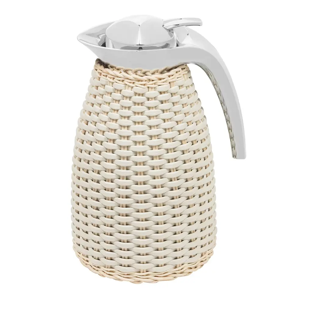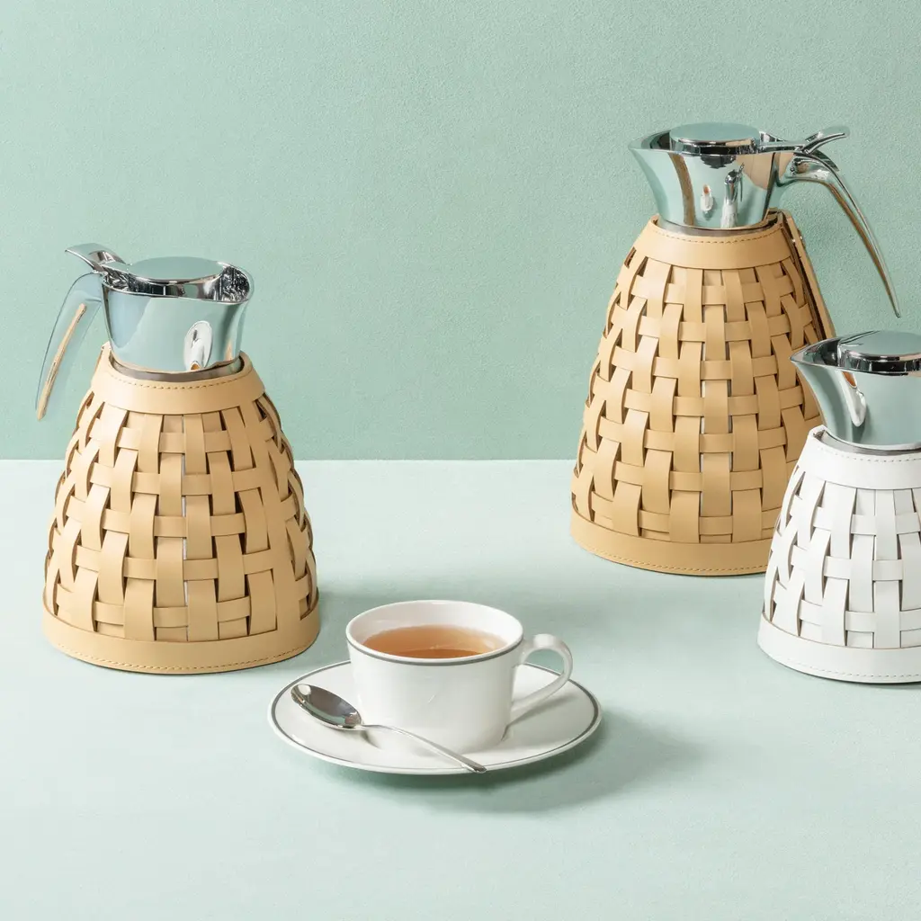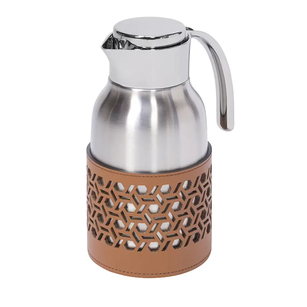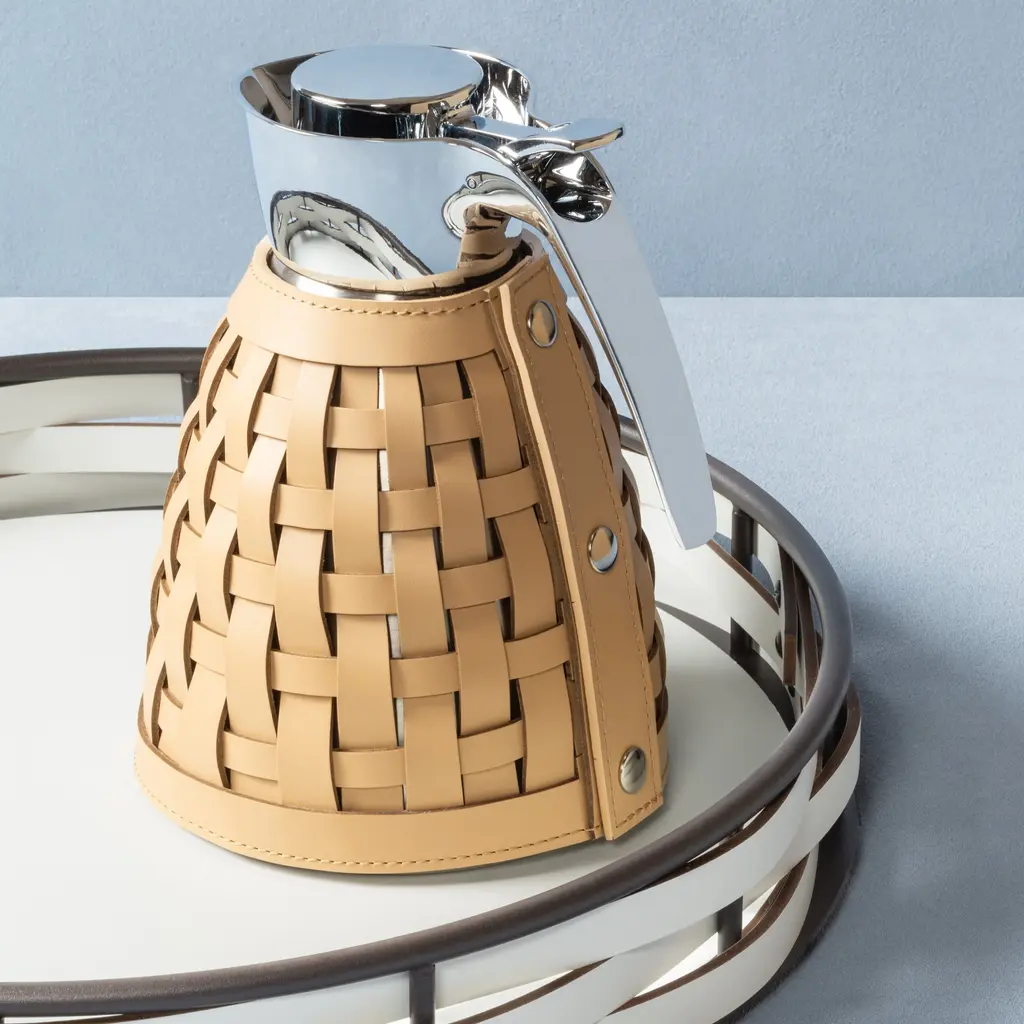A fusion of innovative function and artisanal style, the Rudi Gourde Carafe from Rudi redefines elegant serving. Crafted in Italy, its insulated stainless steel body maintains optimal liquid temperature, wrapped in a removable, hand-woven regenerated leather cover for a touch of textural warmth. A specially designed hinged lid allows for precise, one-handed pouring, making it a statement of modern luxury and thoughtful engineering for any sophisticated table setting. Highlights: