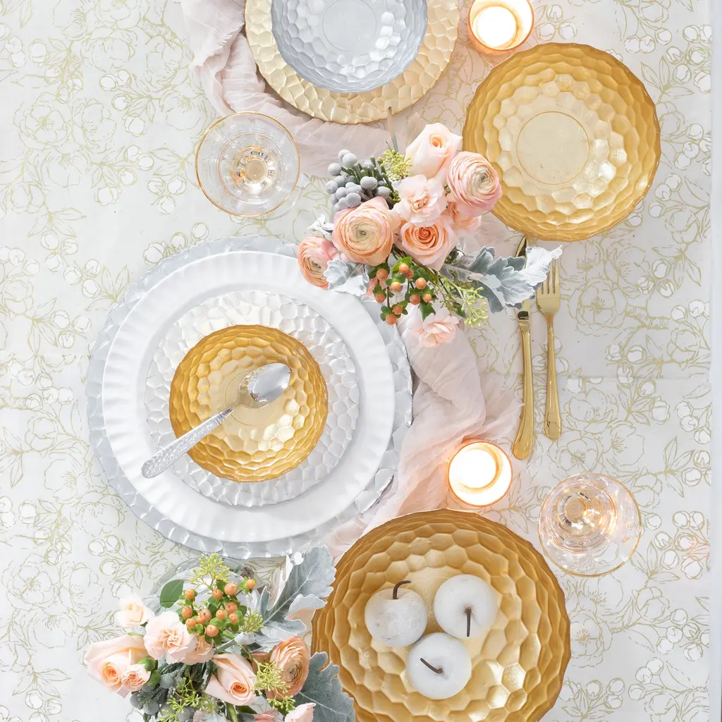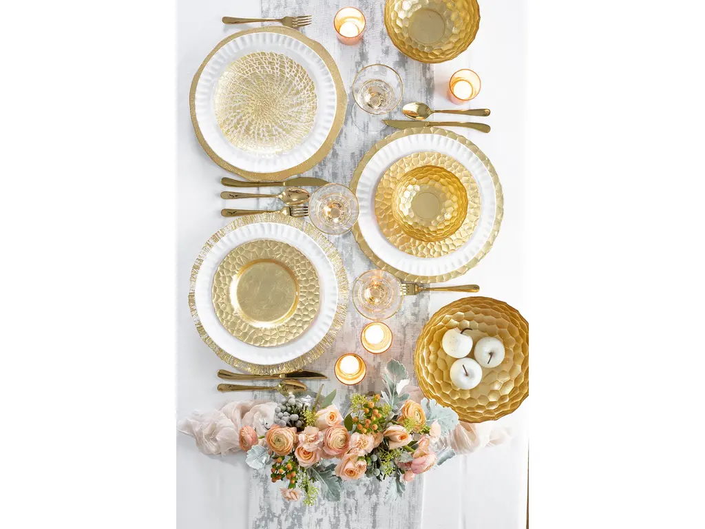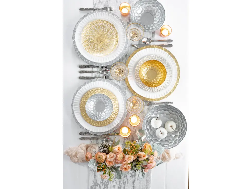 Luxurious dining begins with VIETRI's Rufolo Honeycomb Collection. The beautiful dinnerware features an organic honeycomb pattern with a stunning shimmery finish.