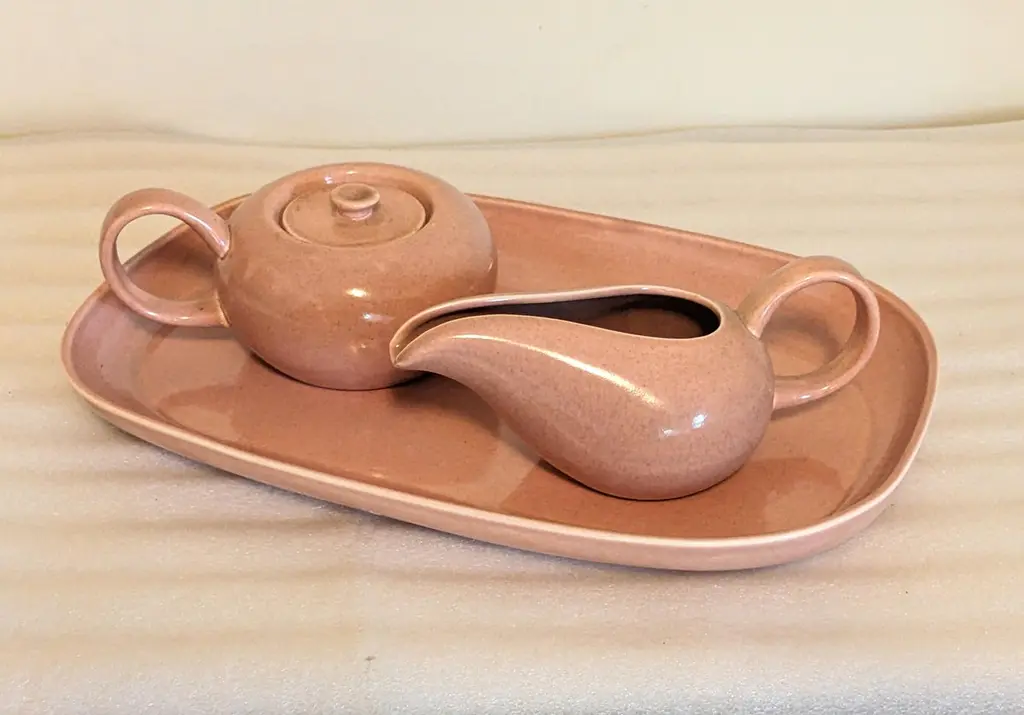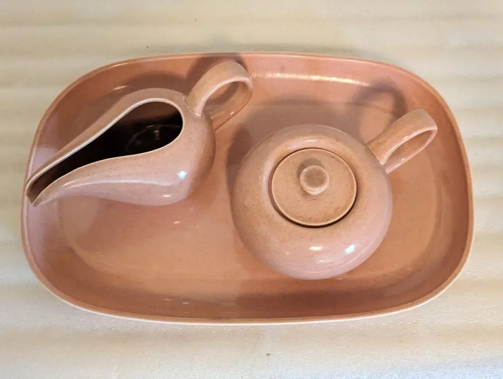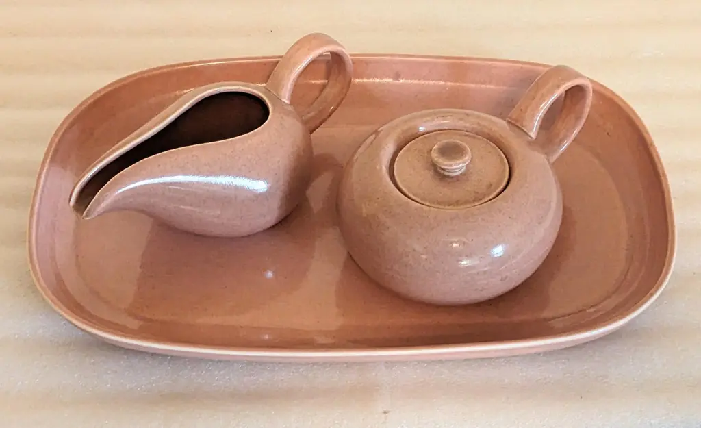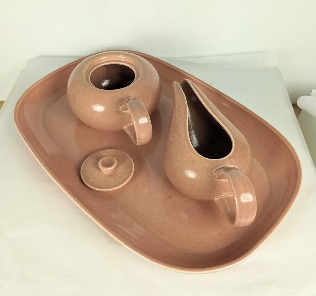 Russel Wright Iroquois Casual Pink Set with Underplate. Sugar with creamer with underplate. 1950's USA. Tray 13" x 9".