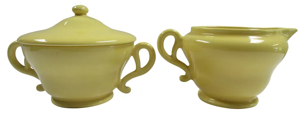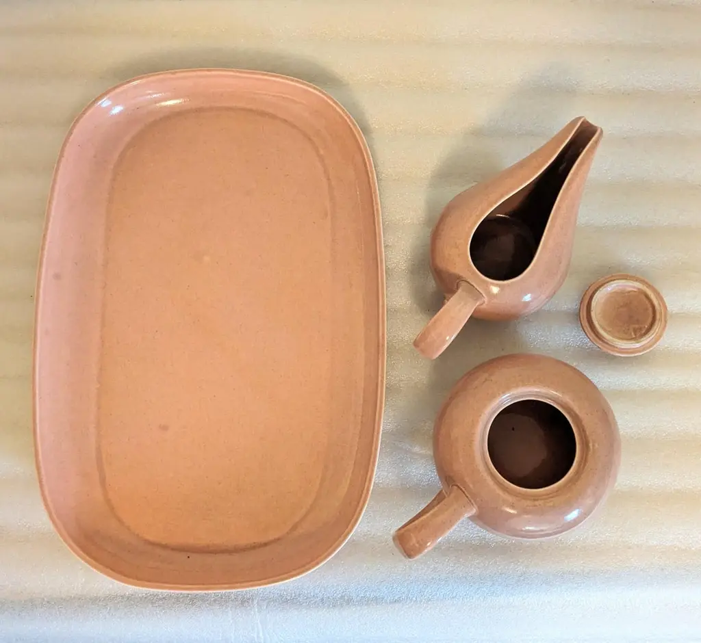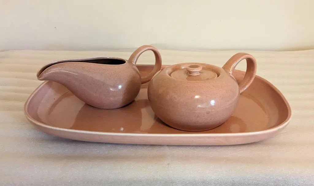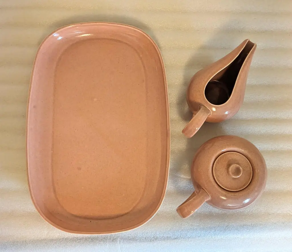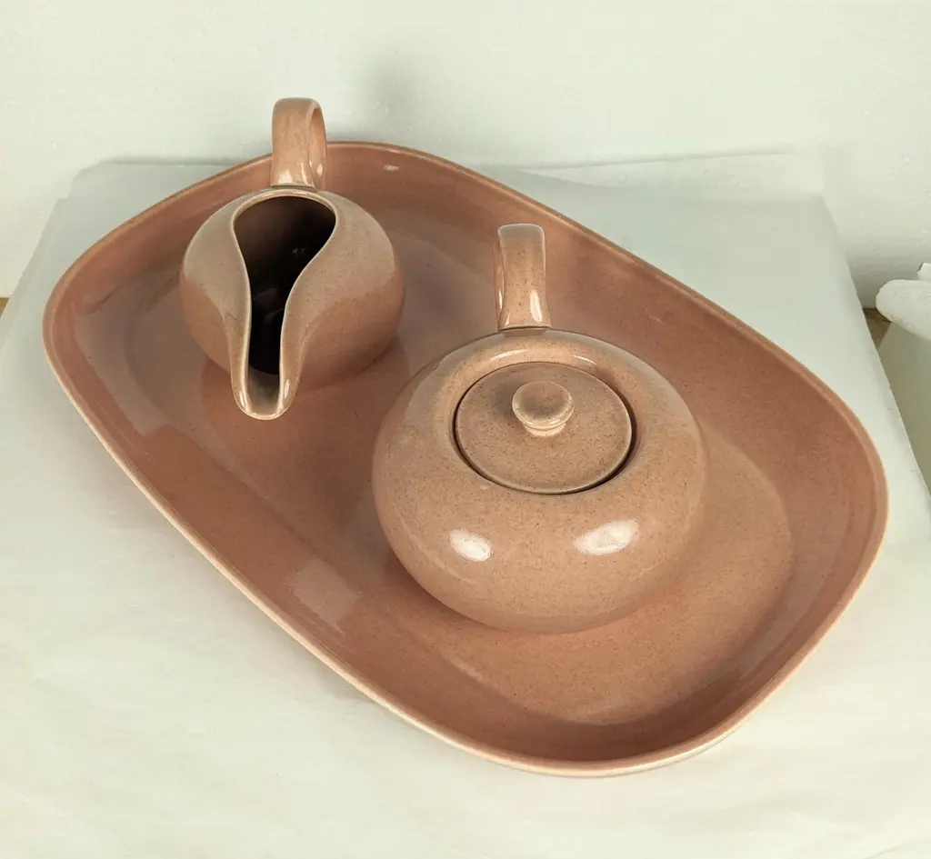 Russel Wright Iroquois Casual Pink Set with Underplate. Sugar with creamer with underplate. 1950's USA. Tray 13" x 9".