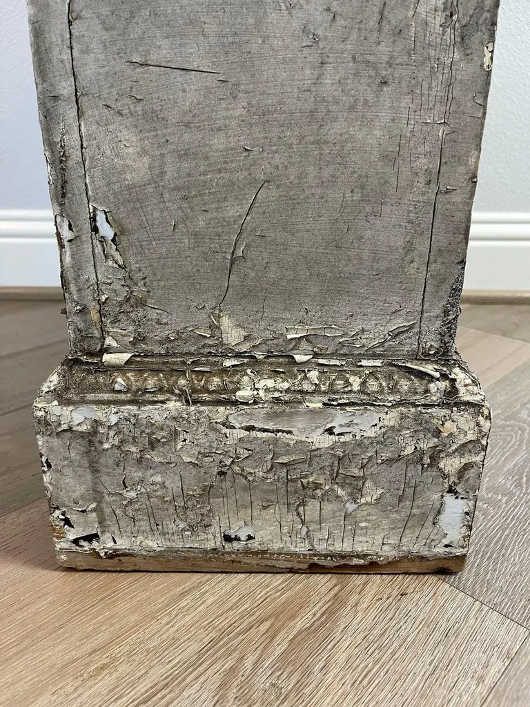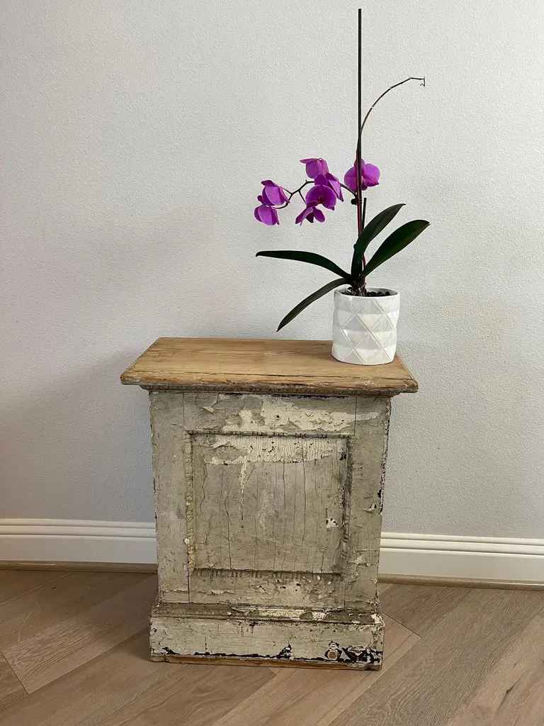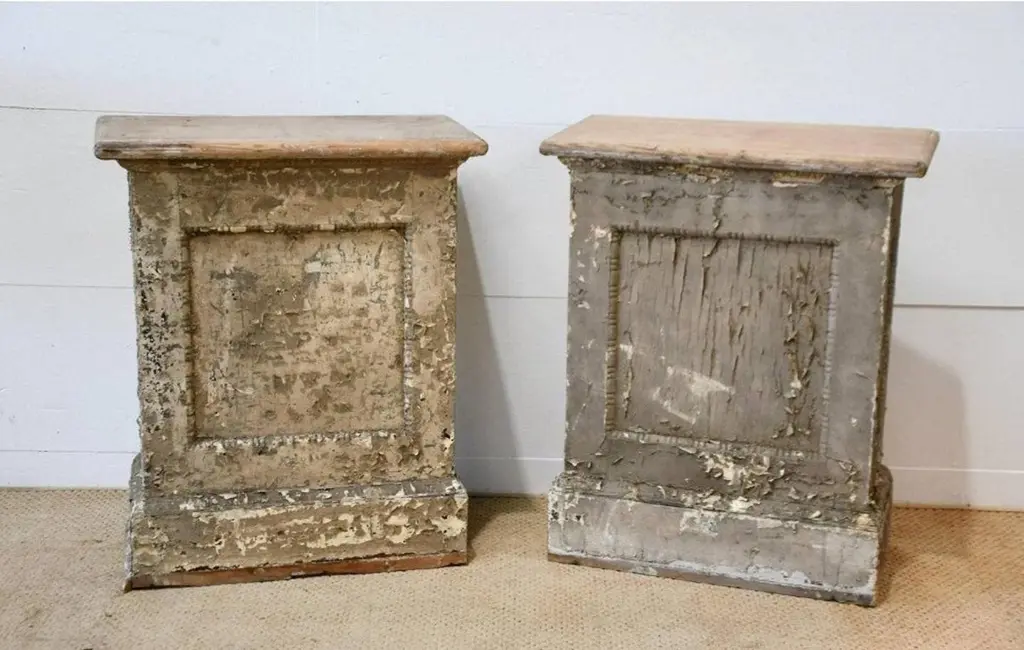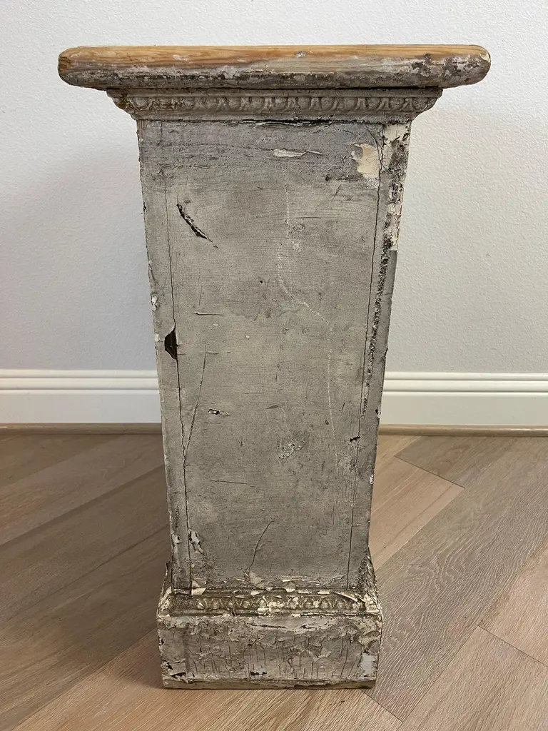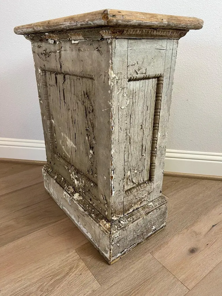 A most distinctive Swedish Country hand painted wooden stand. Hand-crafted of solid pine, most likely Gustavian Period (1772–1809), finished on all sides, showcasing layers of the original paint finish, now with heavily worn, distressed, weathered chippy paint rich patina that only adds to the overall antique character, charming authenticity and elegant rustic warmth. circa 1800Please note, at the time of writing this, a similarly styled / not matching second stand is available. The pair shown in the photo. If you would like the second stand enter quantity 2 at checkout. Dimensions: (approx)26" High, 21" Wide, 12" Deep Versatile:As warm and attractive as it is functional, having the ideal size and proportions for a variety of different uses, including as a side table, bedside nightstand, plant stand, decorative arts display pedestal or podium, hall console, flanking a door as an accent piece or placed in the foyer as a stunning entry statement piece!Condition:Good original 200 year old antique condition with beautifully aged patina. Strong, sturdy and structurally sound, with heavily worn, weathered, organically distressed painted surface. Significant chippy paint losses and outstanding craquelure.