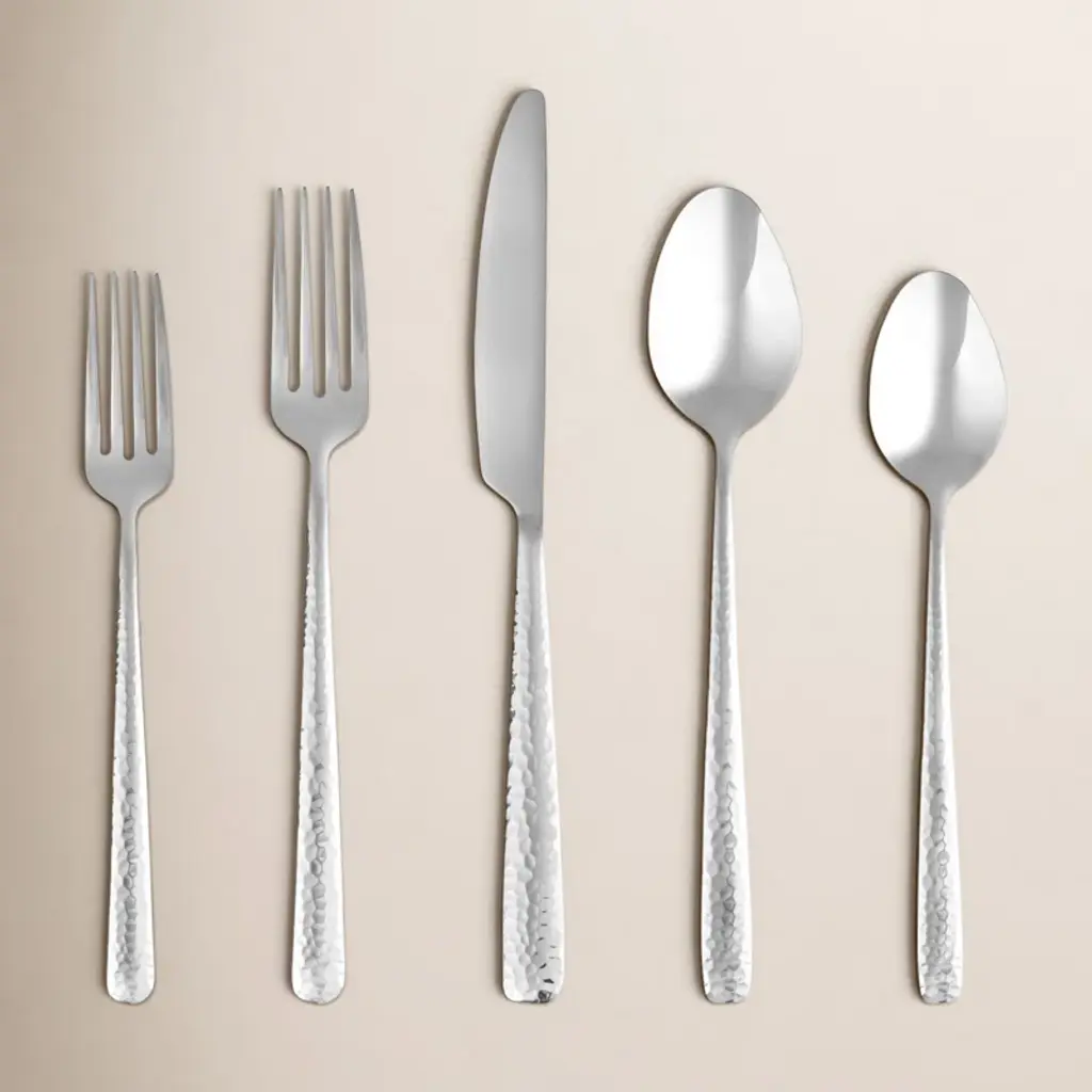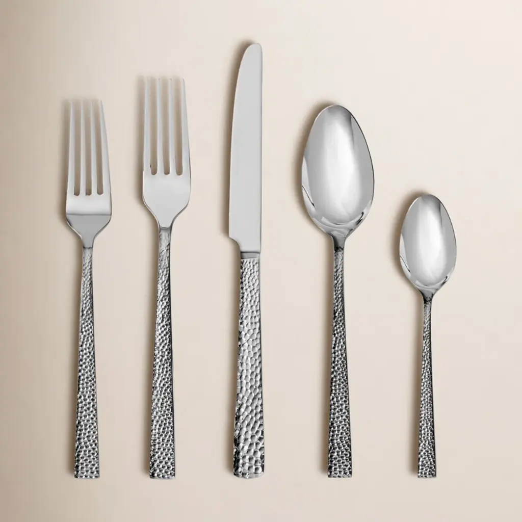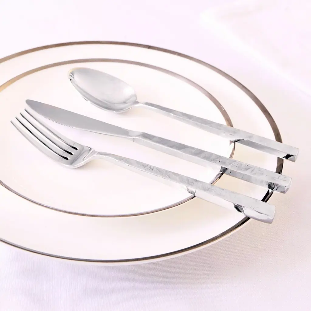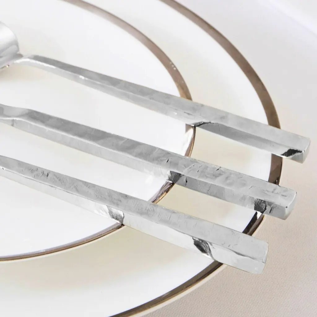 This exquisite flatware set is meticulously crafted in India using premium 18/10 stainless steel. The handles boast a distinctive handmade texture, imbuing each piece with a one-of-a-kind rustic charm that celebrates its artisanal roots.