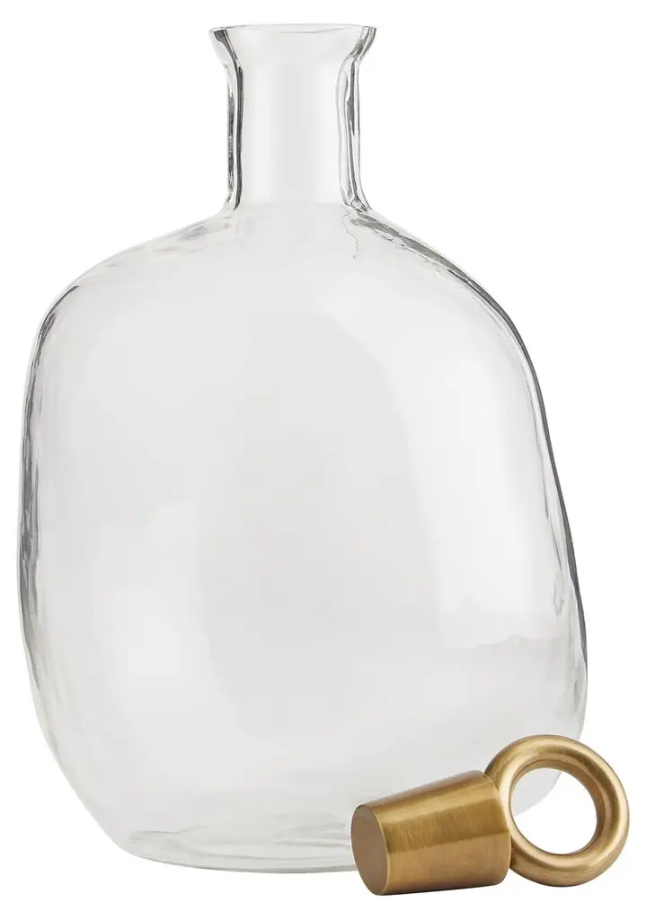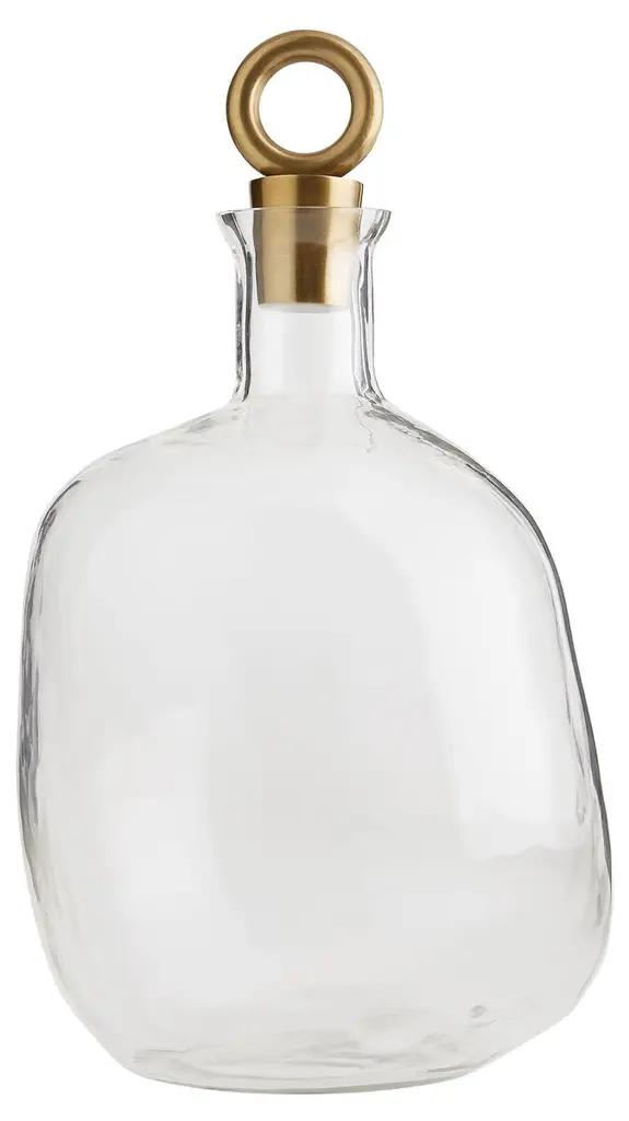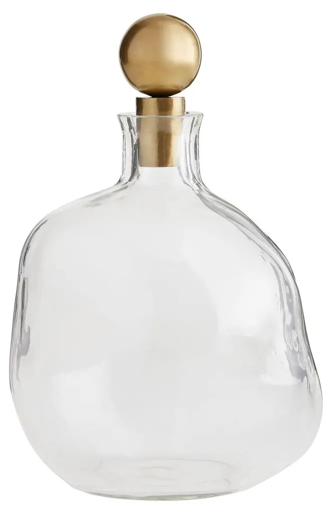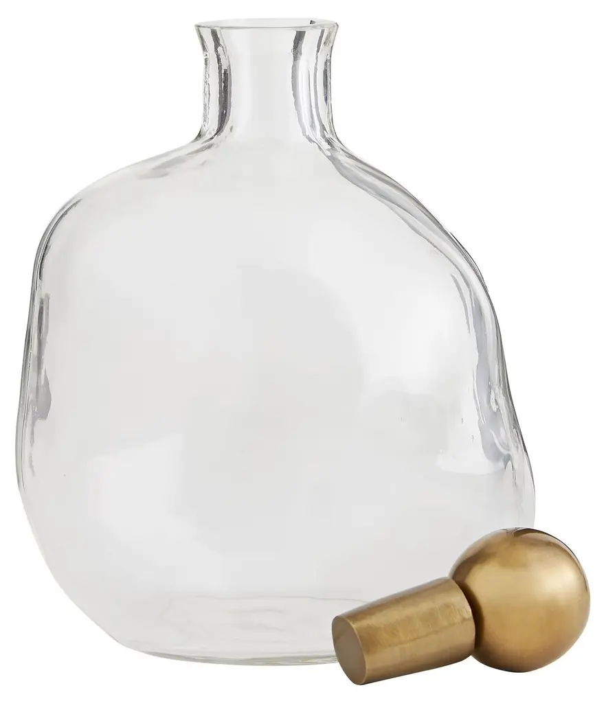 Sculptural stoppers with an antiqued gold finish accentuate the free-form shapes of these clear glass decanters. The larger decanter is 10.5 inches high; its companion is 9 inches. Watertight and food safe.