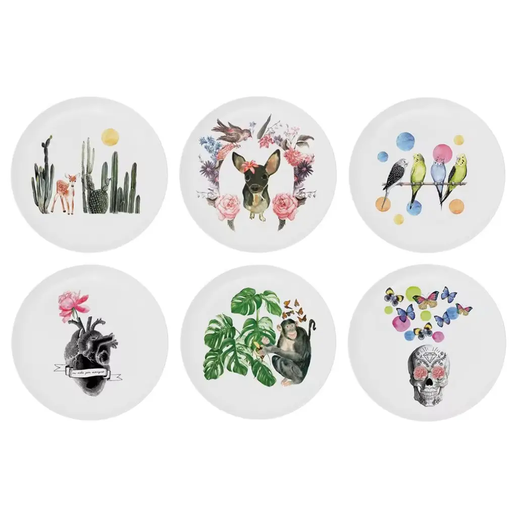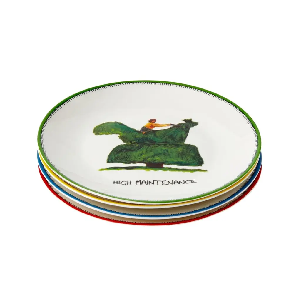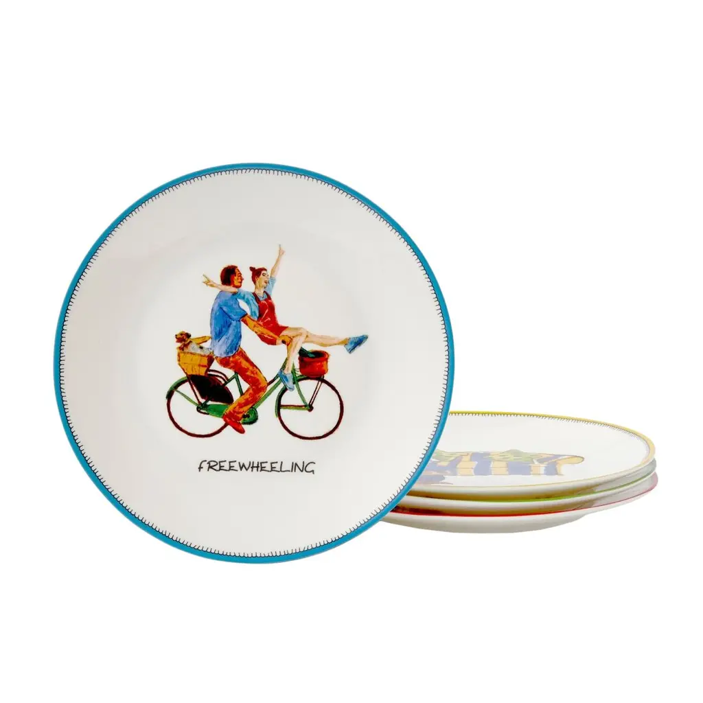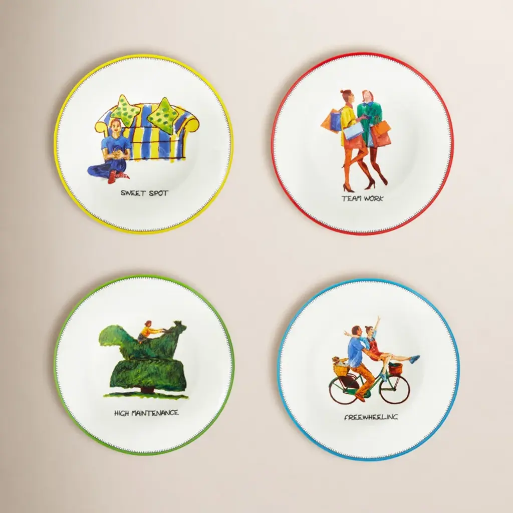 Bring color and whimsy to the table with these vibrant tidbit plates. A set of 4, each plate features a beautiful painted illustration alongside a cheeky tagline to make you smile. Perfect plates for enjoying a slice or two of cake with friends, plating up a teatime treat just for you, and as a gift for someone special. Made from fine china, the plates can be placed in the dishwasher after use, making them perfect for everyday use.