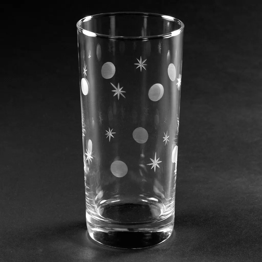 Made and decorated by hand in the USA, these highballs each feature a heavenly star-and-moon pattern that wraps around the entirety of the glass. Skilled artisans etch into the glass using a series of rotating stone wheels.