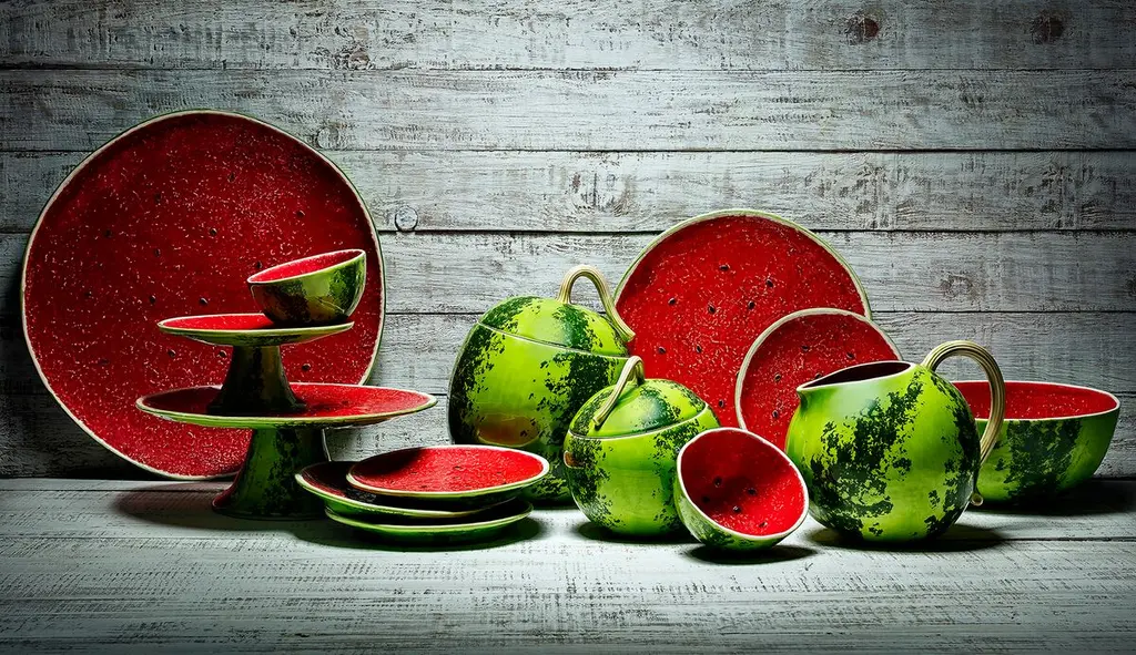 Even more delightful than cabbageware is melonware. This quartet of artisanal dinner earthenware plates, crafted in Portugal, are a prime example. The undersides look like watermelon rinds, while the tops are painted to resemble the juicy pink flesh. Because the plates are dishwasher safe and microwave safe, you can use them every day.