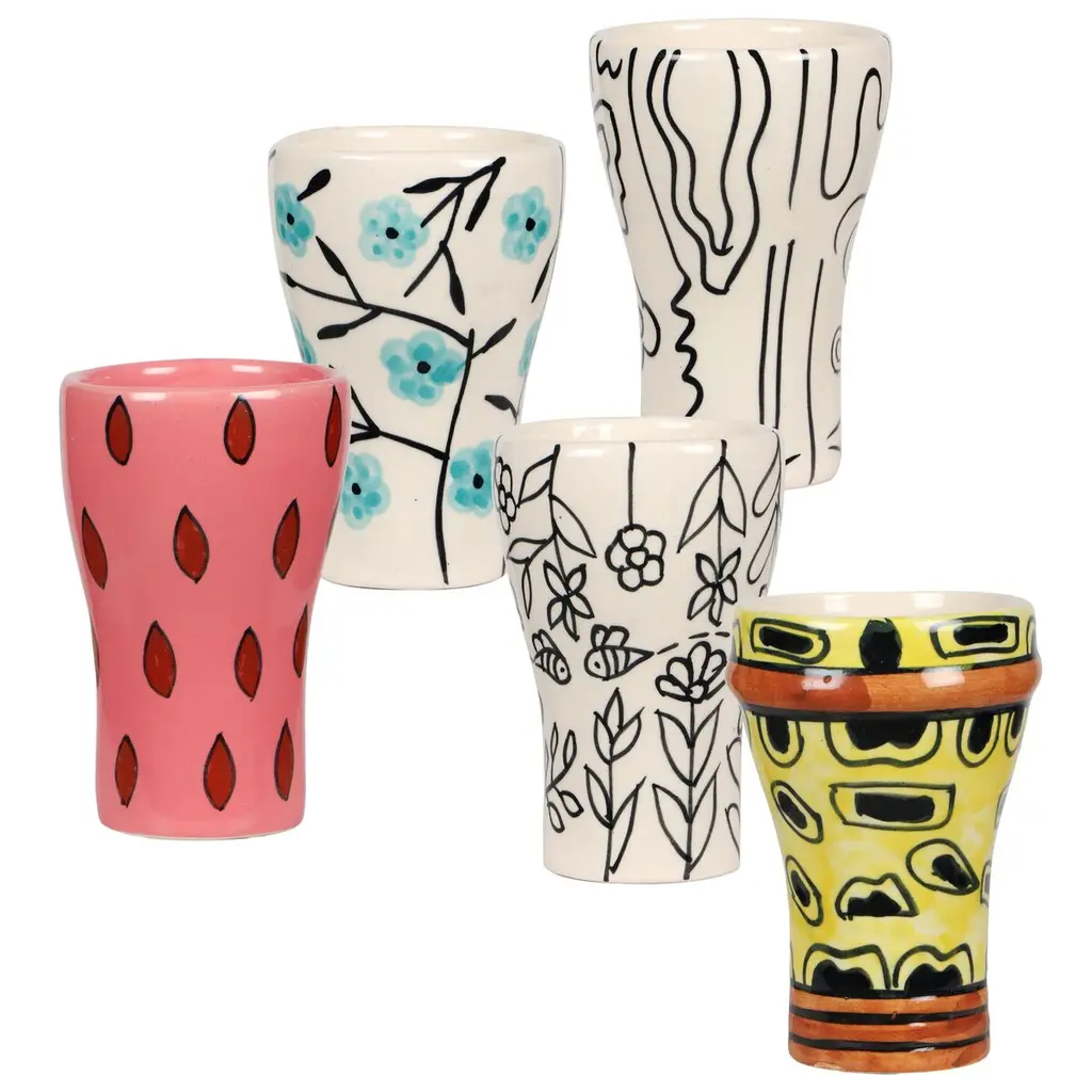 The Eva Ceramic Glassware Collection brings a playful twist to your table with cheeky designs like 'Flirty', 'Daydreamer', 'Goofy', 'Bashful', and 'Sultry'. Hand-painted by skilled ceramic artisans, each piece is food-safe and full of personality. Available as a set of four with your favorite face or a set of five featuring one of each, these ceramic gems are as fun as they are functional.