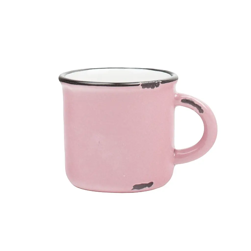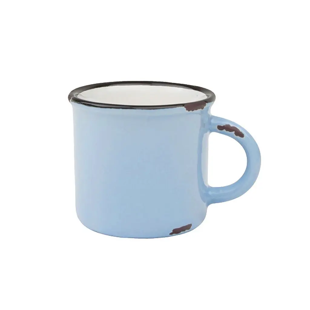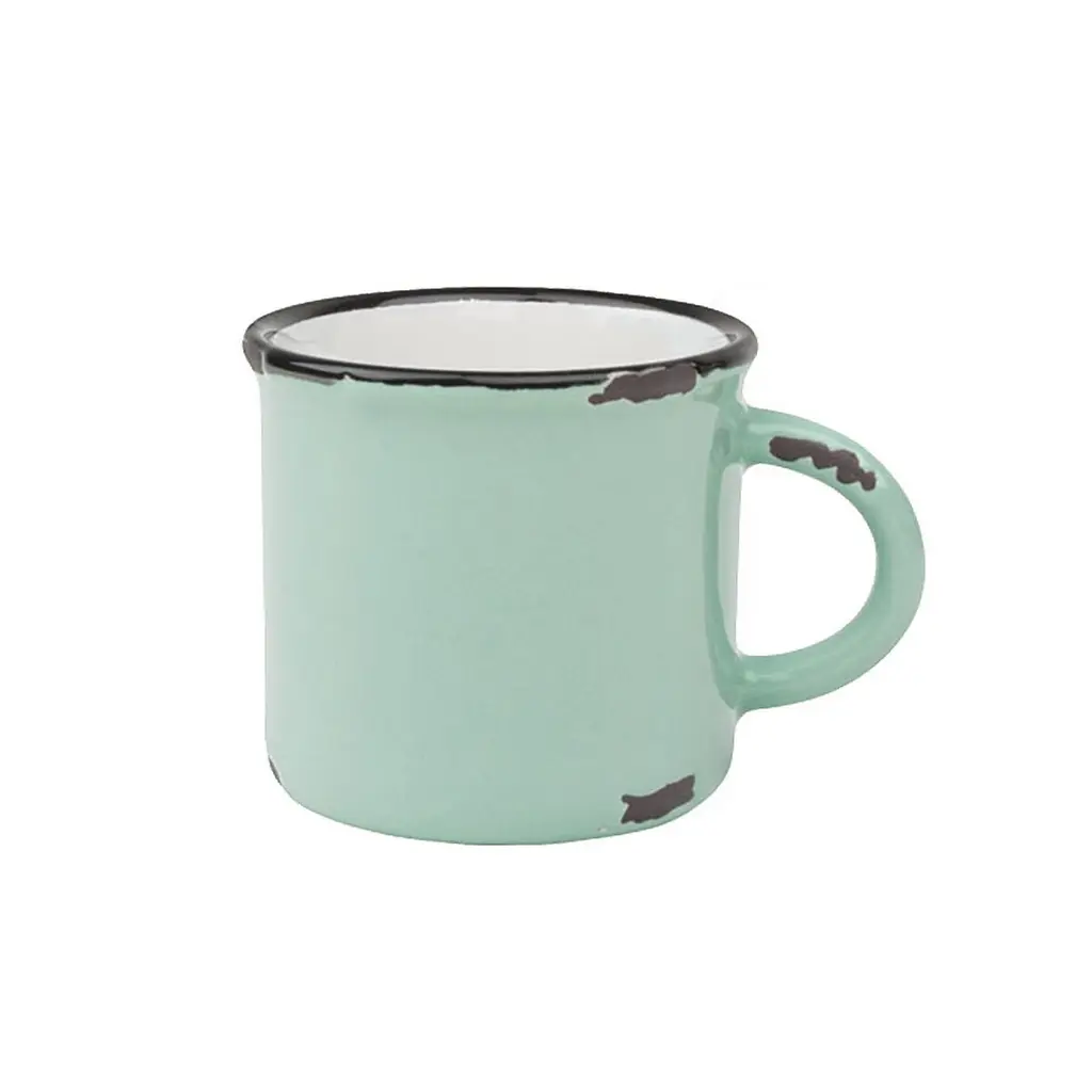 Mimicking vintage metal cookware, the Tinware collection is made of stoneware, complete with realistic distressed edges and a contrasting rim stripe. This collection is heavy duty and functional for the modern home. Glazed Stoneware. Set of 6 espresso cups includes 1 of each: White, Light Grey, Cashmere Blue, Pea Green, Yellow, Pink. Dishwasher & Microwave safe. 2.25"D x 2" H, 2oz capacity.