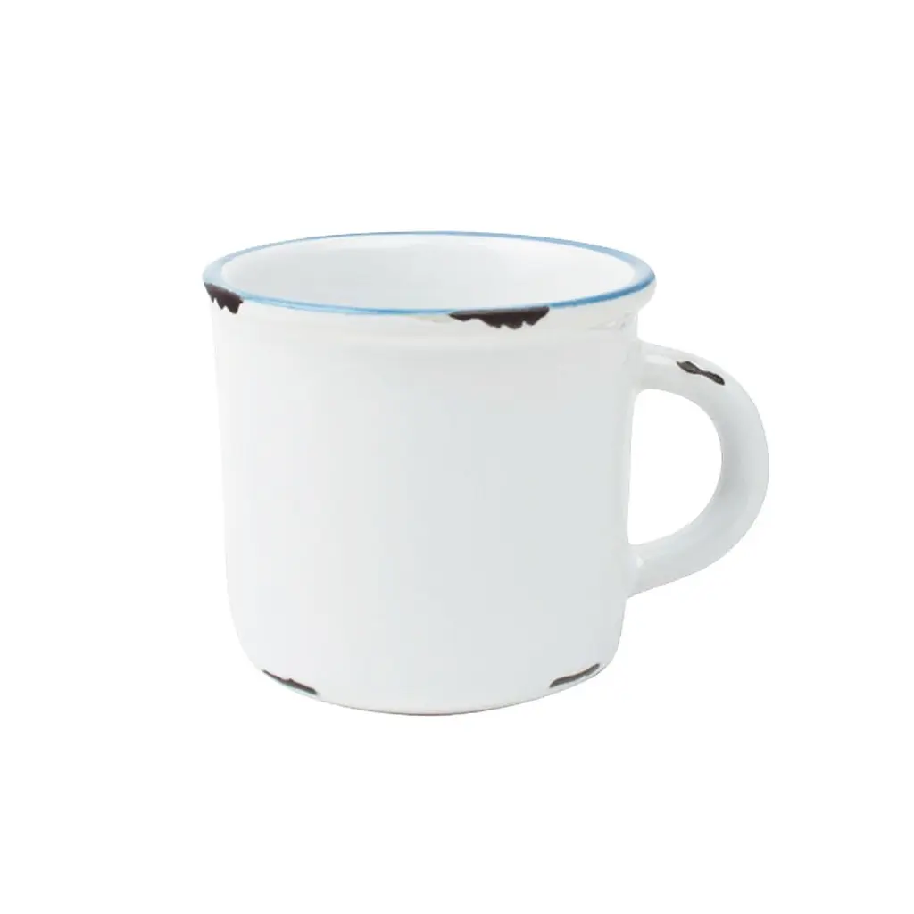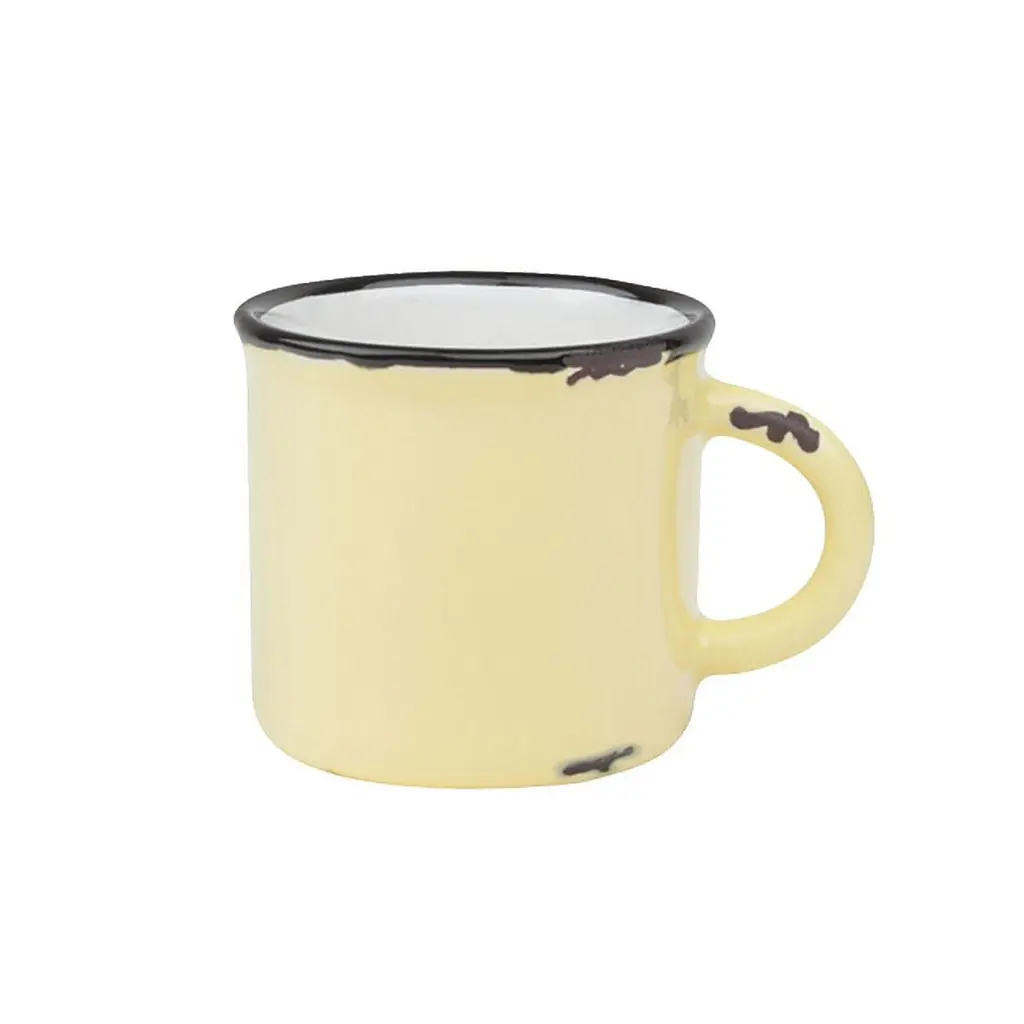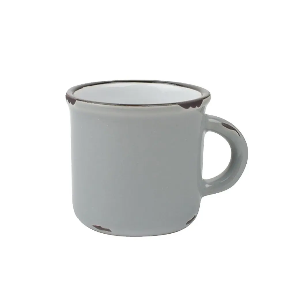 Mimicking vintage metal cookware, the Tinware collection is made of stoneware, complete with realistic distressed edges and a contrasting rim stripe. This collection is heavy duty and functional for the modern home. Glazed Stoneware. Set of 6 espresso cups includes 1 of each: White, Light Grey, Cashmere Blue, Pea Green, Yellow, Pink. Dishwasher & Microwave safe. 2.25"D x 2" H, 2oz capacity.