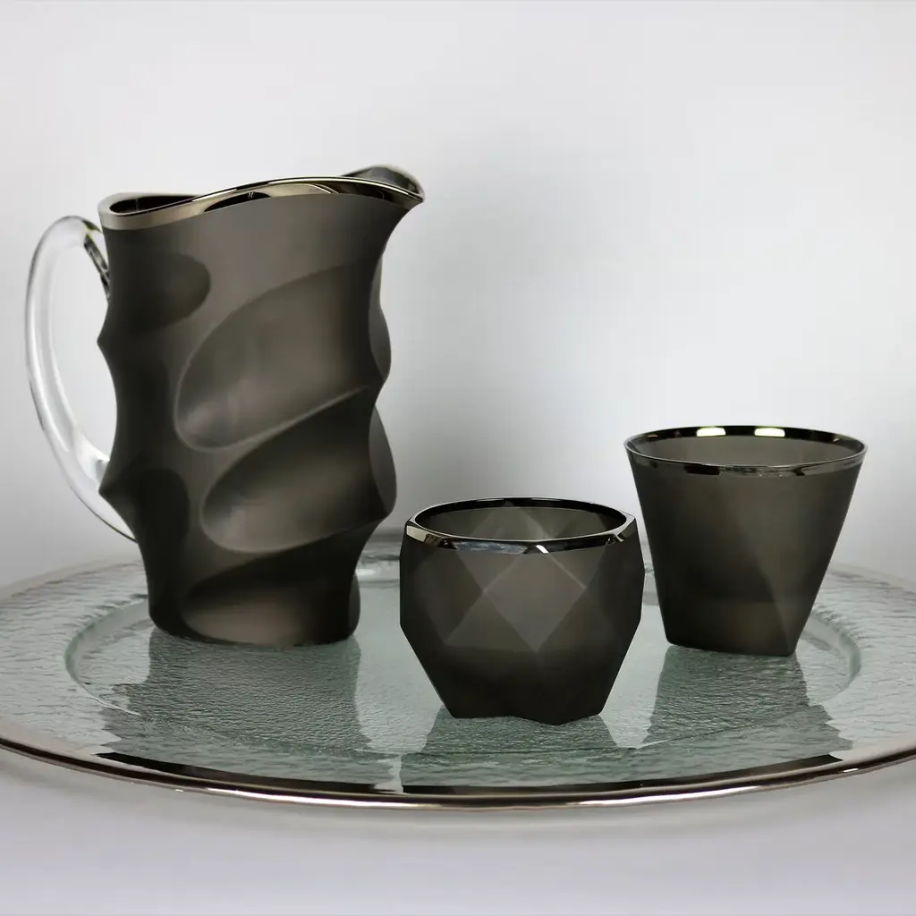 This magnificent piece of functional decor will bring a touch of luxurious elegance into any home. This pitcher features a satin finish and was hand painted with a smoke-grey color that complements the precious band in platinum adorning the top rim. Elegant, modern, and luxurious this object will make a statement either if used alone, or if combined with other pieces from the same collection.