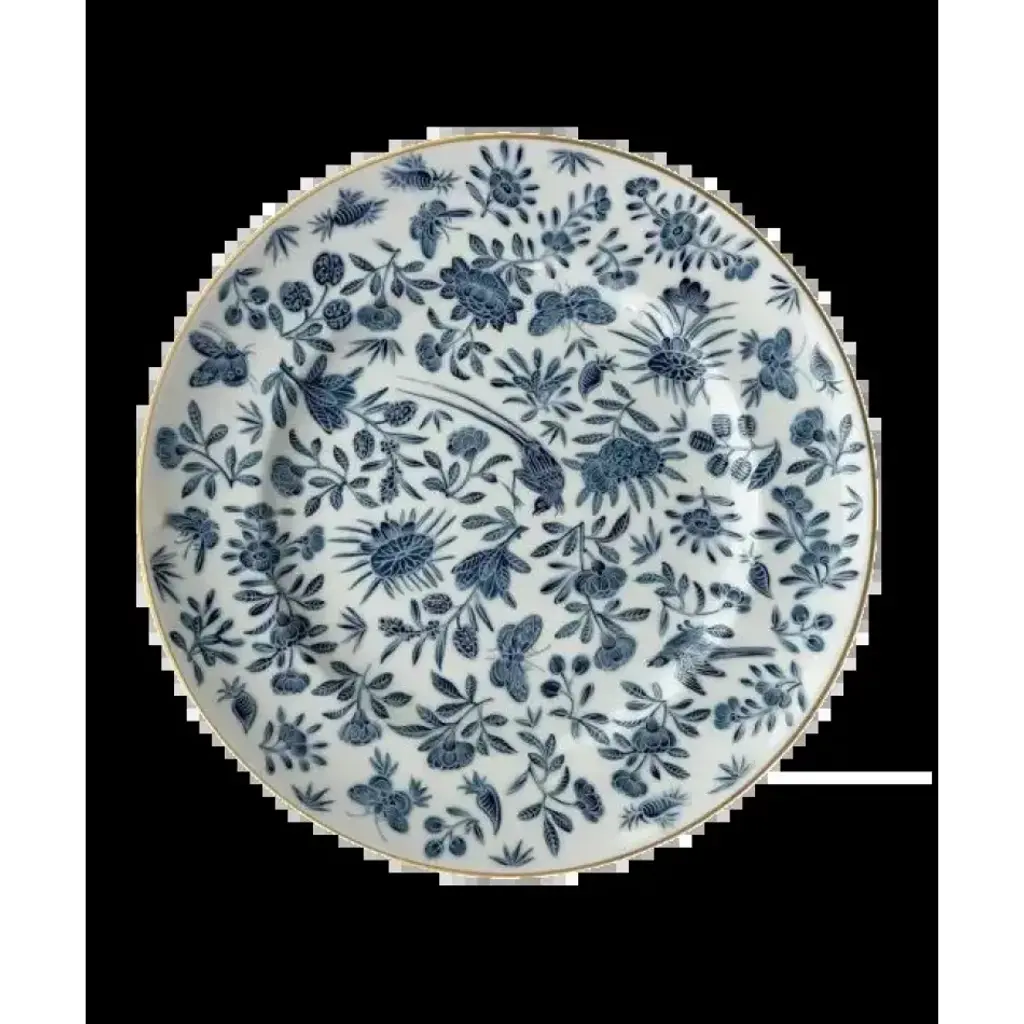The dinnerware is filled with birds and butterflies in an all over pattern, banded in gold. Licensed product of Historic Charleston. This newest colorway has not been seen before, but this adaptation expresses the same sophistication as the original The Sacred Butterfly in orange was a Chinese export pattern of about 1800 and was intended for those who admired the sophistication of placing traditional Chinese motifs of birds, butterflies and flowers on European shapes. The Chinese word for butterfly, tieh, is a pun that expresses the wish that the owner might live to a ripe age. These motifs were rendered with characteristic understatement in the traditional Chinese orange and gold colors in an all-over pattern. The marriage of shape and design was a success and was reproduced in English china of about 1800-1810. Our reproductions are based on originals in Historic Charleston. Dishwasher safe. A favorite with brides, Mottahedeh specializes in luxurious patterns and unique, elegant shapes that are reproduced from china found in museums and historical societies. The patterns feature complex and vibrant colors, and hand-painted gold decoration. The pieces are surprisingly fresh and timely, and look wonderful in both contemporary and traditional dining rooms.