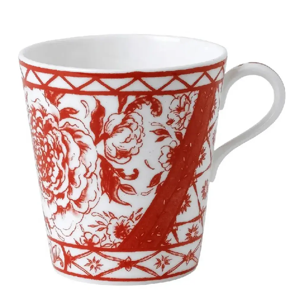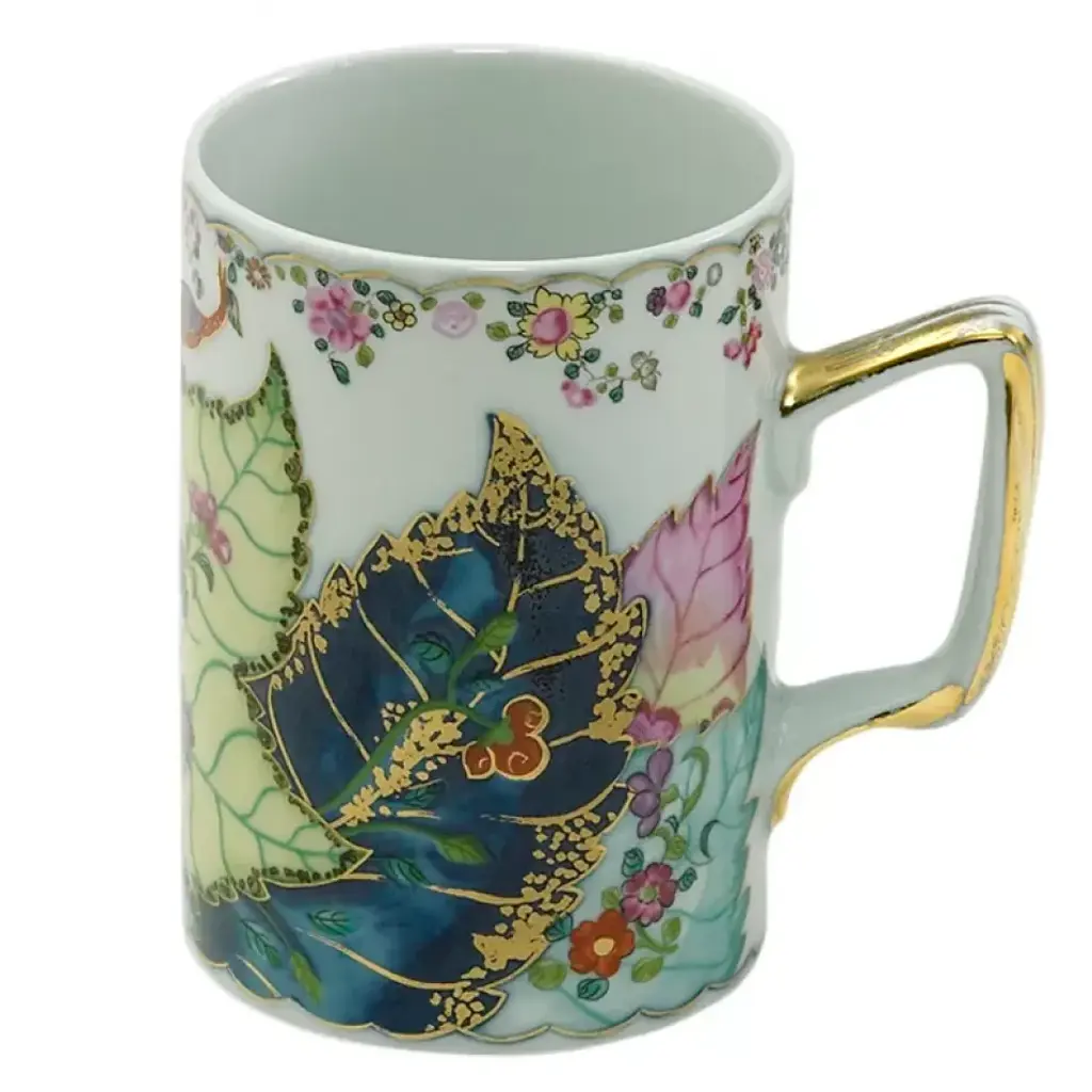 The tall graceful mug is an informal alternative to a teacup. A favorite with brides, Mottahedeh specializes in luxurious patterns and unique, elegant shapes that are reproduced from china found in museums and historical societies. The patterns feature complex and vibrant colors, and hand-painted gold decoration. The pieces are surprisingly fresh and timely, and look wonderful in both contemporary and traditional dining rooms.