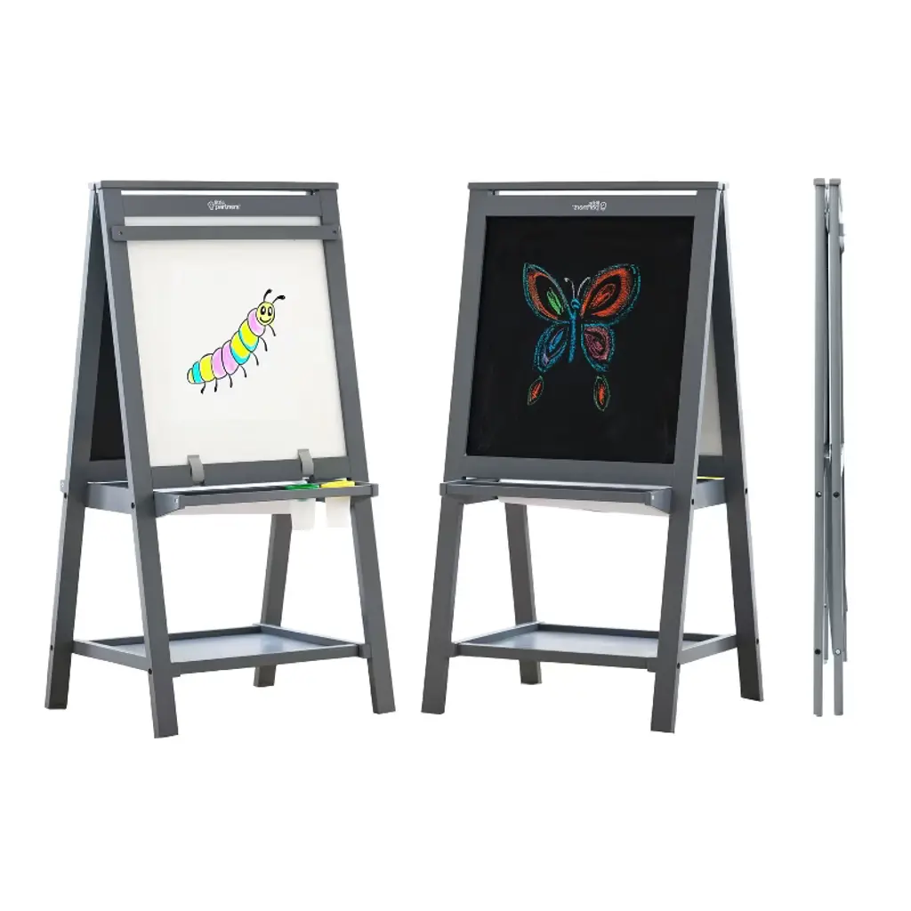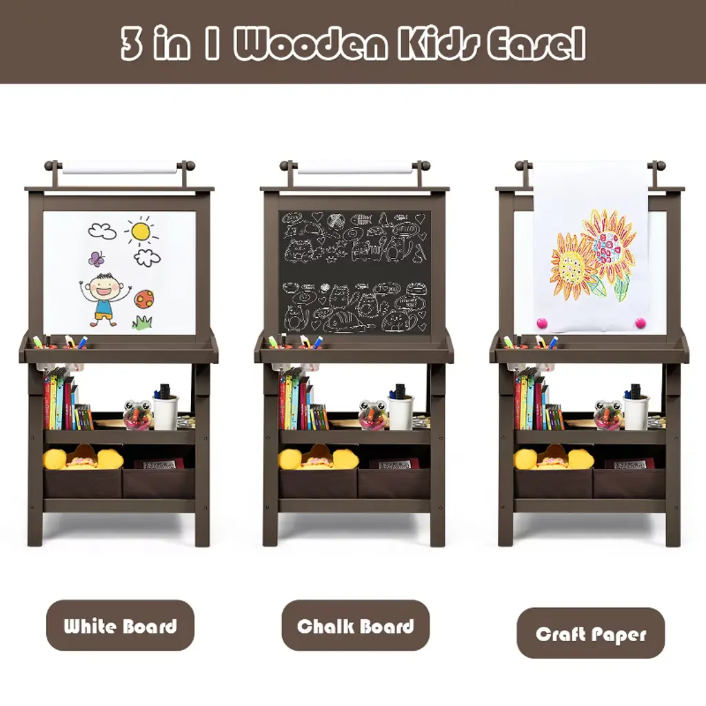 The top roll of paper on our easel provides more performance space for your artist. There are 2 pallets on both sides, which can place all kinds of art accessories for easy access. 2 levels of shelving and 2 storage bins provide ample space for organizing art supplies. More importantly, the rugged MDF material and stable triangular structure ensure safety for children to useColor: Coffee Material: MDF Product Size: 23.5" x 19.5" x 46" (L x W x H) Blackboard/Whiteboard Size: 18.5" x 15" (L x W) Net Weight: 22 lbs Package Includes: 1 x Kids Easel 2 x Magnetic Beads 2 x Pigment Cup 1 x Drawing Paper 2 x Storage Bin 1 x User Guide