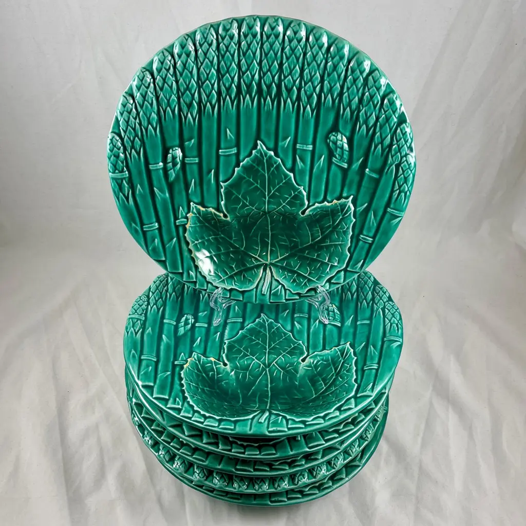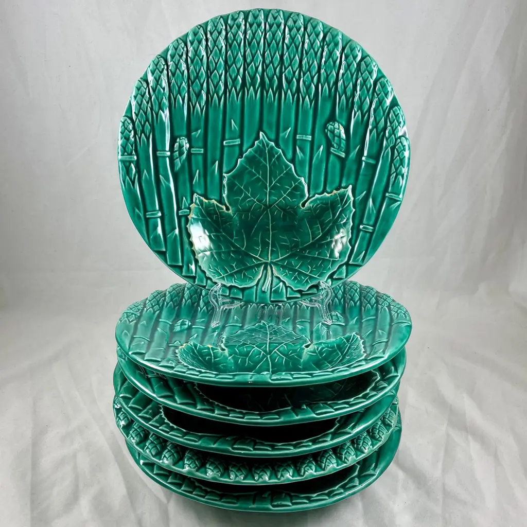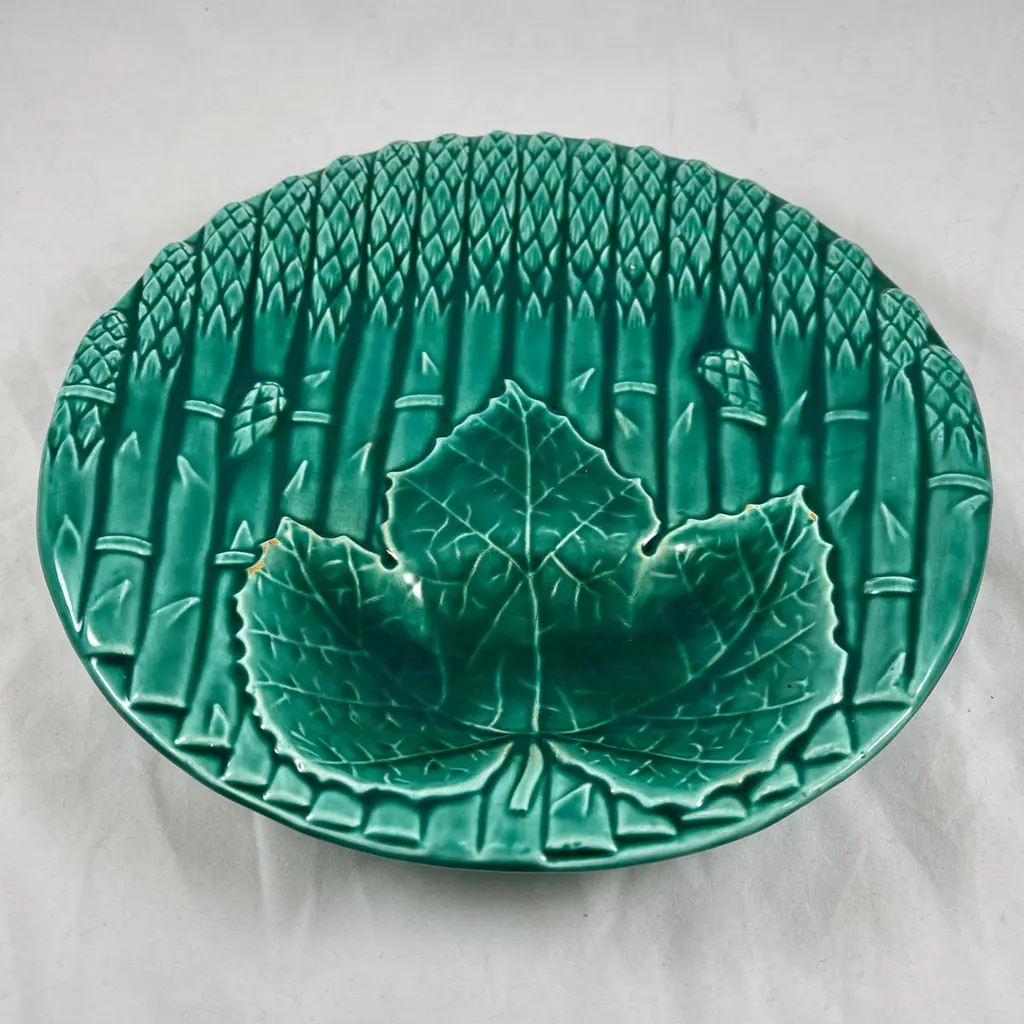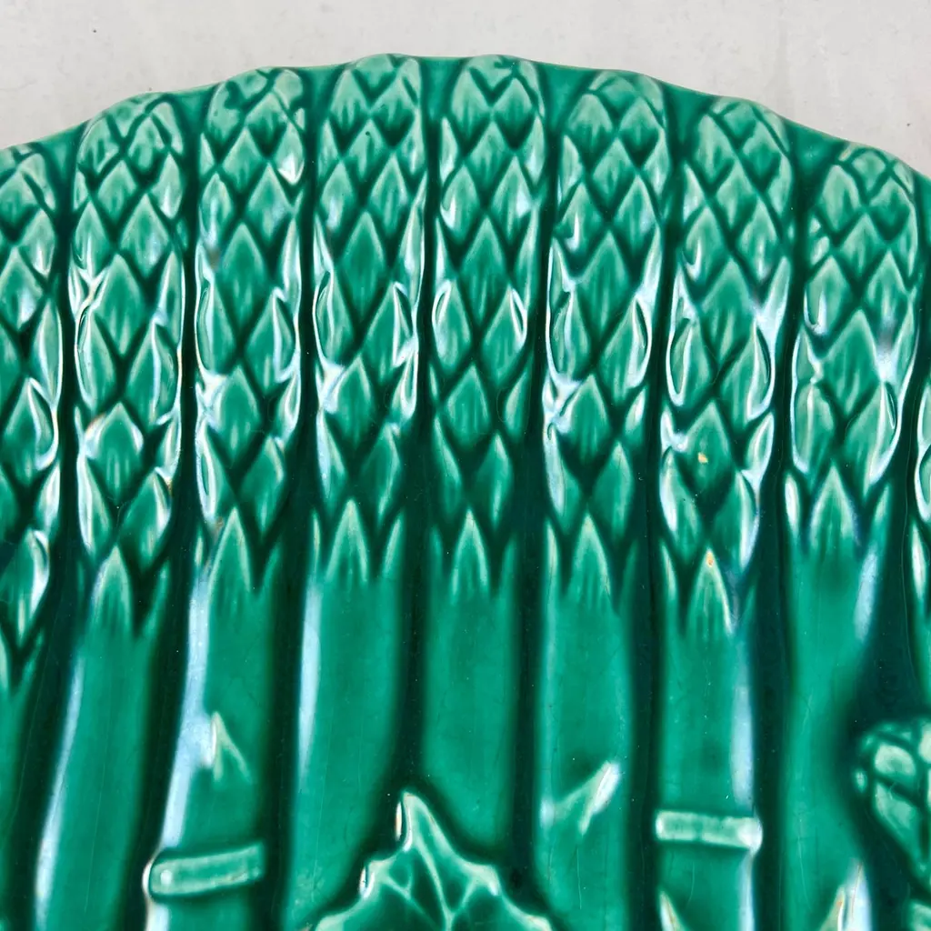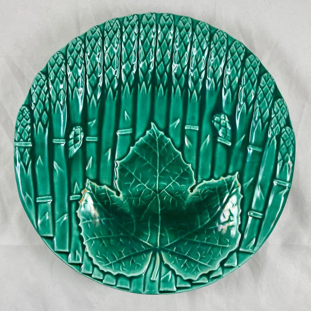A French faïence Asparagus plate with a leaf shaped dipping well for sauce, from Saint Amand et Hamage, circa 1930s.Glazed in the Orchies region signature green, the plate is modeled on a group of asparagus, tied and lying side by side. A deep sauce well is shaped as a large leaf. The plate sits on a raised rear footing.Saint-Amand-les-Eaux is in northern France. Pottery from this region was been produced under the names, Faïence et Porcelaine St. Amand-Orchies-Hamage or Manufacture de Faïence Moulin des Loups-Hamage. The Saint-Amand factories closed their doors in the early 1950s.A master server in this pattern is available for creating a service, offered separately.10.5 in. Diameter x 1.5 in. HMultiple plates are available, all in good condition. All plates show some glaze loss to the high points of the sauce well. One plate has a loss to the rear footing not affecting the seating.Beautiful color.