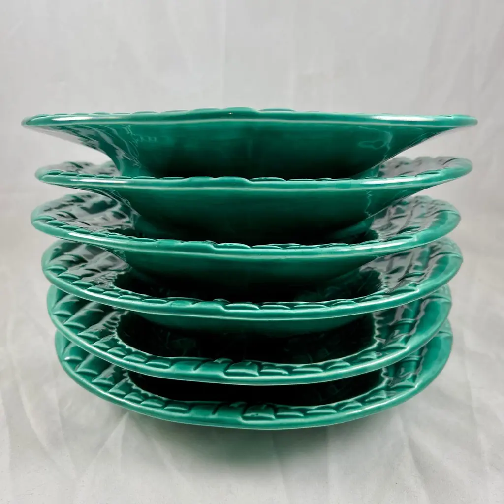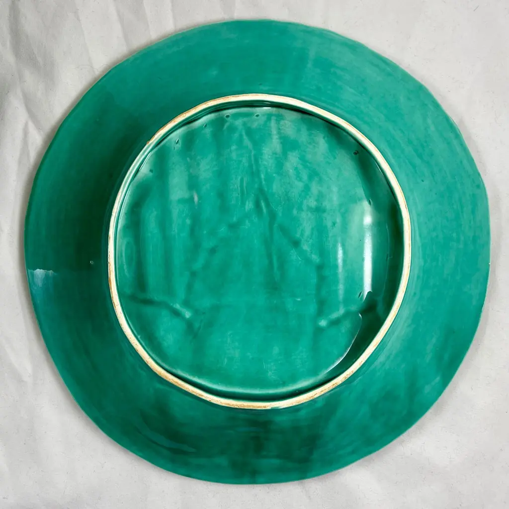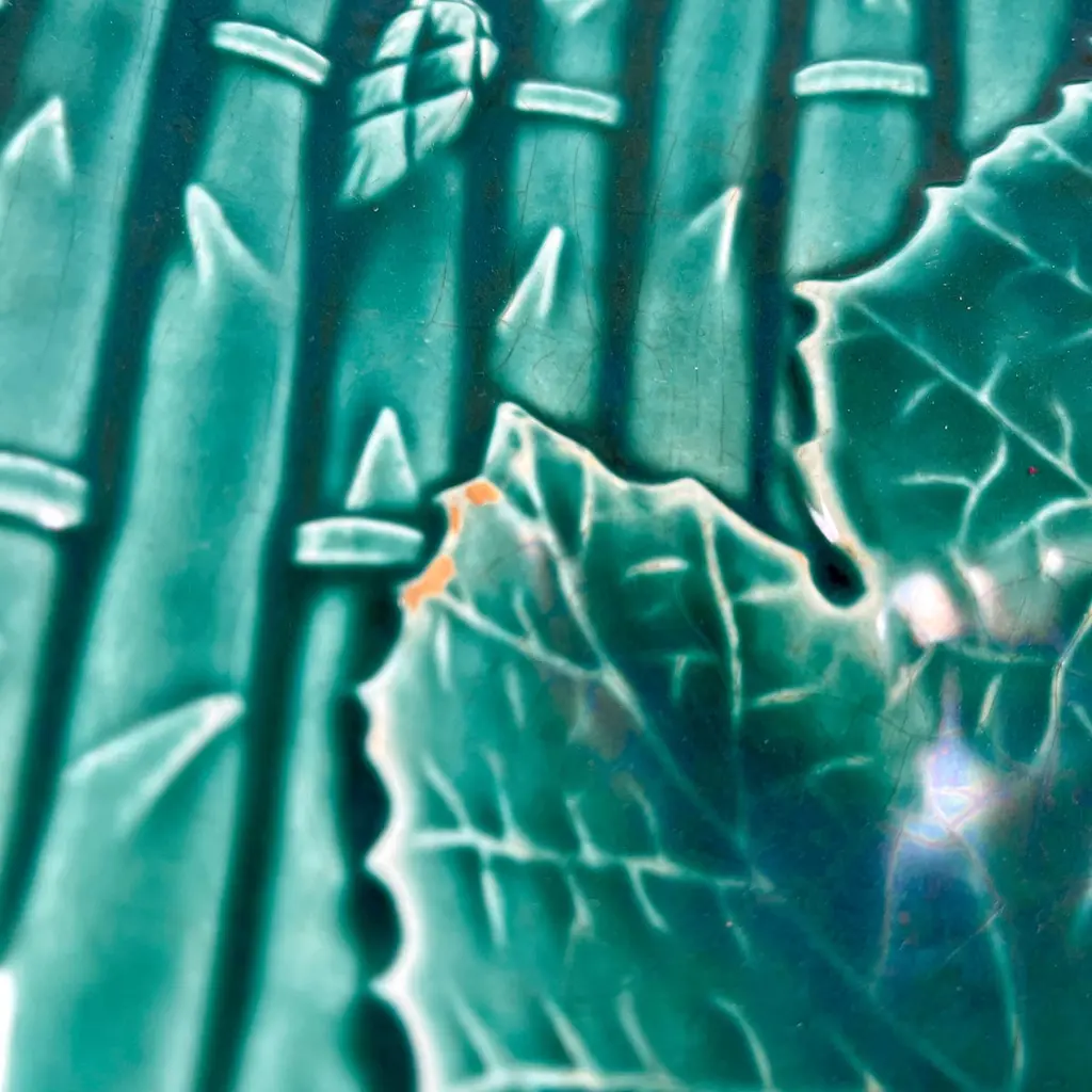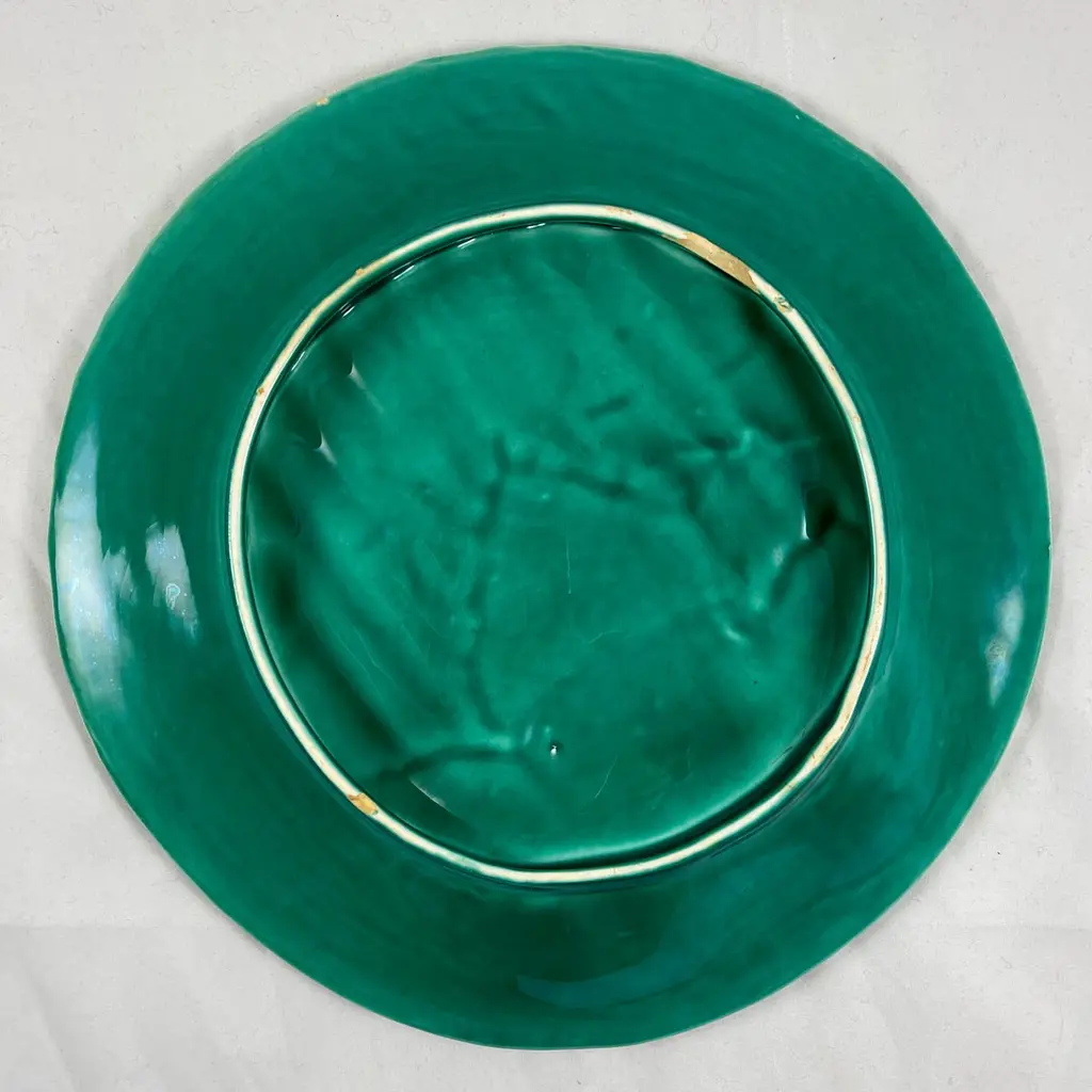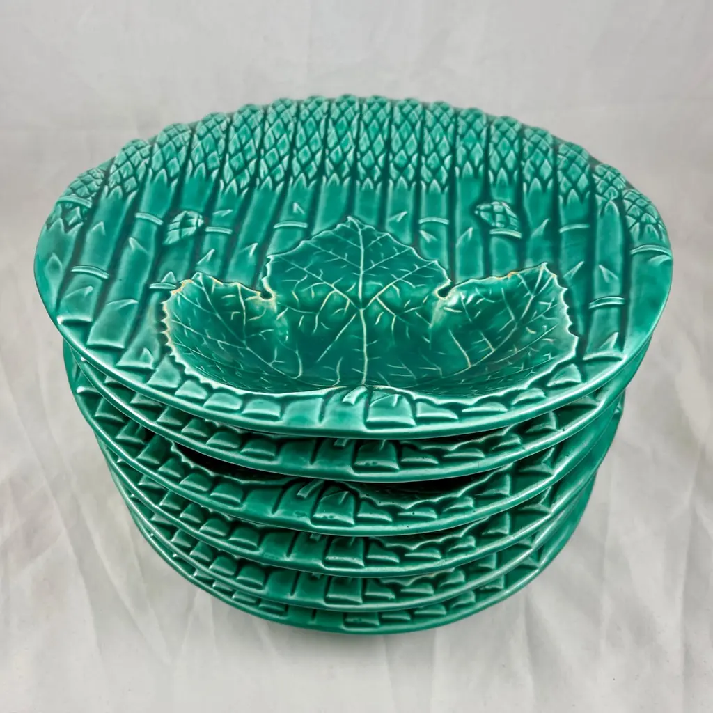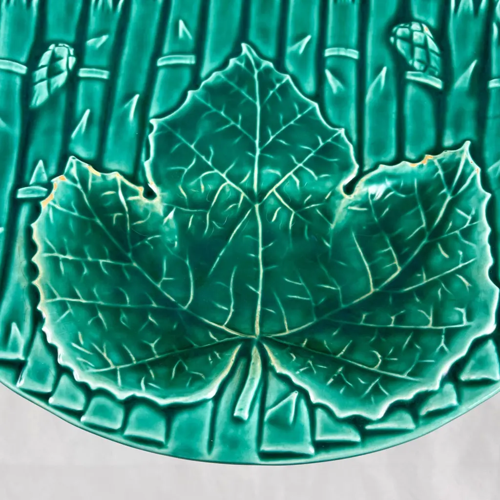 A French faïence Asparagus plate with a leaf shaped dipping well for sauce, from Saint Amand et Hamage, circa 1930s.Glazed in the Orchies region signature green, the plate is modeled on a group of asparagus, tied and lying side by side. A deep sauce well is shaped as a large leaf. The plate sits on a raised rear footing.Saint-Amand-les-Eaux is in northern France. Pottery from this region was been produced under the names, Faïence et Porcelaine St. Amand-Orchies-Hamage or Manufacture de Faïence Moulin des Loups-Hamage. The Saint-Amand factories closed their doors in the early 1950s.A master server in this pattern is available for creating a service, offered separately.10.5 in. Diameter x 1.5 in. HMultiple plates are available, all in good condition. All plates show some glaze loss to the high points of the sauce well. One plate has a loss to the rear footing not affecting the seating.Beautiful color.