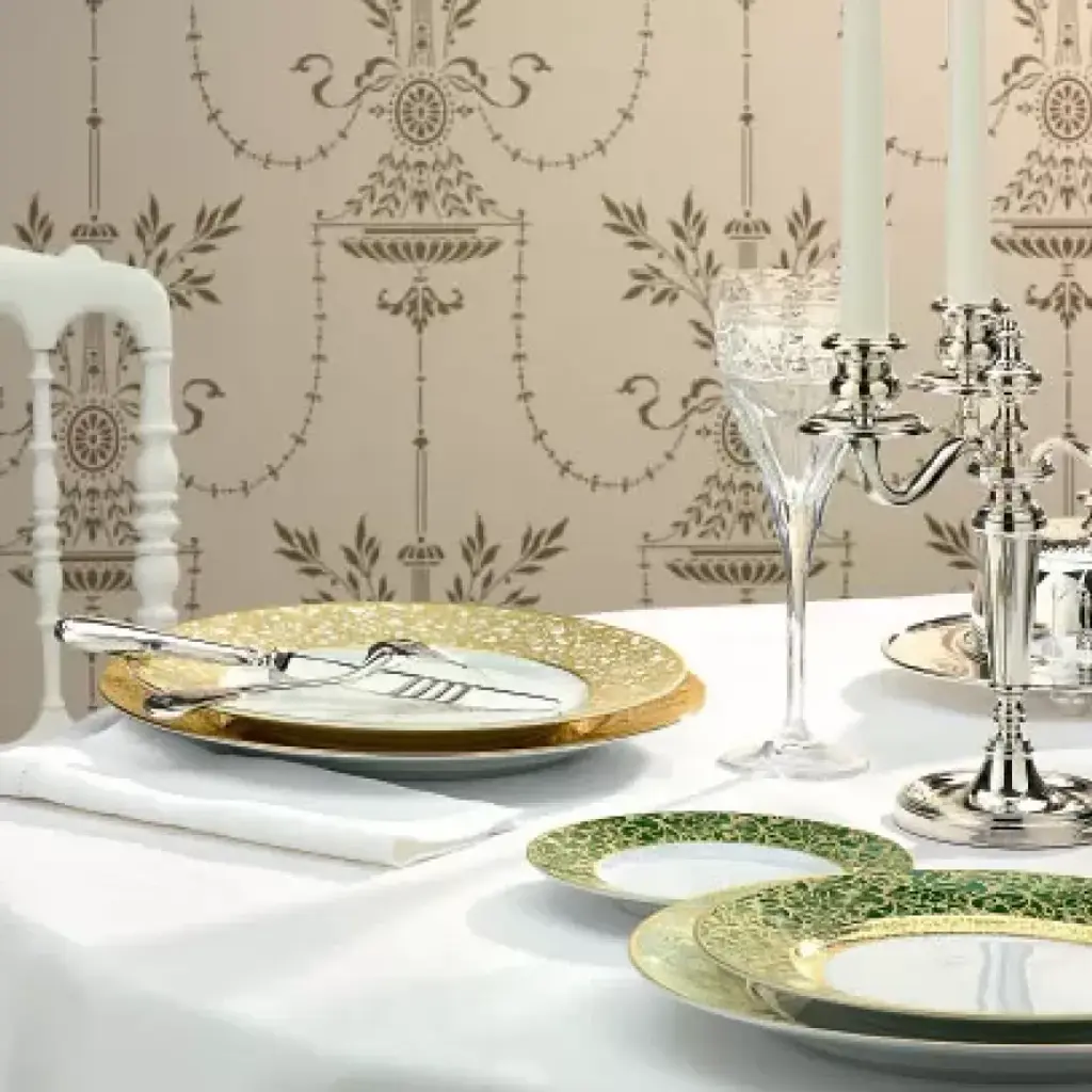 Our Salamanque dinnerware will bring a touch of romance to the table. The ornate pattern of vines calls to mind the Art Nouveau architecture of Salamanca, Spain. Each piece is crafted from Limoges porcelain and finished with gold or platinum trim. Also available by special order in the following colors: Gold/Green, Gold/Rouge, Gold/Turquoise, Gold/Ivory, Gold/Black. Five-piece place setting includes dinner plate, salad plate, bread/butter plate, teacup, and saucer. Raynaud was established in 1849 and is the only survivor of 11 porcelain factories existing in Limoges, France. After years of research, Raynaud discovered techniques to create infinite combinations of fade-resistant decorations that is still used by porcelain makers. Boasting a client list of numerous presidents to Princess Diana, Raynaud has been the synonym of quality, known and recognized on every continent.