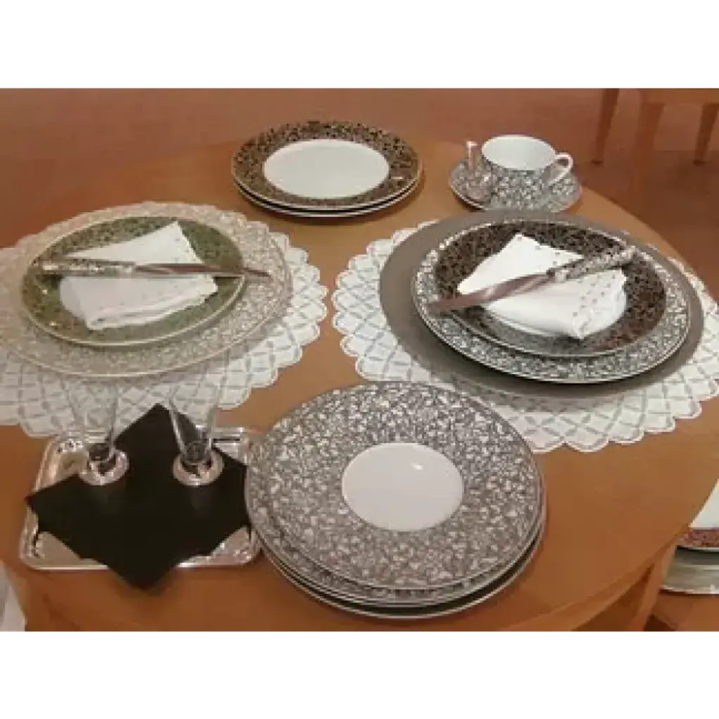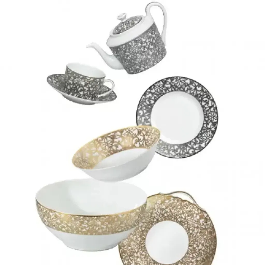 Our Salamanque dinnerware will bring a touch of romance to the table. The ornate pattern of vines calls to mind the Art Nouveau architecture of Salamanca, Spain. Each piece is crafted from Limoges porcelain and finished with gold or platinum trim. Also available by special order in the following colors: Gold/Green, Gold/Rouge, Gold/Turquoise, Gold/Ivory, Gold/Black. Five-piece place setting includes dinner plate, salad plate, bread/butter plate, teacup, and saucer. Raynaud was established in 1849 and is the only survivor of 11 porcelain factories existing in Limoges, France. After years of research, Raynaud discovered techniques to create infinite combinations of fade-resistant decorations that is still used by porcelain makers. Boasting a client list of numerous presidents to Princess Diana, Raynaud has been the synonym of quality, known and recognized on every continent.