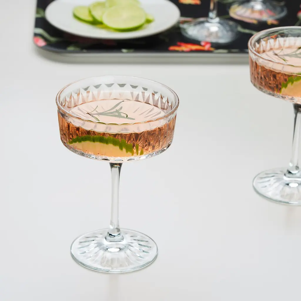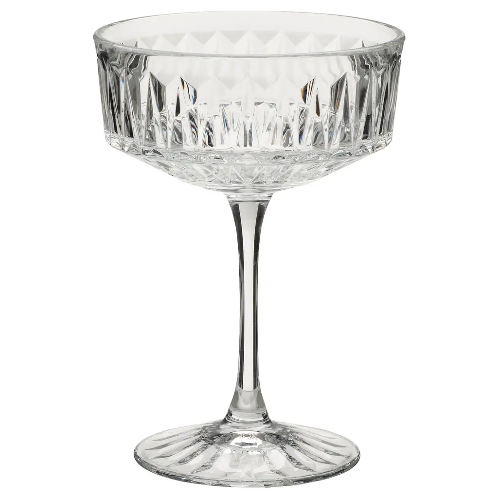 SÄLLSKAPLIG Champagne coupe - clear glass/patterned 7 oz. Perfect for champagne and sparkling drinks, but also for cocktails and other beverages. Just as suitable for festive occasions like birthdays and weddings as for buffets and everyday use at home with family.