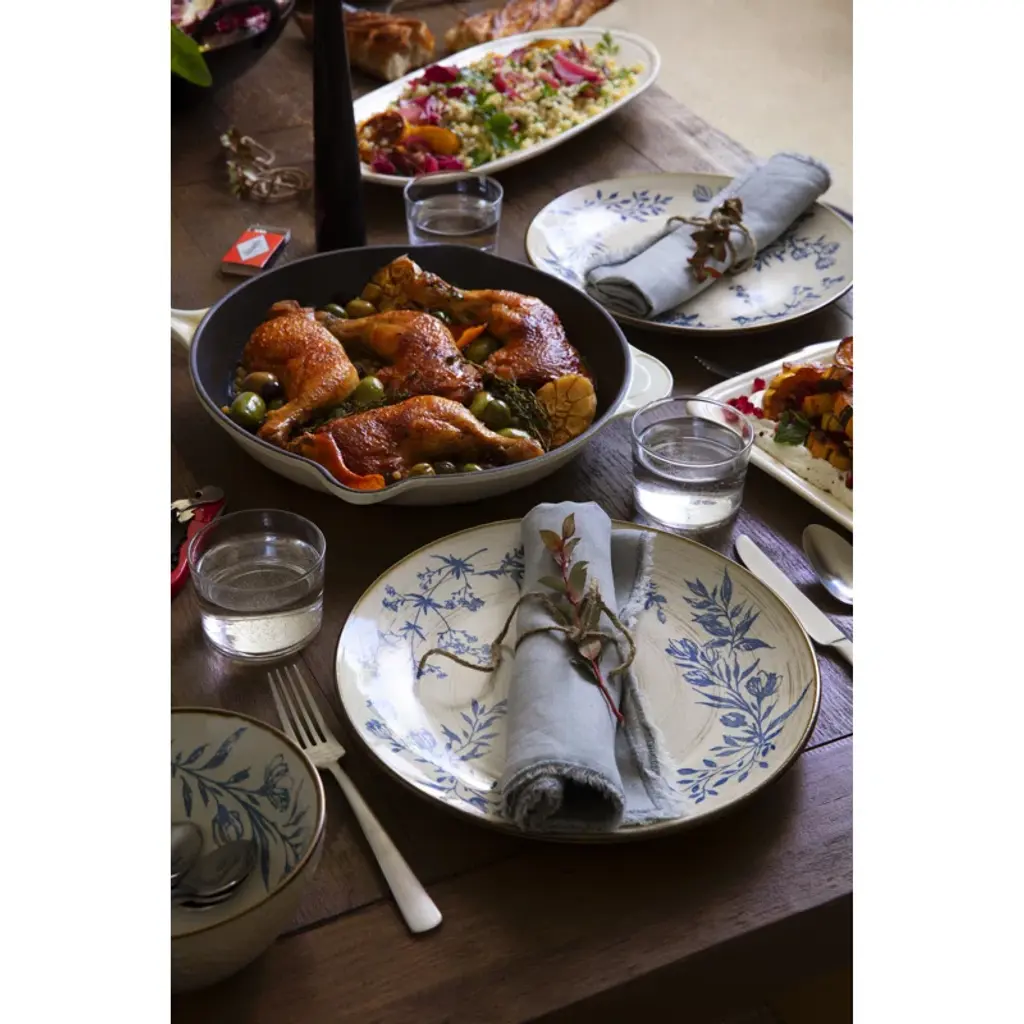 Classic style meets handcrafted design with this Pfaltzgraff 12-piece Salma dinnerware set. Durable, gray antiqued stoneware pieces with a striking swirl design are adorned with a blue floral pad print pattern and framed with metallic rims that make these place settings pop on your tabletop. The reactive glaze finish gives each piece a unique look and distinct coloring. 12-piece set, service for 4, includes 4 each of 10-1/2 inch dinner plates; 2-1/2 inch tall 32-ounce pasta bowl with an 8-inch diameter; and 3-inch tall 25-ounce all-purpose bowl with a 6-inch diameter.