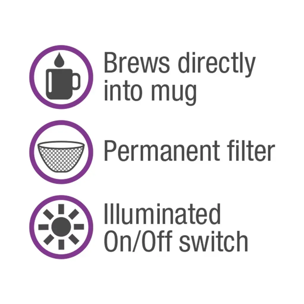 Enjoy a delicious cup of coffee, tea or hot chocolate wherever you are! The beauty of this machine is that you can brew your favorite hot beverage from the convenience of your home, dorm, or office. Have a favorite mug you use every day? No need to worry, the Space Saving 1 Cup Coffee Maker fits a variety of mug sizes. Equipped with a permanent nylon coffee filter there is no more hassle with paper filters. Never leave the comfort of your desk to indulge your break-time fix.