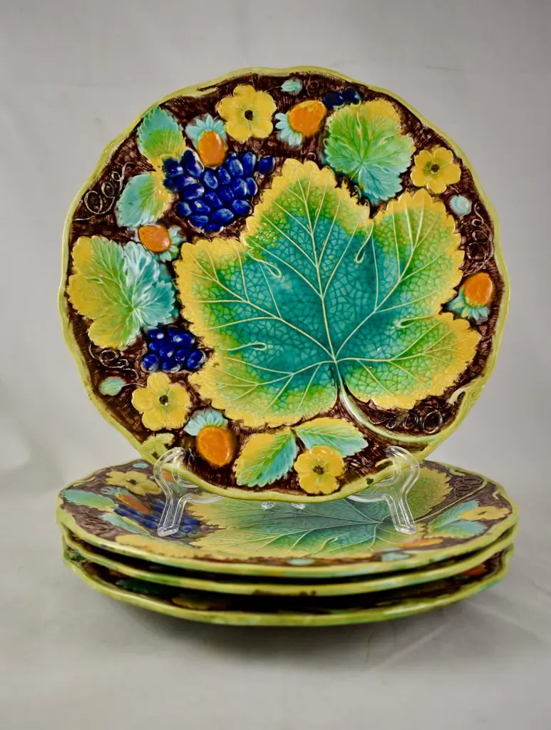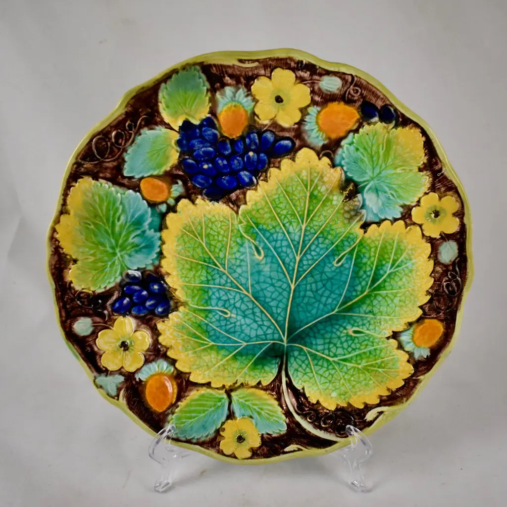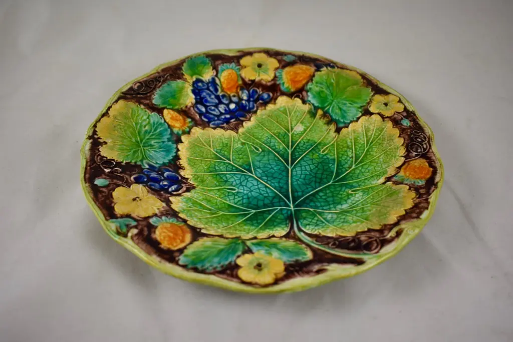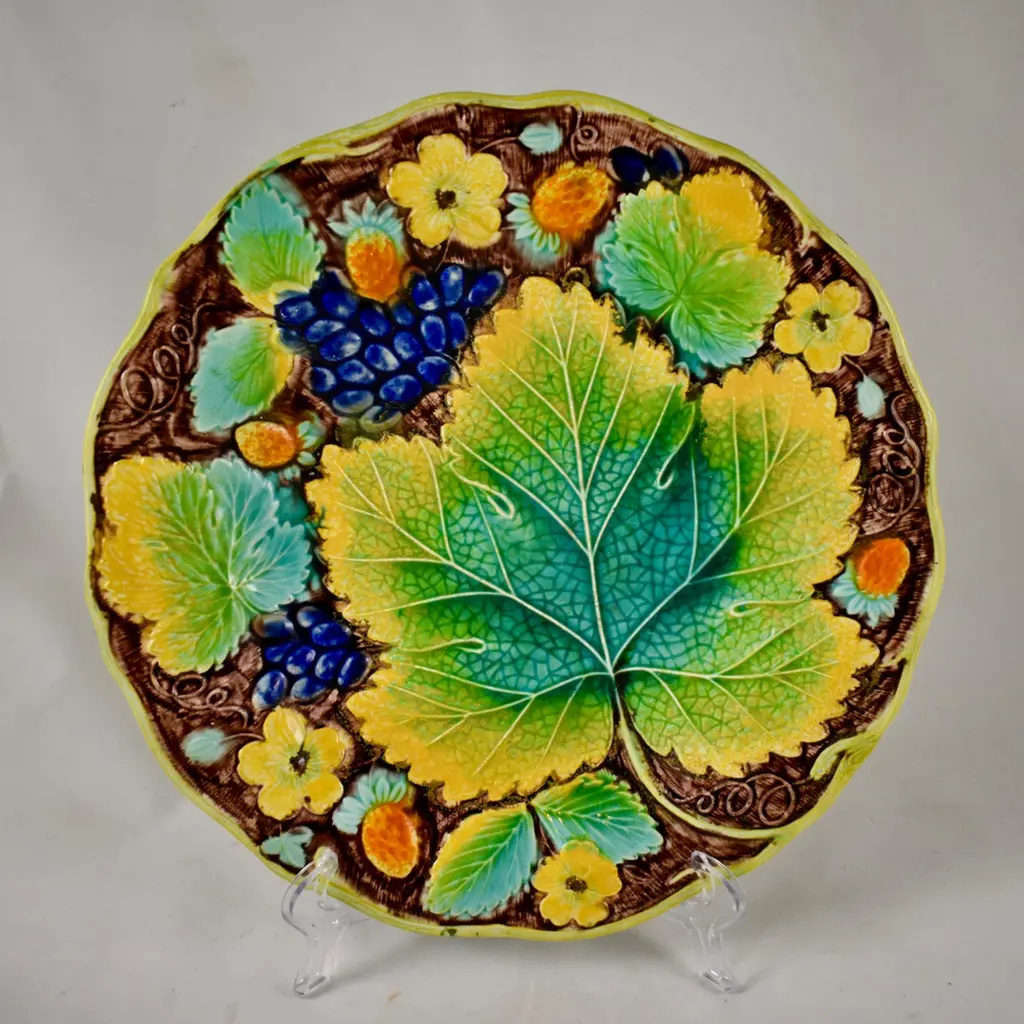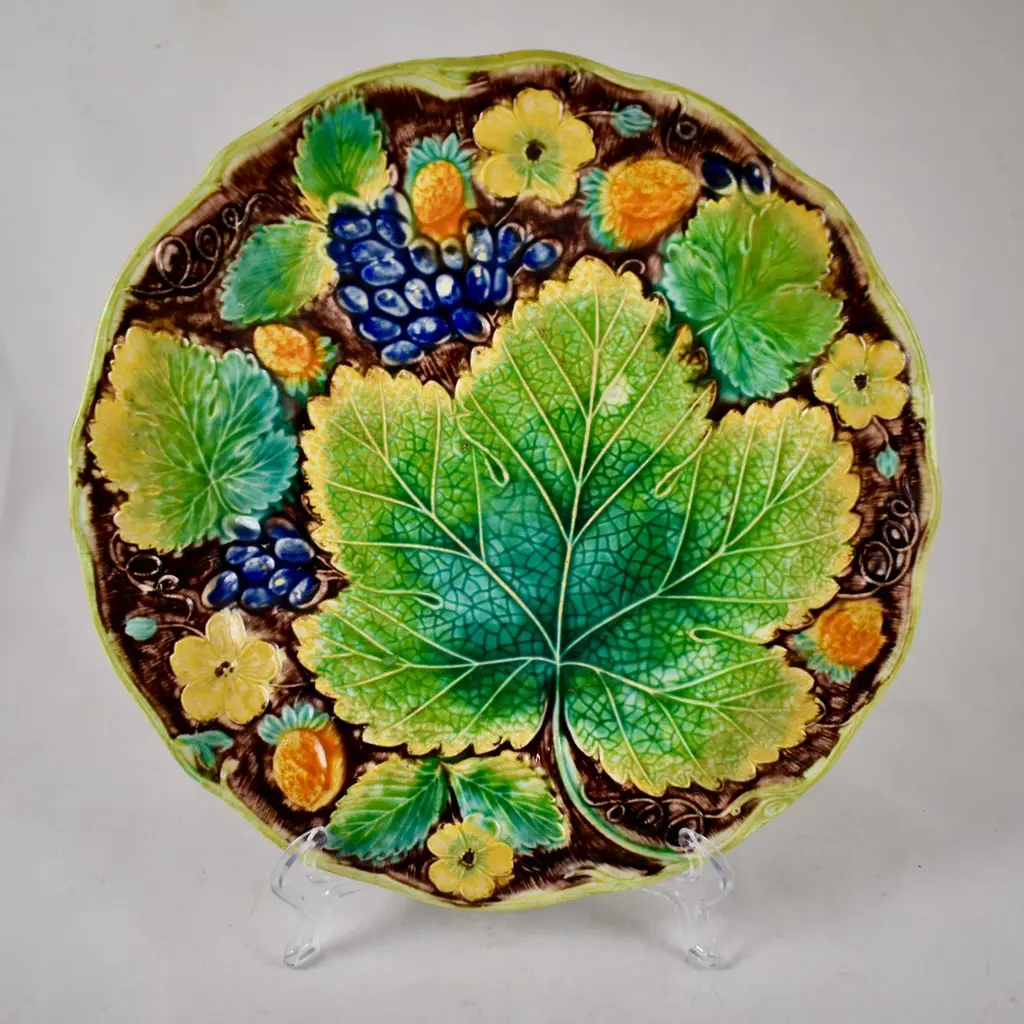 A strawberry and grape leaf plate, from Samuel Alcock & Co, Burslem, Staffordshire, England, circa 1850.A central grape leaf is shown with a vine border, along with purple bunches of grapes and the berries and blossoms of the strawberry plant. The bold color and glazing technique is distinctive to Alcock majolica pottery. The mottled turquoise blue, green and brown glazing to the verso is also a hallmark of Alcock. These plates have very bold coloring and are considered scarce.Measures: 9.0 in. diameter x 1.0 in. height.Marked with the Beehive, SA & Co.Multiple plates are available, each showing losses to the rear footings. The plates sit soundly without wobbling. One plate has a small rim bite, not seen on the front.