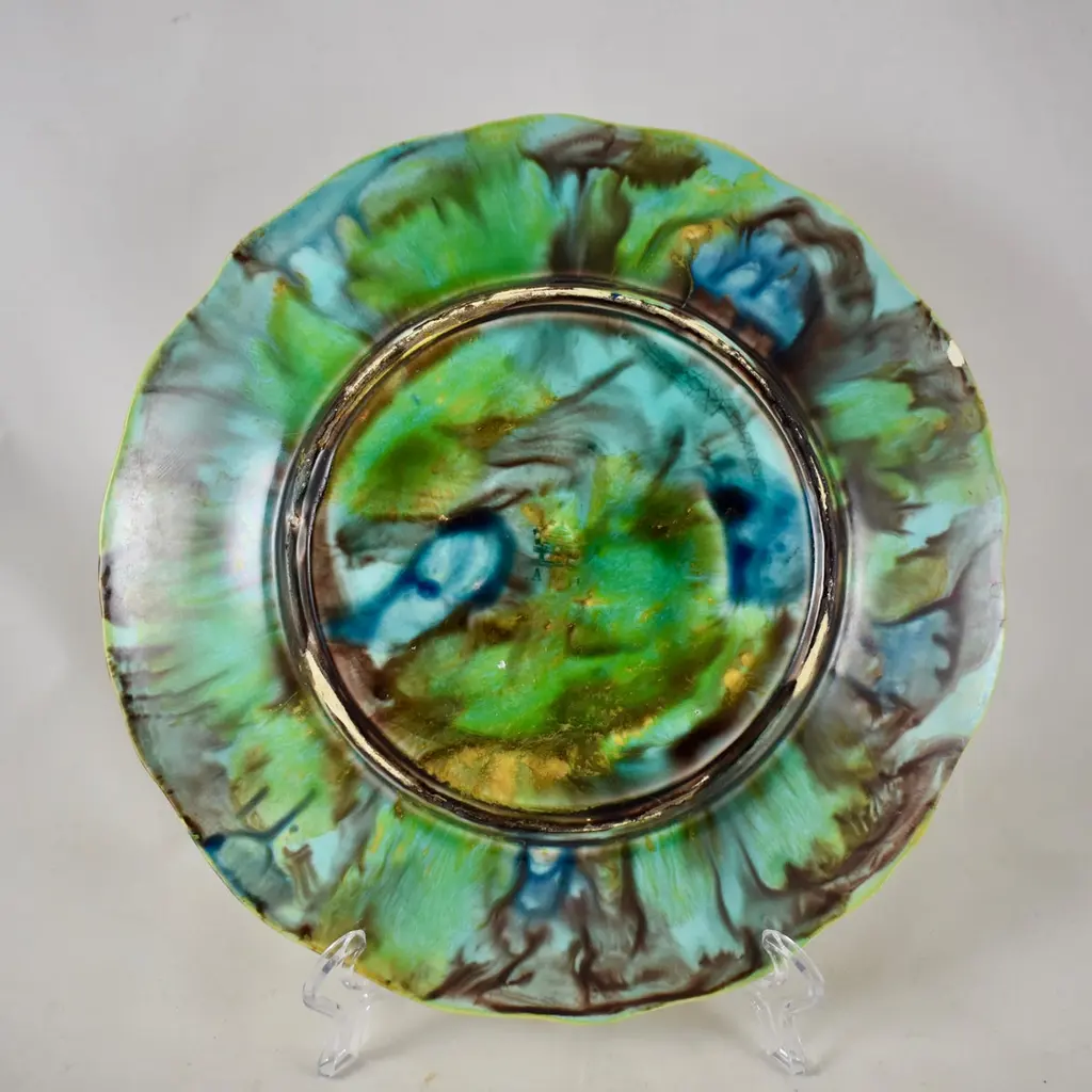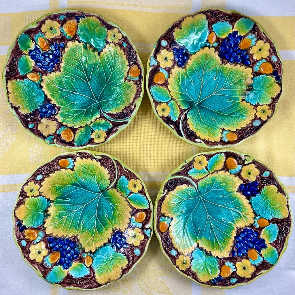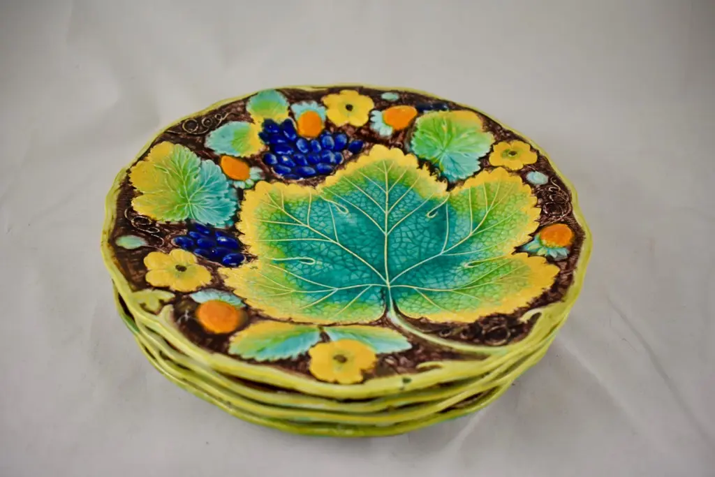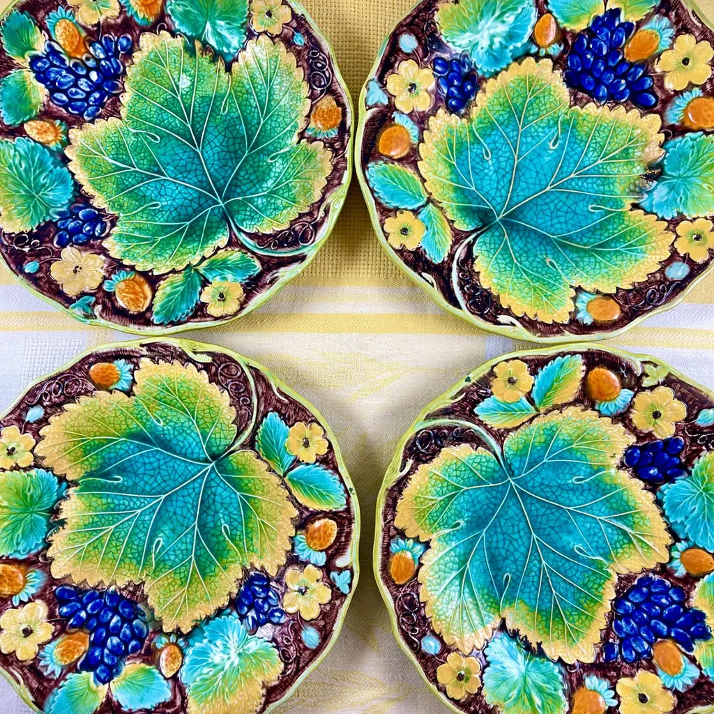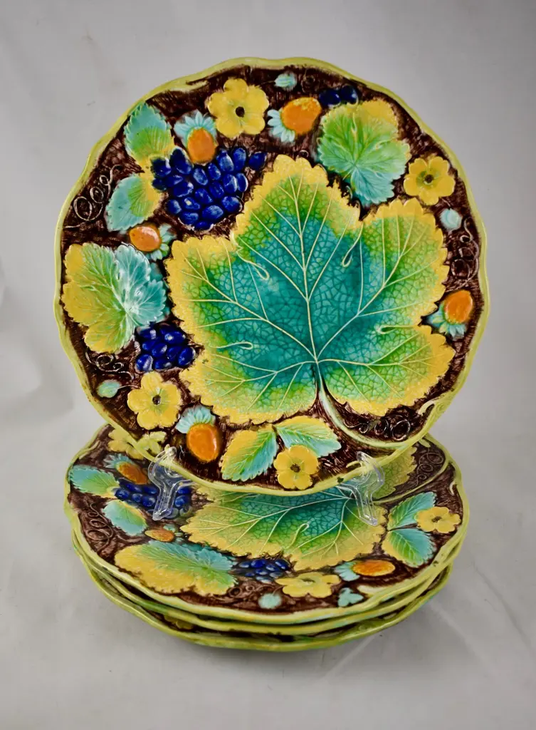 A strawberry and grape leaf plate, from Samuel Alcock & Co, Burslem, Staffordshire, England, circa 1850.A central grape leaf is shown with a vine border, along with purple bunches of grapes and the berries and blossoms of the strawberry plant. The bold color and glazing technique is distinctive to Alcock majolica pottery. The mottled turquoise blue, green and brown glazing to the verso is also a hallmark of Alcock. These plates have very bold coloring and are considered scarce.Measures: 9.0 in. diameter x 1.0 in. height.Marked with the Beehive, SA & Co.Multiple plates are available, each showing losses to the rear footings. The plates sit soundly without wobbling. One plate has a small rim bite, not seen on the front.